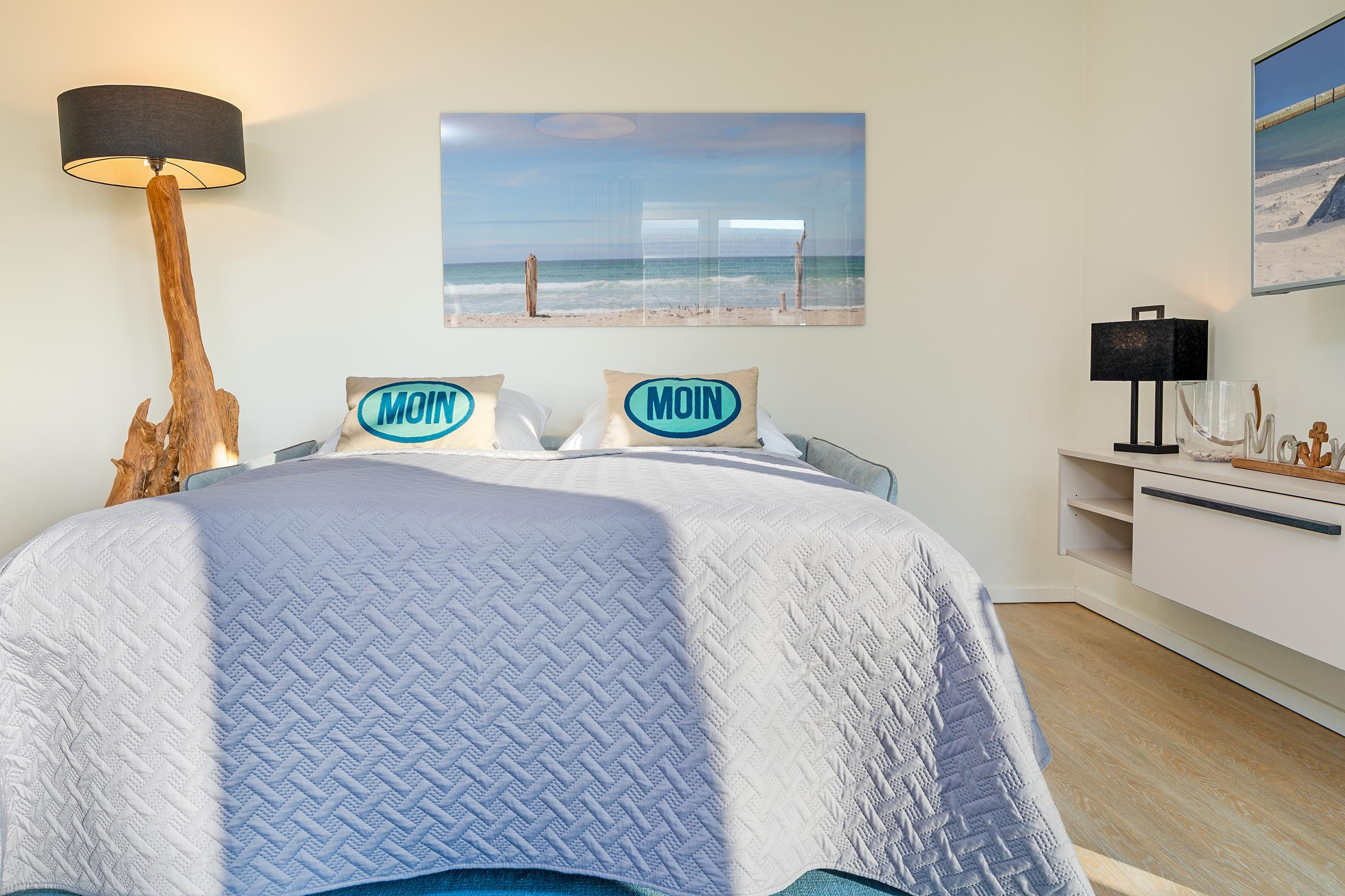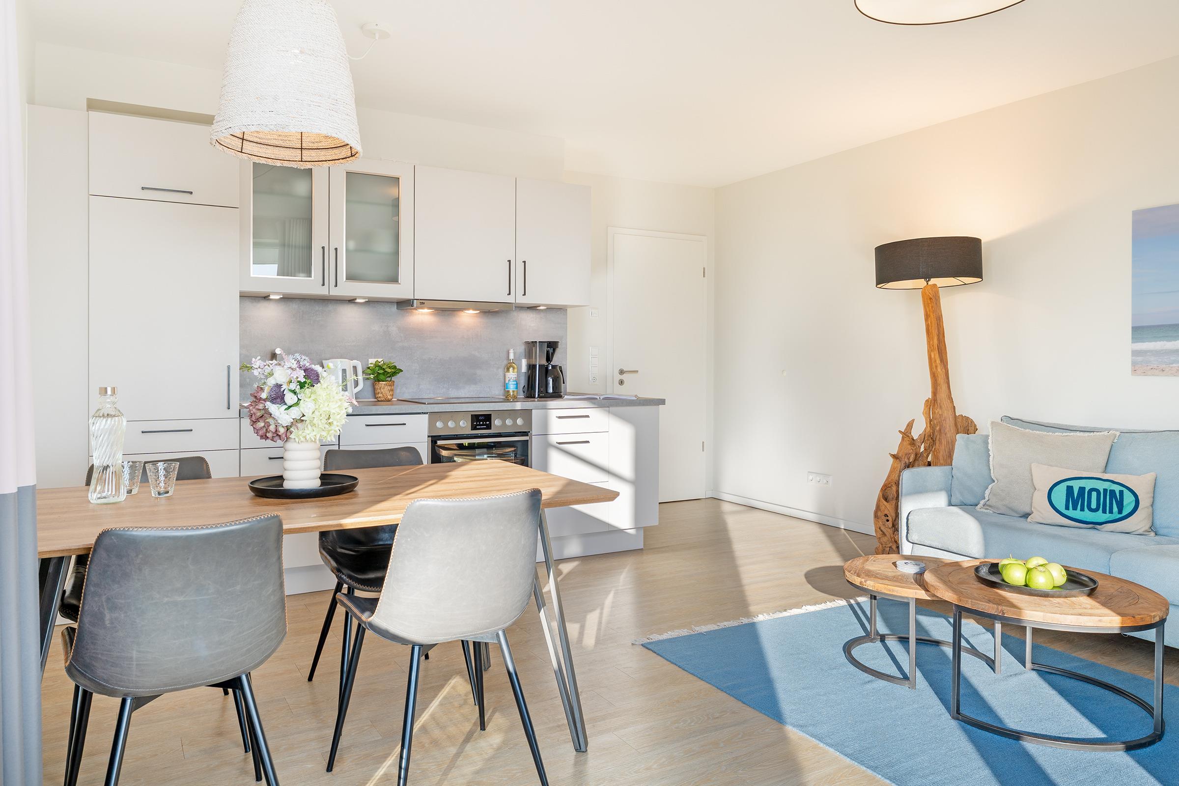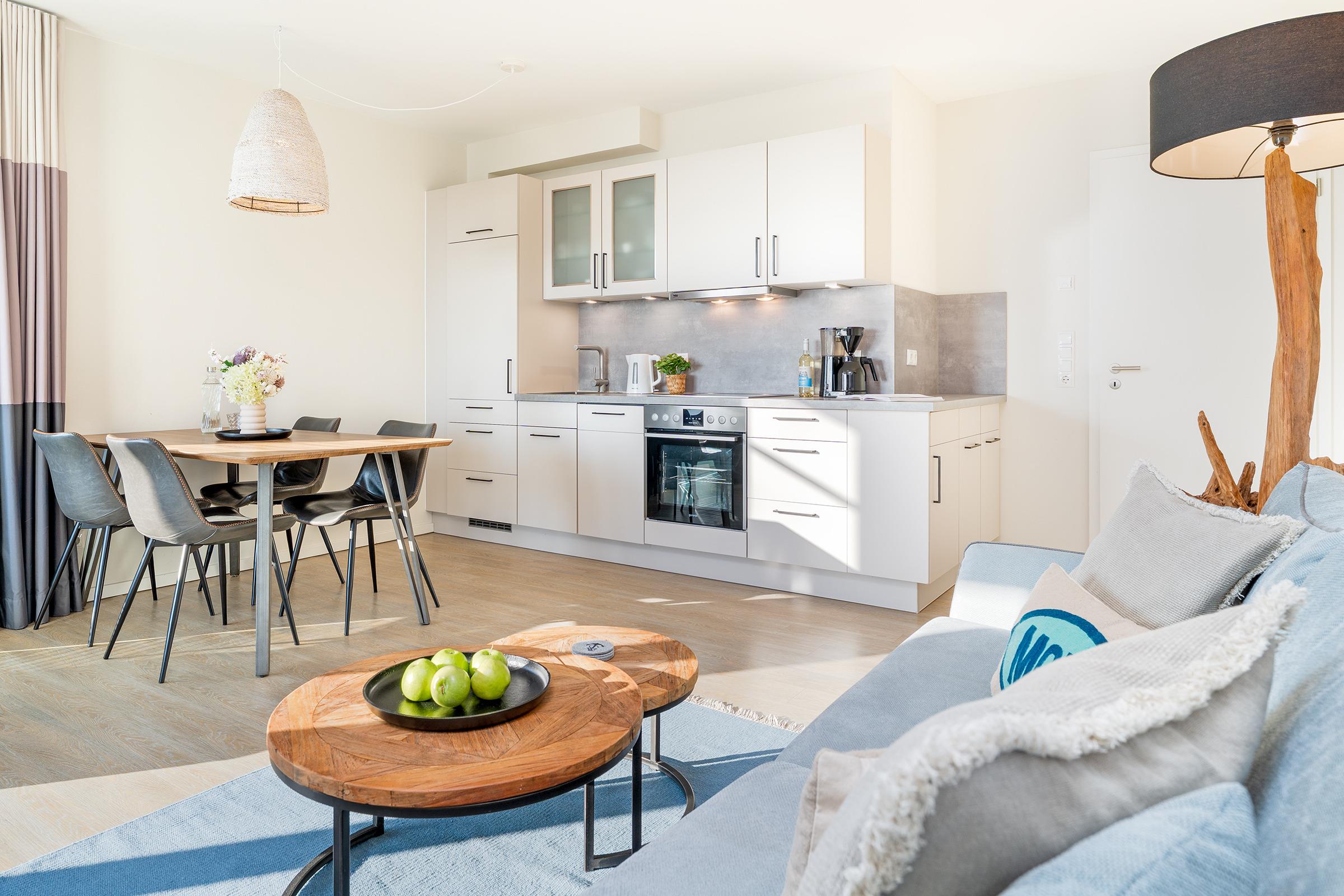 Neben einem großzügigen und lichtdurchfluteten Wohnbereich mit Schlafsofa (160x200 cm) verfügt die Wohnung über ein separates Schlafzimmer mit einem komfortablen Boxspringbett (180x200 cm). Hier finden Sie ausreichend Platz für Ruhe und Erholung. Die voll ausgestattete Küche bietet alles, was Hobbykoch-Herzen höher schlagen lässt. Bereiten Sie problemlos Ihre Mahlzeiten zu und genießen Sie gesellige Kochabende mit Freunden und Familie. Am Esstisch mit ausreichend Platz können Sie dann gemeinsam essen. Für Unterhaltung ist mit einem großen Flat-TV und kostenlosem WLAN-Anschluss ebenfalls gesorgt. Starten Sie Ihren Tag auf dem charmant angelegten Balkon mit einem heißen Kaffee und lassen Sie sich von dem (saisonal) wunderbaren Blick auf die Ostsee verzaubern. Für die tägliche Körperhygiene steht Ihnen ein modernes Badezimmer mit bodentiefer Dusche und Waschmaschine zur Verfügung.
