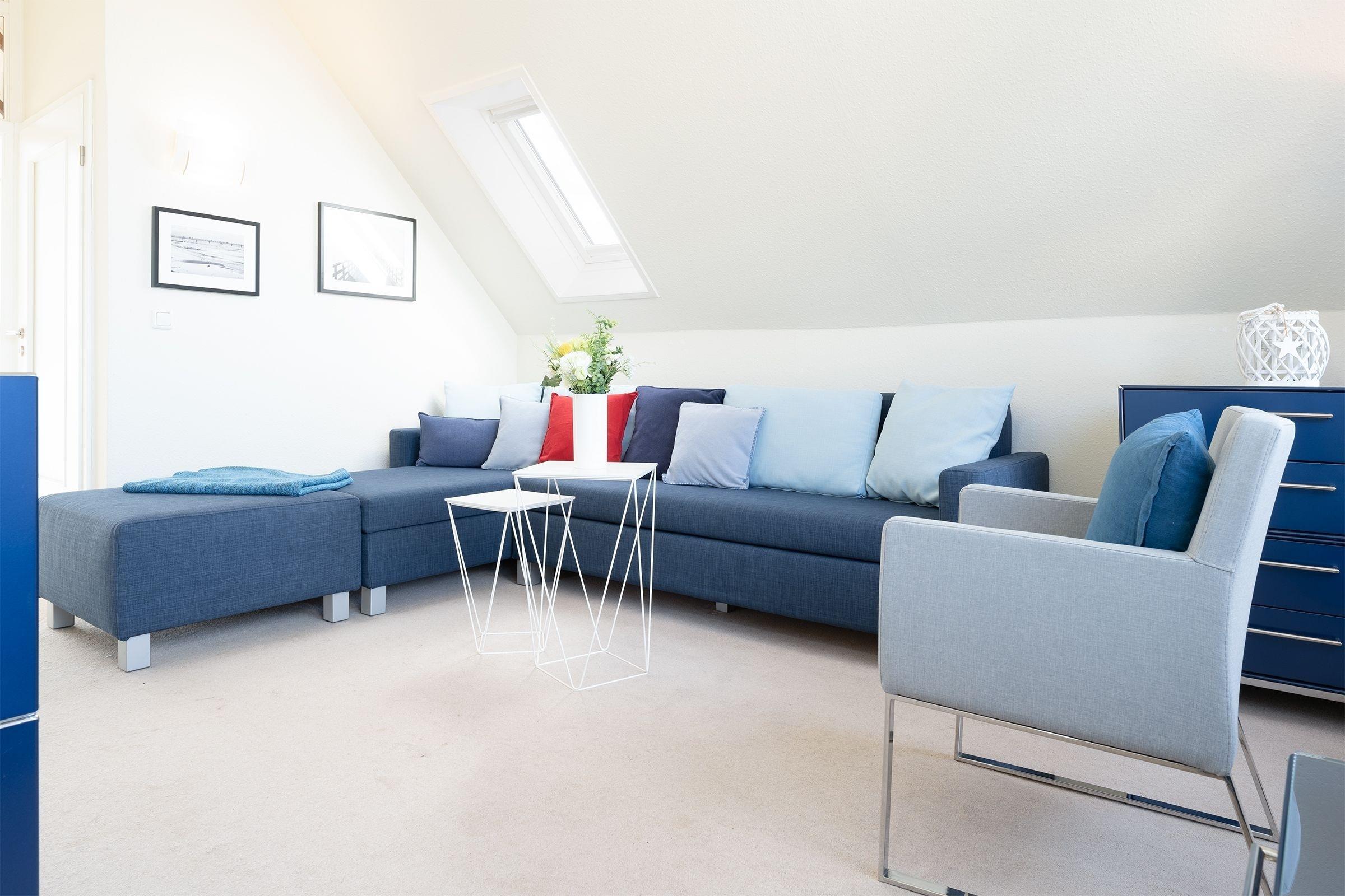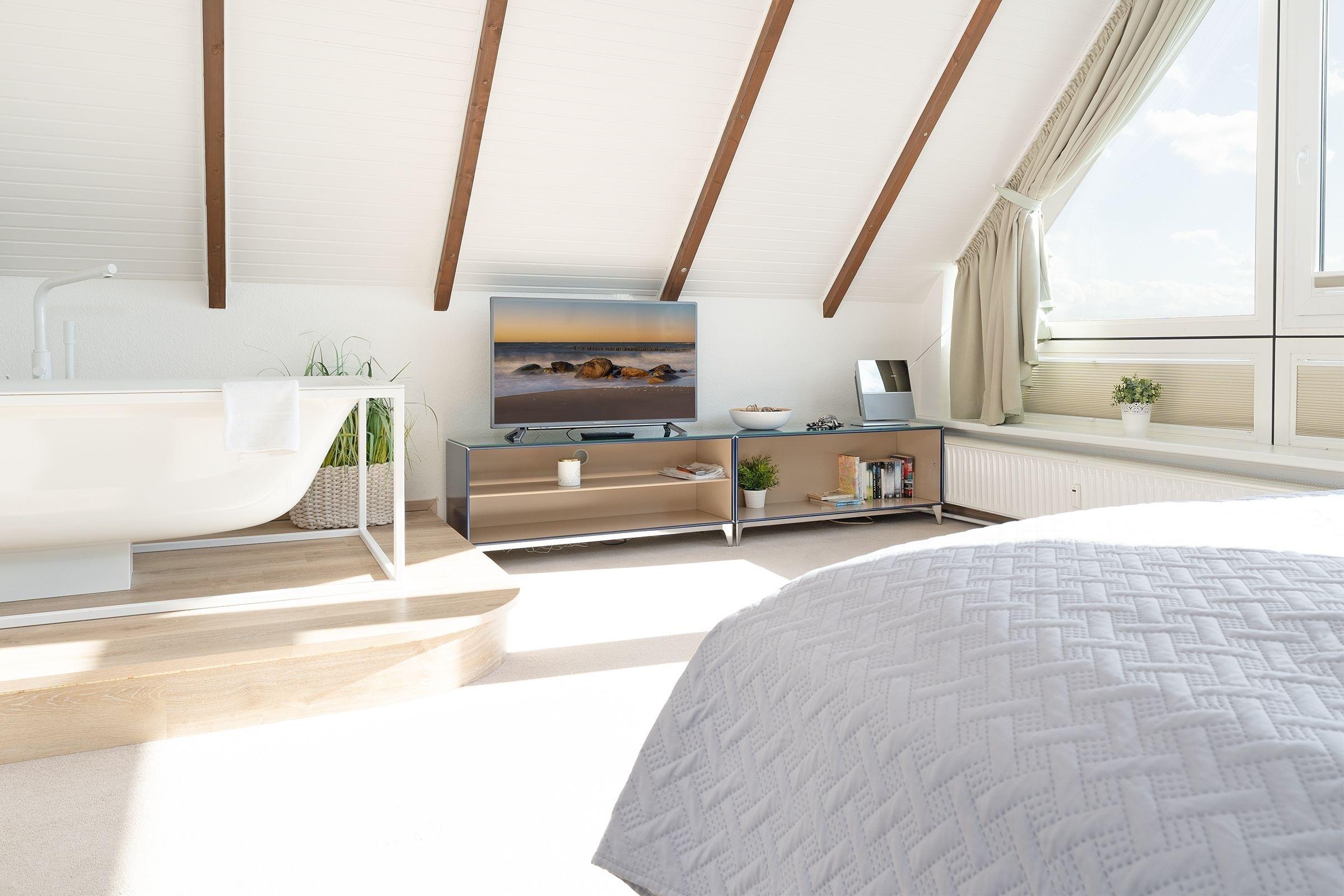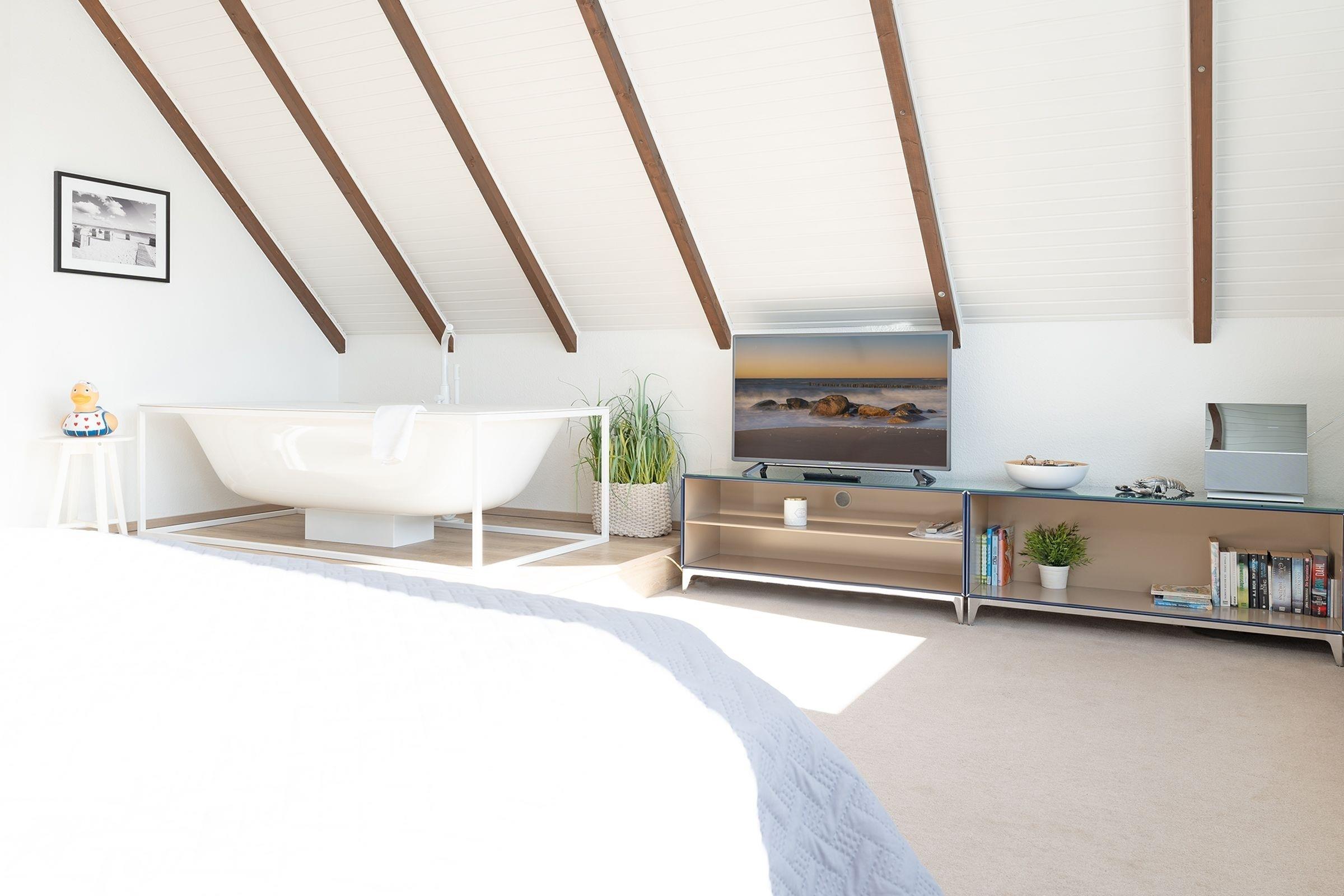Über eine geschwungene Wendeltreppe gelangen Sie vom Wohn-/Essbereich in die obere Etage, hier befinden sich ein zweiter lichtdurchfluteter Wohnraum mit komfortabler Wohnlandschaft. Zudem gibt es hier ein weiteres Badezimmer mit Dusche, WC und Handtuchheizung. Das zweite geräumige Schlafzimmer mit seinen großen Fensterflächen bietet einen zauberhaften Ostseeblick, ein gemütliches Doppelbett (2x 90x200 cm) für erholsamen Schlaf und einen zusätzlichen Flat-TV. Hier erwartet Sie zudem ein wohl einzigartiges Highlight: eine freistehende Badewanne!