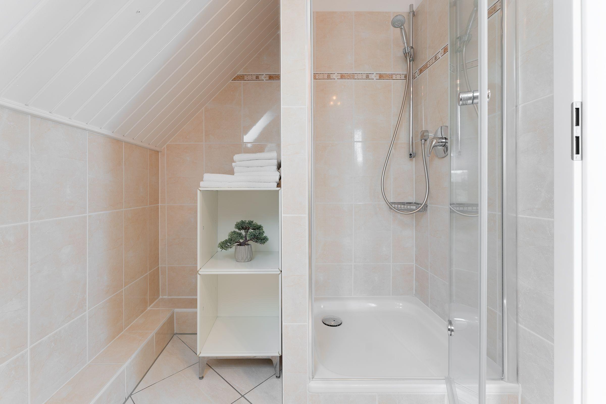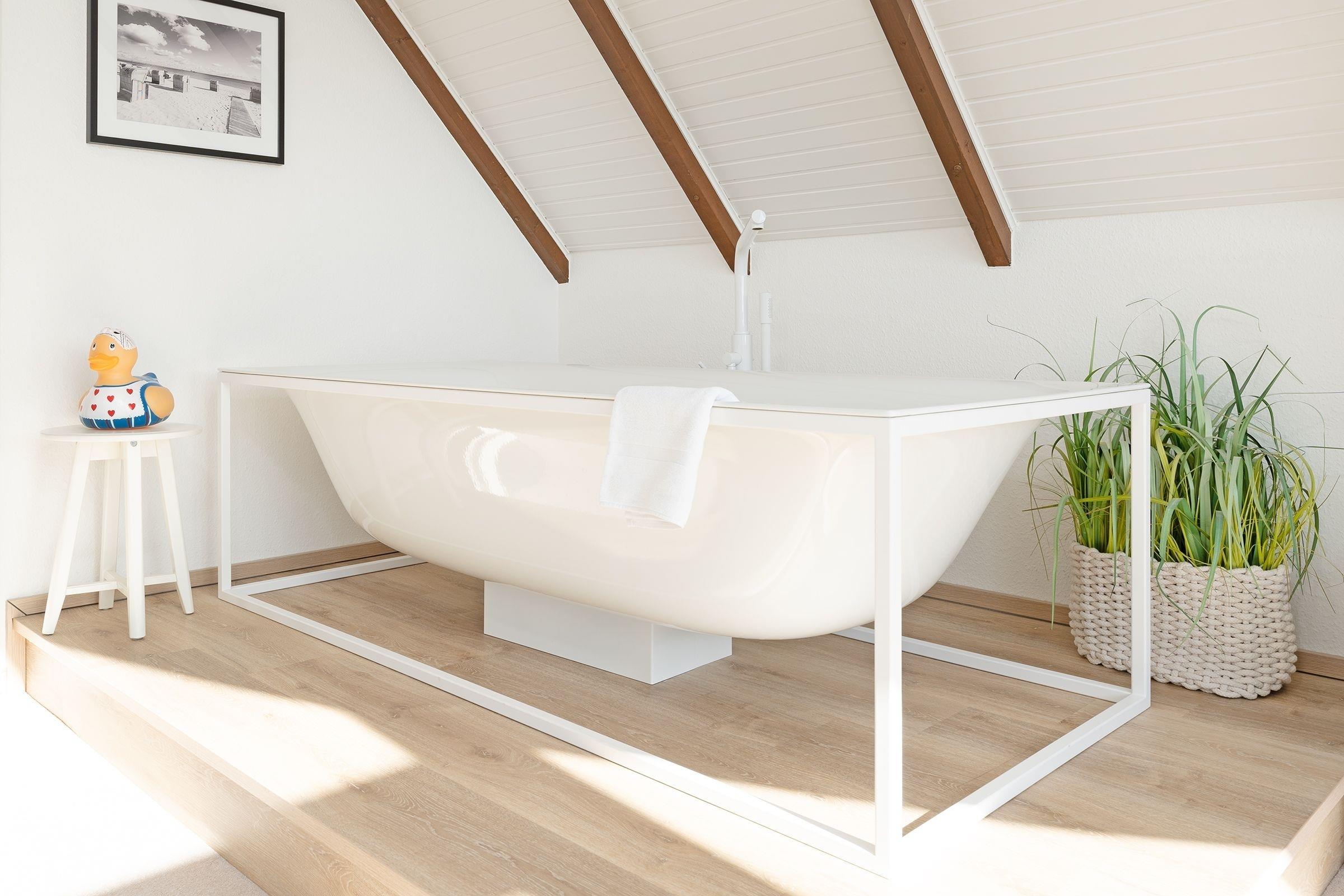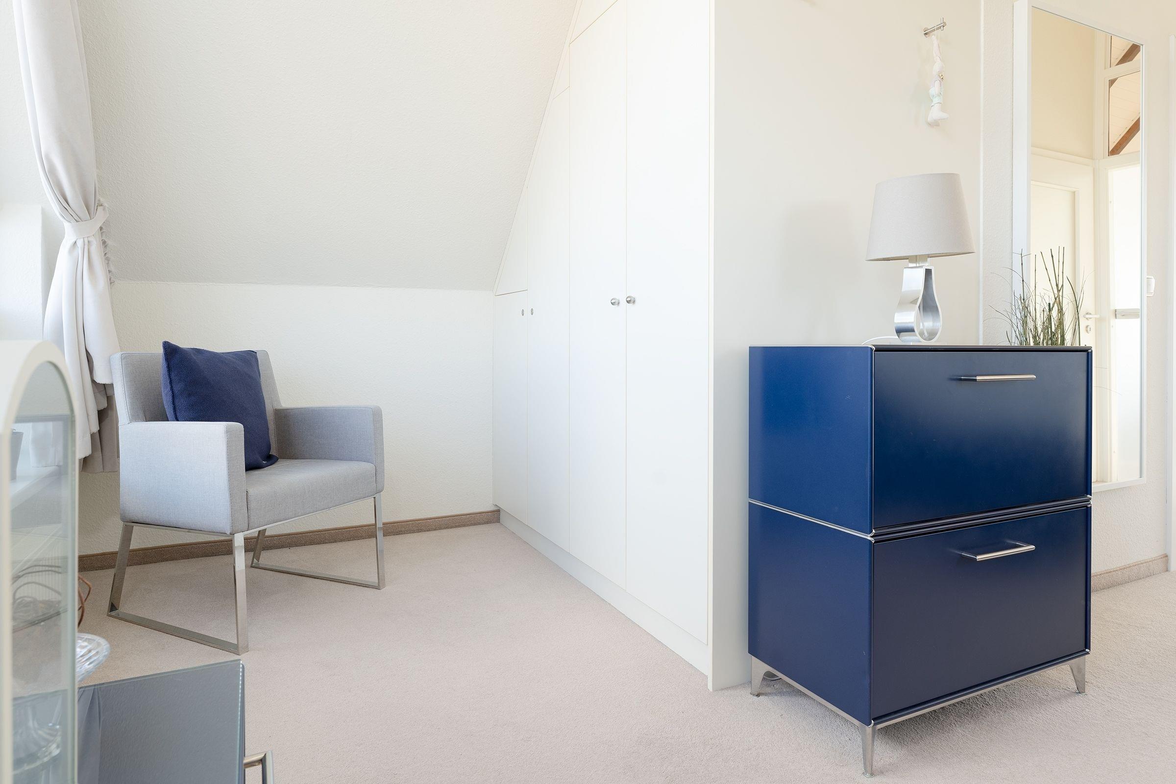 Über eine geschwungene Wendeltreppe gelangen Sie vom Wohn-/Essbereich in die obere Etage, hier befinden sich ein zweiter lichtdurchfluteter Wohnraum mit komfortabler Wohnlandschaft. Zudem gibt es hier ein weiteres Badezimmer mit Dusche, WC und Handtuchheizung. Das zweite geräumige Schlafzimmer mit seinen großen Fensterflächen bietet einen zauberhaften Ostseeblick, ein gemütliches Doppelbett (2x 90x200 cm) für erholsamen Schlaf und einen zusätzlichen Flat-TV. Hier erwartet Sie zudem ein wohl einzigartiges Highlight: eine freistehende Badewanne!