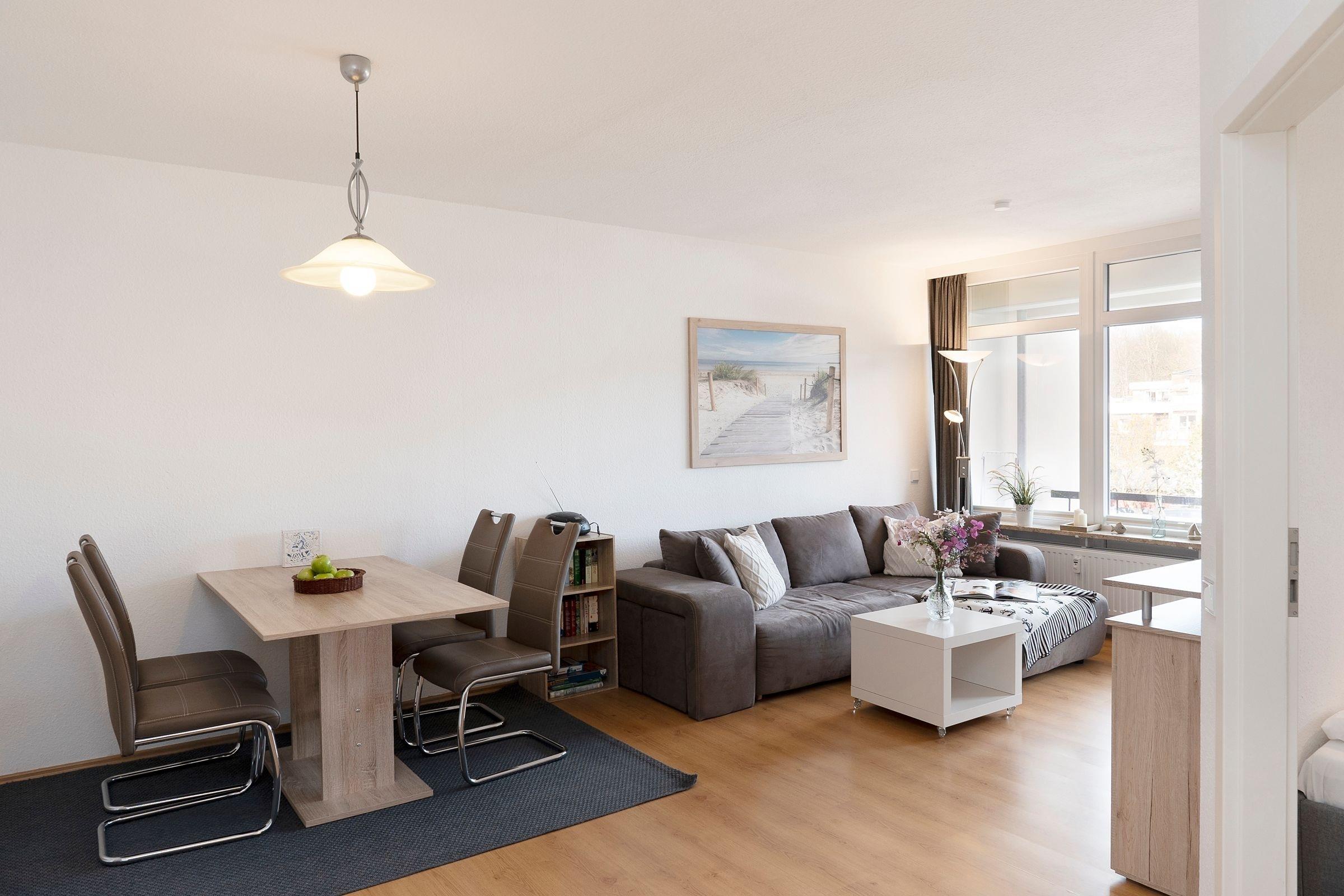 Neben einem großzügigen und lichtdurchfluteten Wohn-/Essbereich mit Schlafsofa (ca. 120x200 cm) verfügt Ihre Wohnung über ein separates Schlafzimmer mit einem komfortablen Doppelbett (2x 90x200 cm) und zusätzlichem Flachbild-TV. Ihre Urlaubsgarderobe verstauen Sie problemlos in einem geräumigen Kleiderschrank. Vom Wohnbereich aus haben Sie direkten Zugang auf den möblierten Balkon, auf dem Sie einen ereignisreichen Urlaubstag mit einem Glas Wein ausklingen lassen können. Das Duschbad wurde zum Jahresbeginn 2022 komplett saniert und ist mit allem ausgestattet, um erfrischt in den neuen Urlaubstag zu starten. Die moderne, offene Küchenzeile wurde ebenfalls 2022 erneuert und ist perfekt in den Wohnbereich integriert. Sie bietet alles, was Hobby-Koch-Herzen höher schlagen lässt. Unter anderem stehen Ihnen hier eine Kaffee-Pad-Maschine (Senseo) und eine Filterkaffeemaschine zur Verfügung. Bereiten Sie problemlos Ihre Mahlzeiten zu und genießen Sie gesellige Kochabende mit Freunden und Familie.