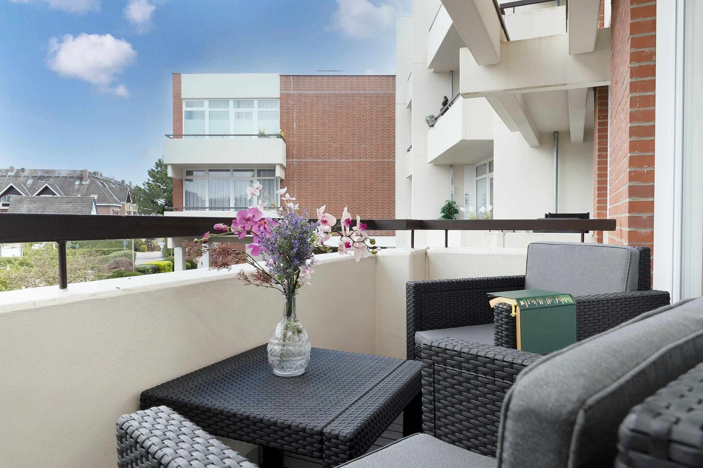Moderne Ferienwohnung mit Balkon nahe dem feinsandigen Strand von Grömitz, ideal für erholsame Tage am Meer.