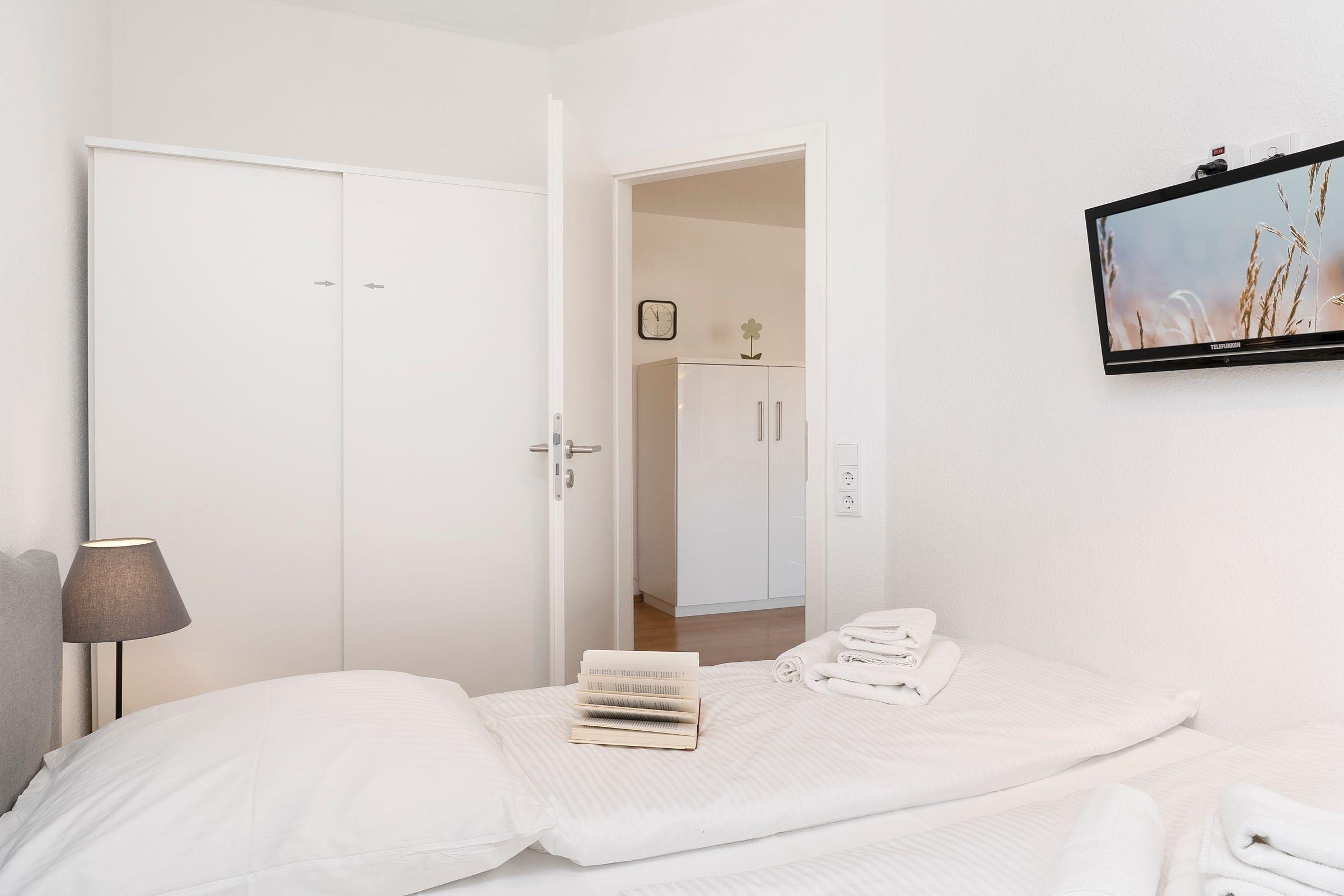 Schlafzimmer: 1 Doppelbett (2x 90x200 cm), Kleiderschrank, TV, Verdunkelung (Vorhänge), kein Platz für Kinderbett