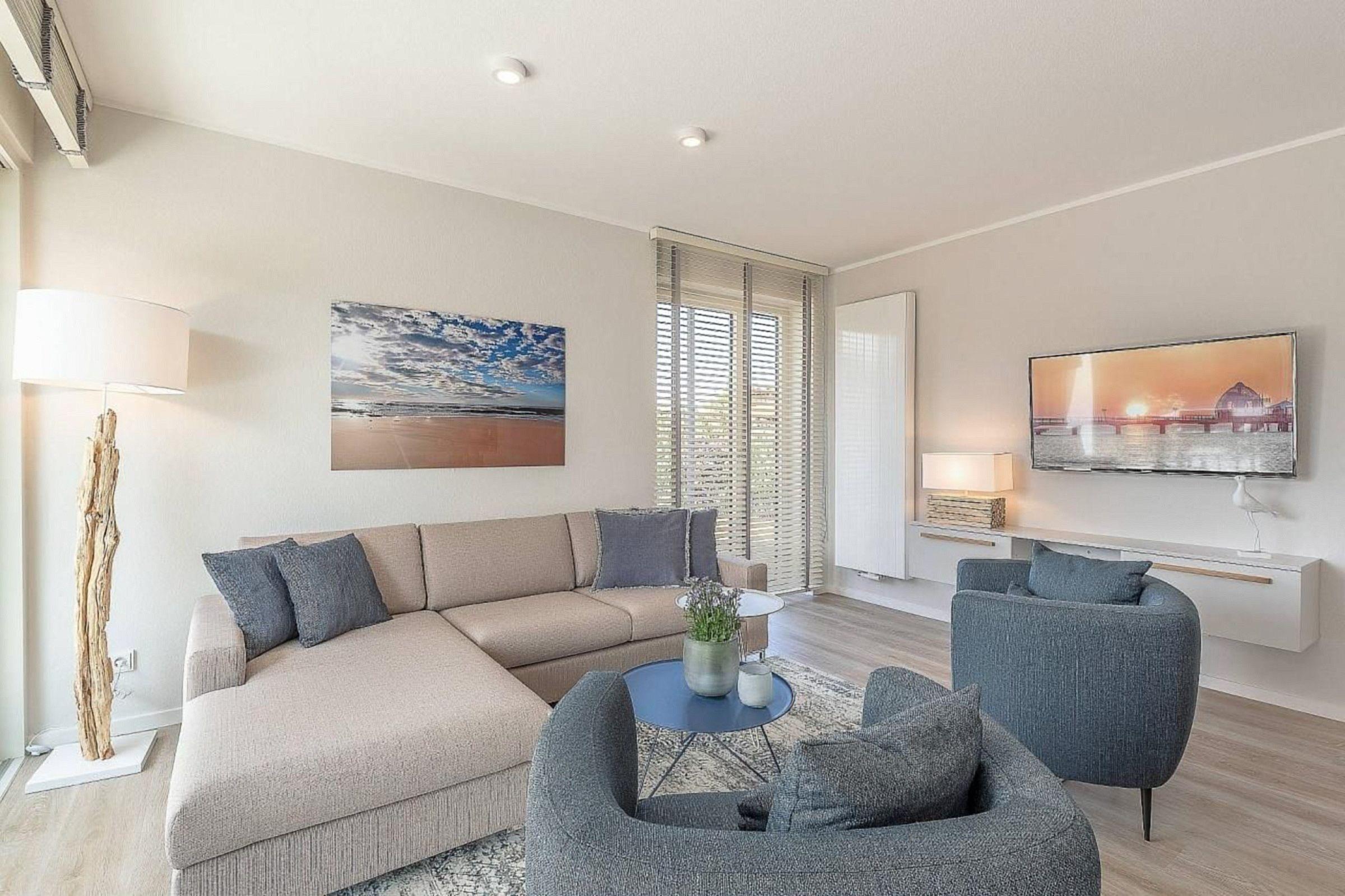 Der Wohnbereich empfängt Sie mit einer hochwertigen, geschmackvollen Einrichtung und versprüht Wohlfühl-Atmosphäre vom ersten Moment an! Die moderne Küche ist offen gestaltet und perfekt in den Wohnbereich integriert, sie bietet alles, was Hobby-Koch-Herzen höher schlagen lässt. Zwei separate Schlafräume mit komfortablen Boxspring-Doppelbetten (je 2x 90x200cm) bieten reichlich Platz für Ruhe und Erholung, beide sind jeweils mit einem zusätzlichen Flat-TV ausgestattet. Das Badezimmer überzeugt im modernen Stil mit Dusche und WC. Auf Ihrer Terrasse mit Südausrichtung genießen Sie die herrliche Ostseeluft und eine leckere Tasse Kaffee am Morgen.