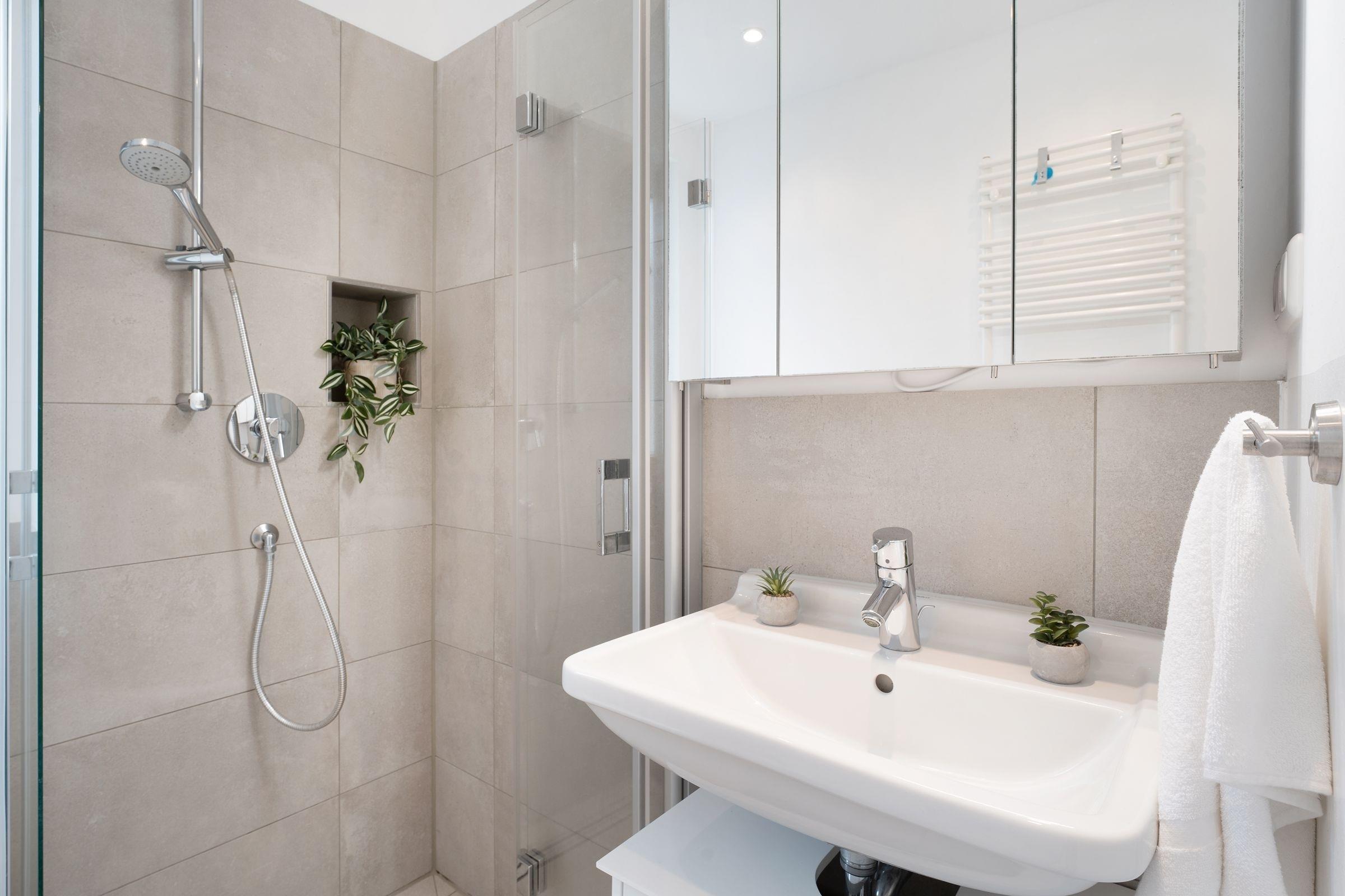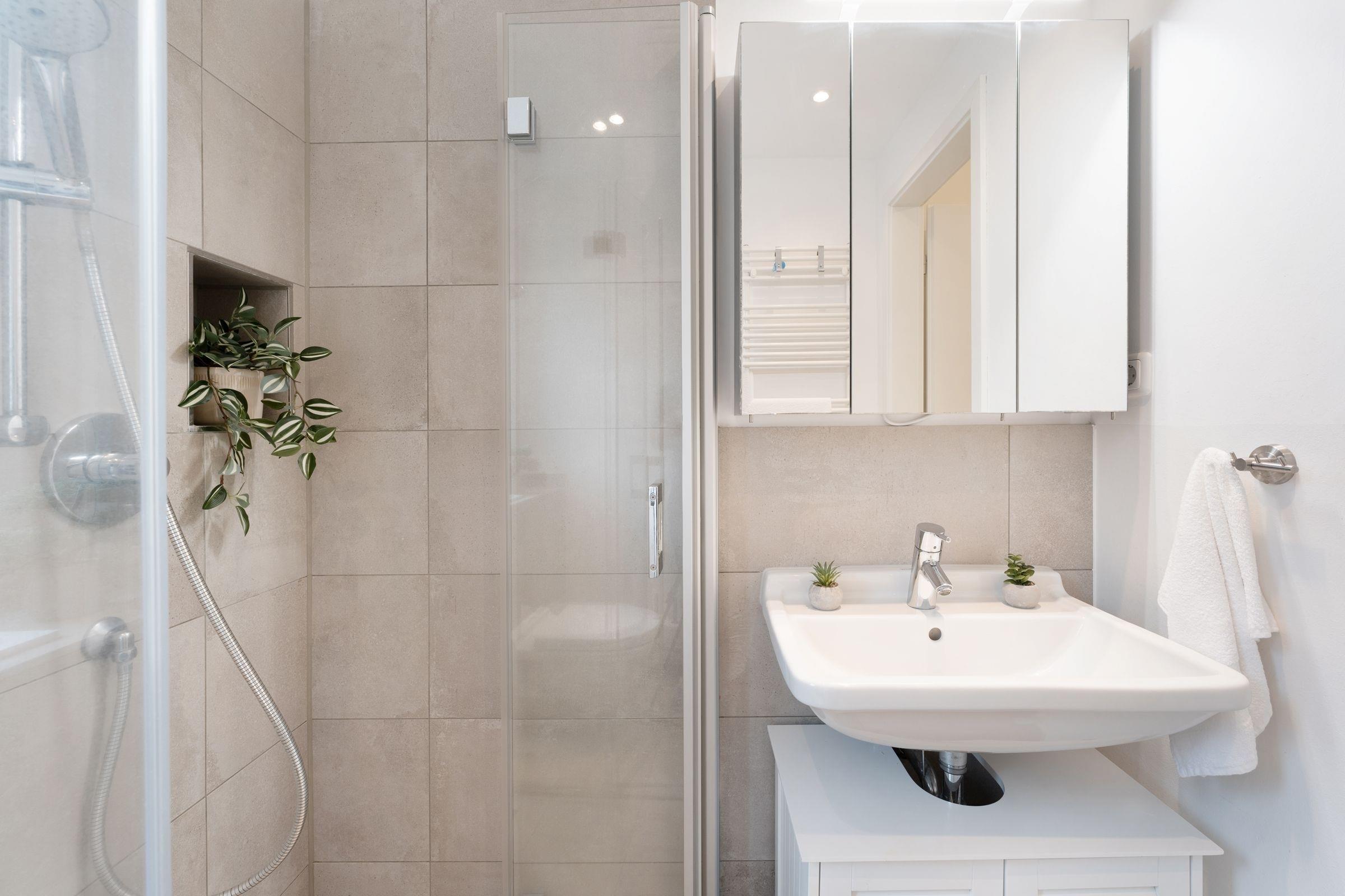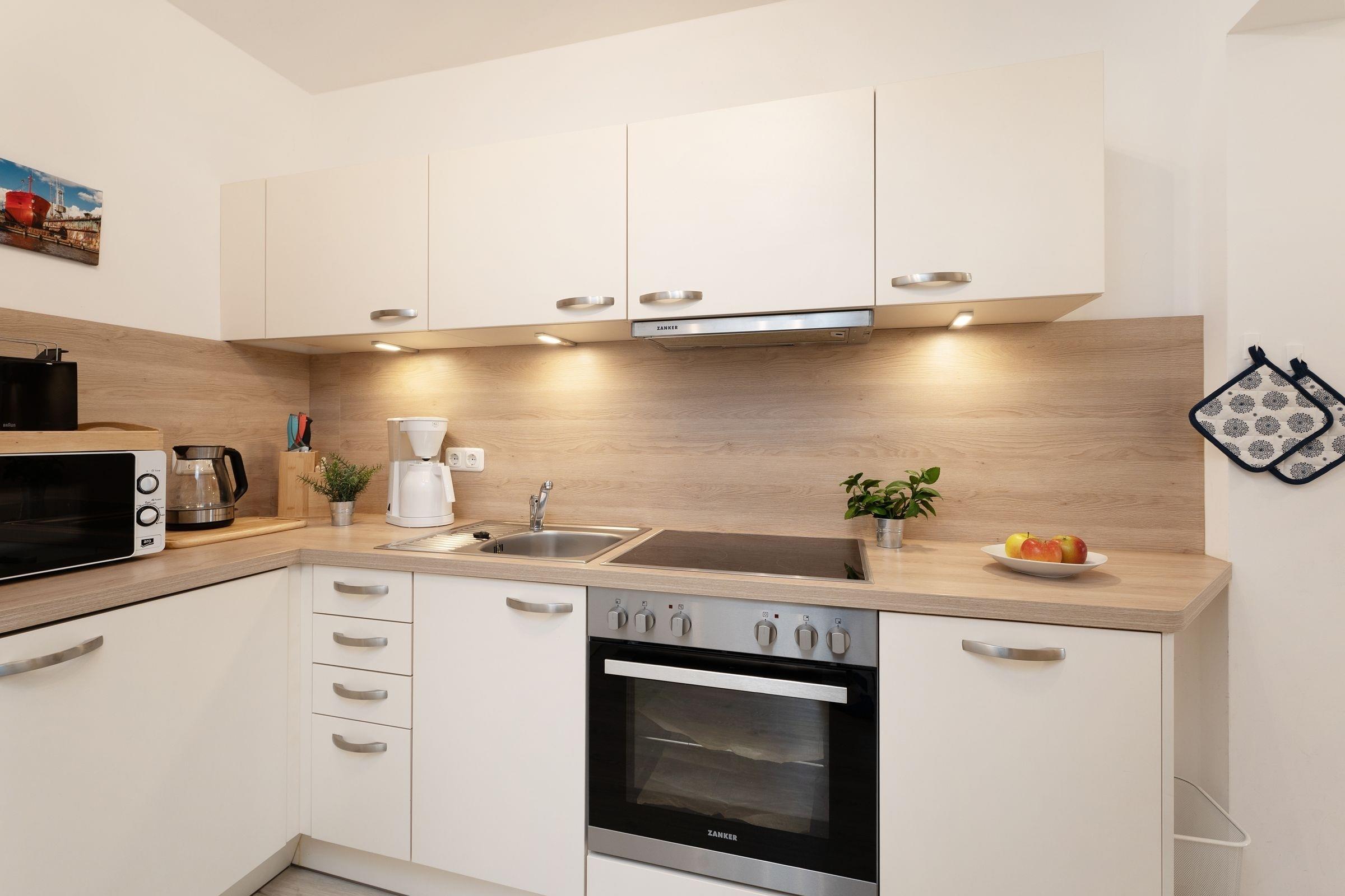 Die moderne und gut ausgestattete Küche bietet alles. Bereiten Sie problemlos Ihre Mahlzeiten zu und genießen Sie gemütliche Kochabende. Neben einem komfortablen Schlafzimmer mit Doppelbett (180x200 cm) finden Sie hier außerdem ein stilvolles Design-Bad mit Fenster. Sowohl der Wohnbereich als auch das Schlafzimmer sind jeweils mit einem Flachbildfernseher ausgestattet. Die gesamte Wohnung verfügt über Außenjalousien, sodass alle Räume gut abgedunkelt werden können. Vom Wohnzimmer aus gelangen Sie auf den möblierten Balkon mit Nordwestausrichtung.