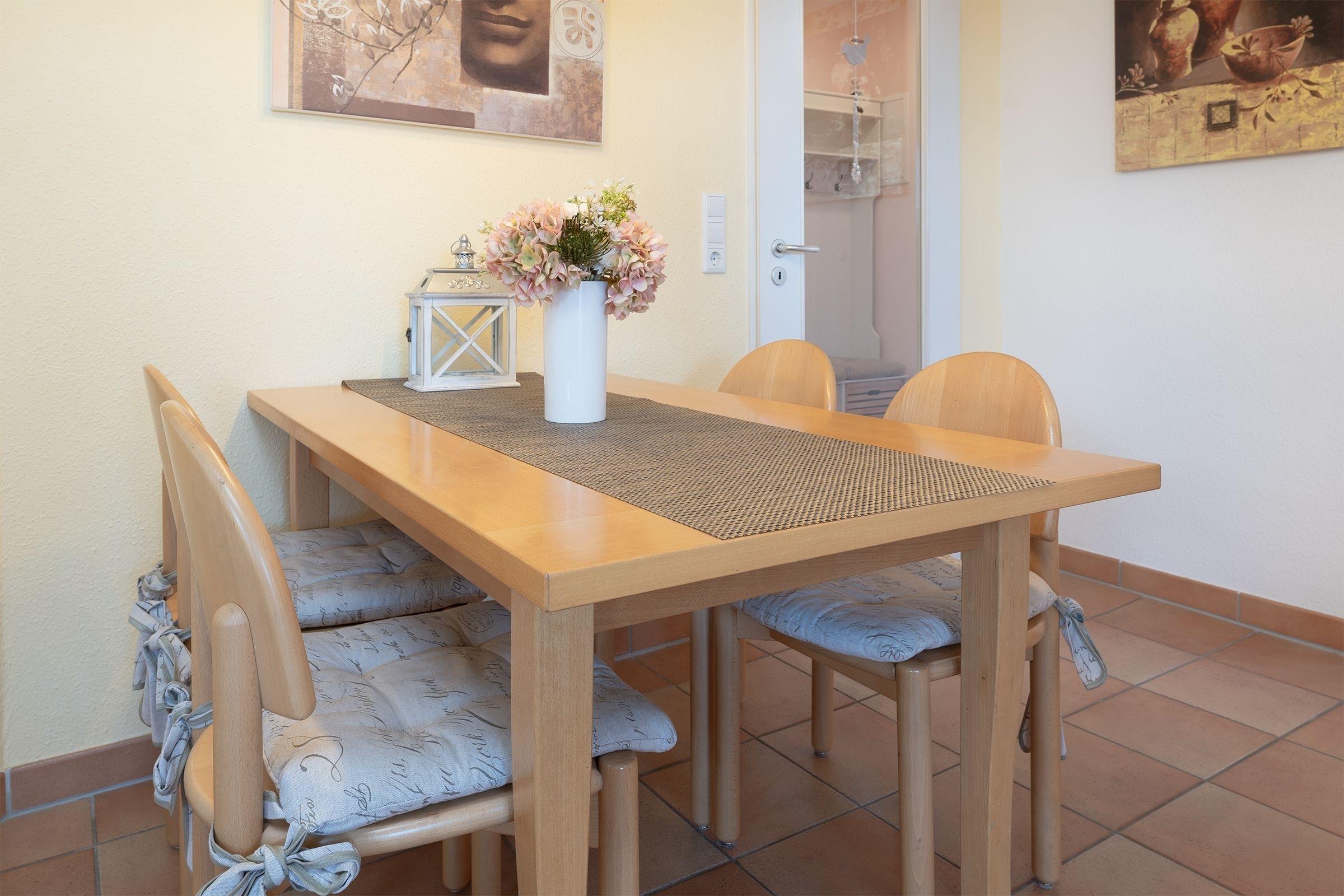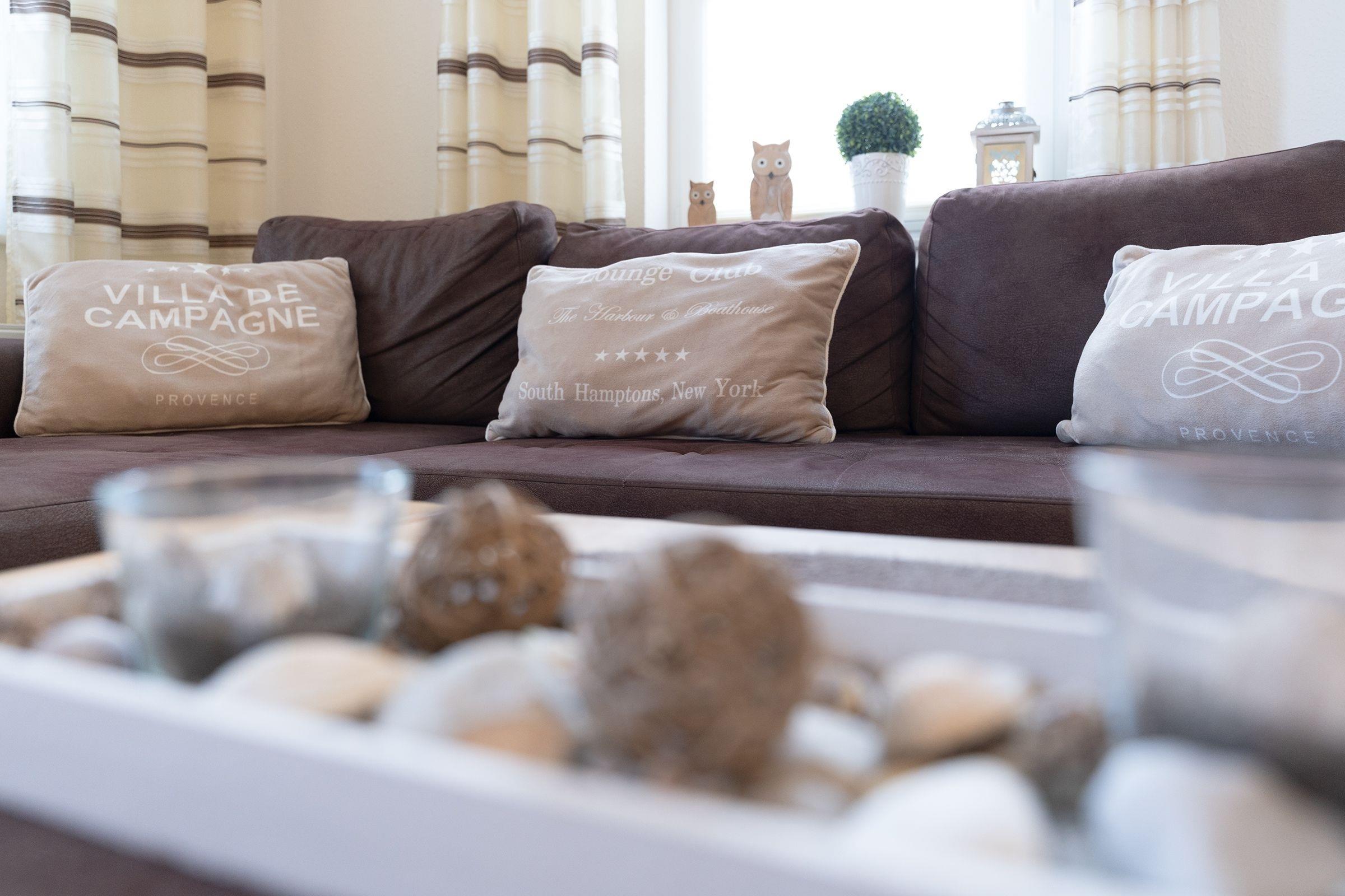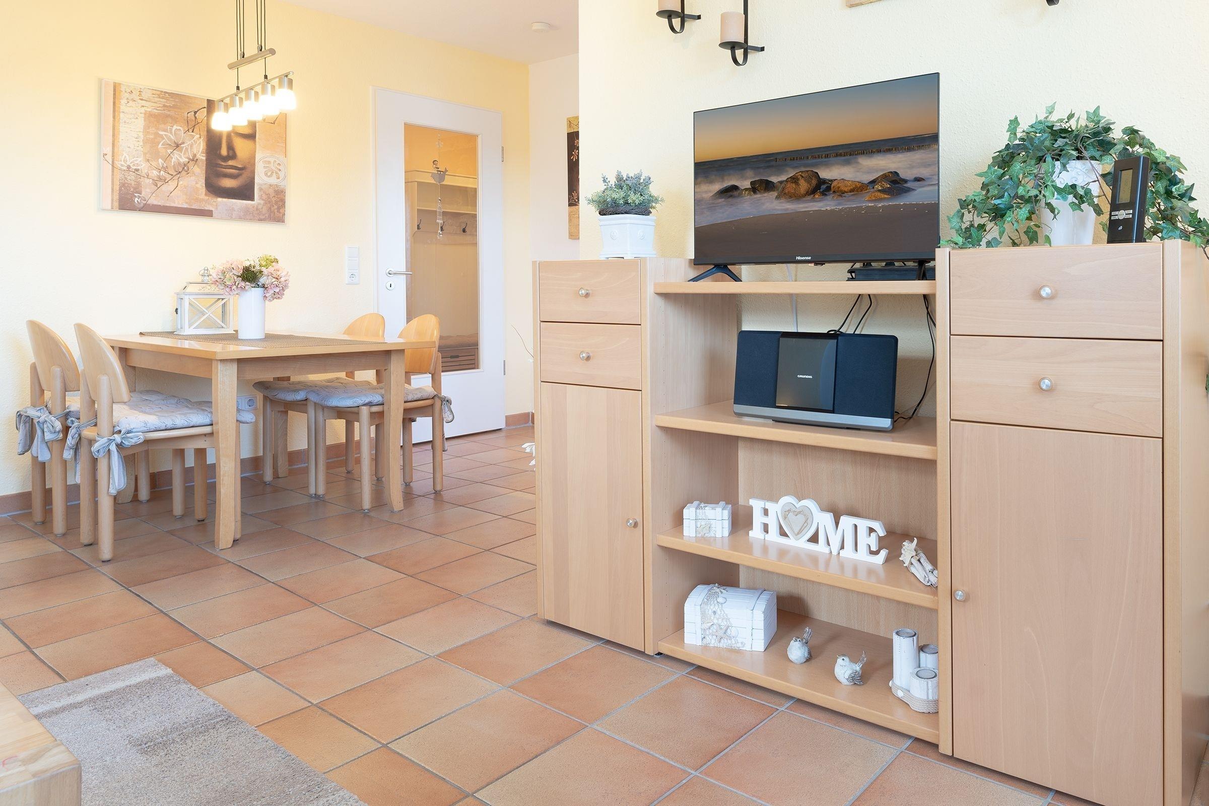 Die hochwertige Ferienwohnung wurde mit liebevollem Gespür eingerichtet. Warme Farben und wertige Möbel sorgen rundum für ein absolutes Wohlfühl-Ambiente, hier wurde alles mit Bedacht aufeinander abgestimmt. Der großzügige Wohn- Essbereich ist mit einem ausziehbaren Esstisch mit 4 Stühlen ausgestattet. Das wertige Schlafsofa lässt sich mit wenigen Handgriffen in eine bequeme Schlafstätte verwandeln. Vom offenen Wohnbereich führt ein direkter Zugang auf den möblierten Balkon mit Ostausrichtung, auf dem es sich es sich wunderbar in der herrlichen Morgensonne frühstücken lässt. In der gut ausgestatteten, separaten Küche können Sie im Handumdrehen leckere Ferienmahlzeiten zubereiten und die Spülmaschine übernimmt den Abwasch. In diesem Domizil gibt es zudem keinen Streit über das Fernsehprogramm, denn sowohl ein großer Flachbild-TV im Wohnbereich, sowie ein zusätzlicher TV in einem der Schlafzimmer sorgen für Auswahl bei der Unterhaltung. Ein Radio, DVD-Player und ein WLAN-Anschluss stehen ebenfalls zur Verfügung.