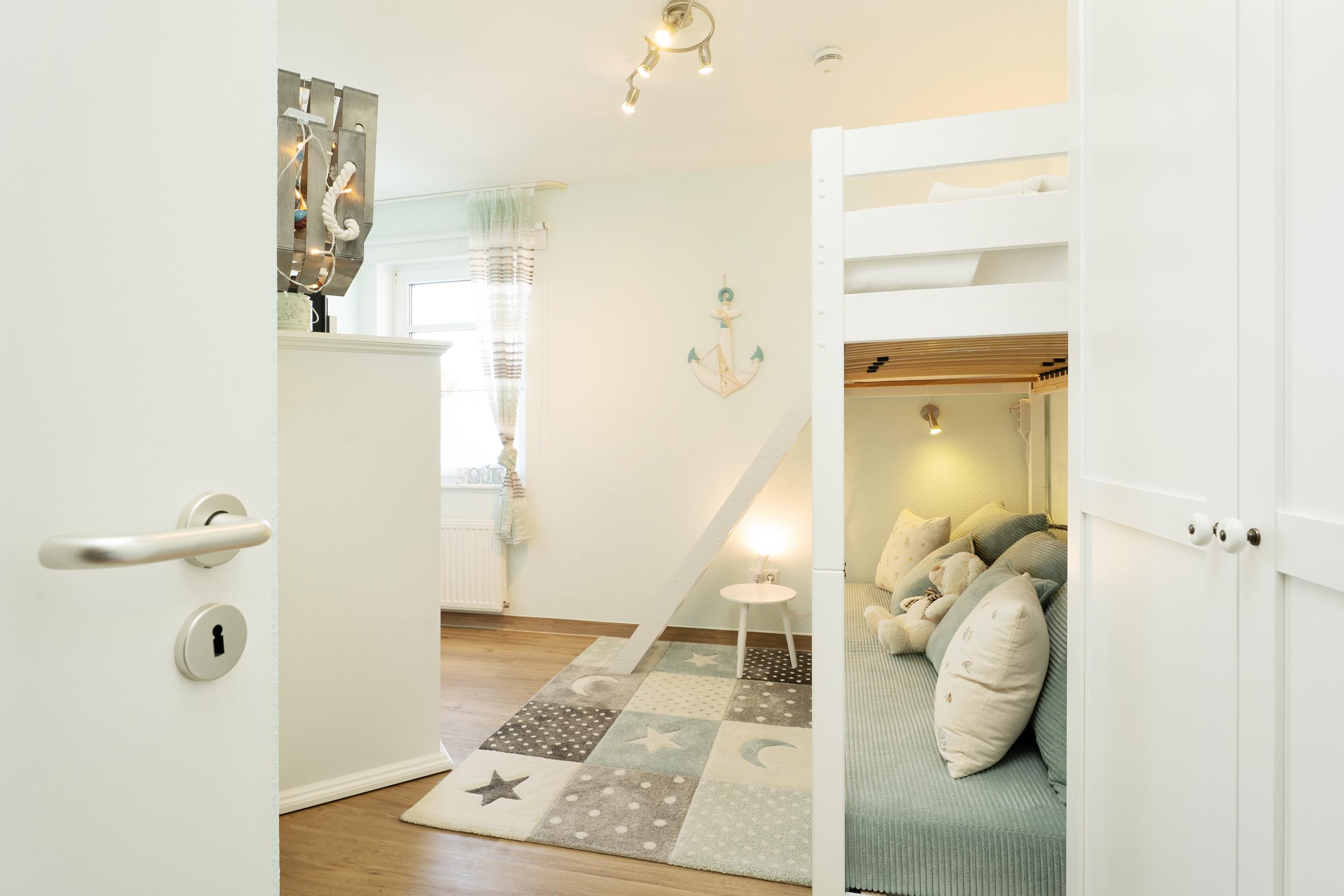 Schlafzimmer 2: 1 Hochbett (Liegefläche oben: 90x200 cm), Schlafsofa unter dem Hochbett (90x200 cm, ausziehbar bis 140x200 cm)