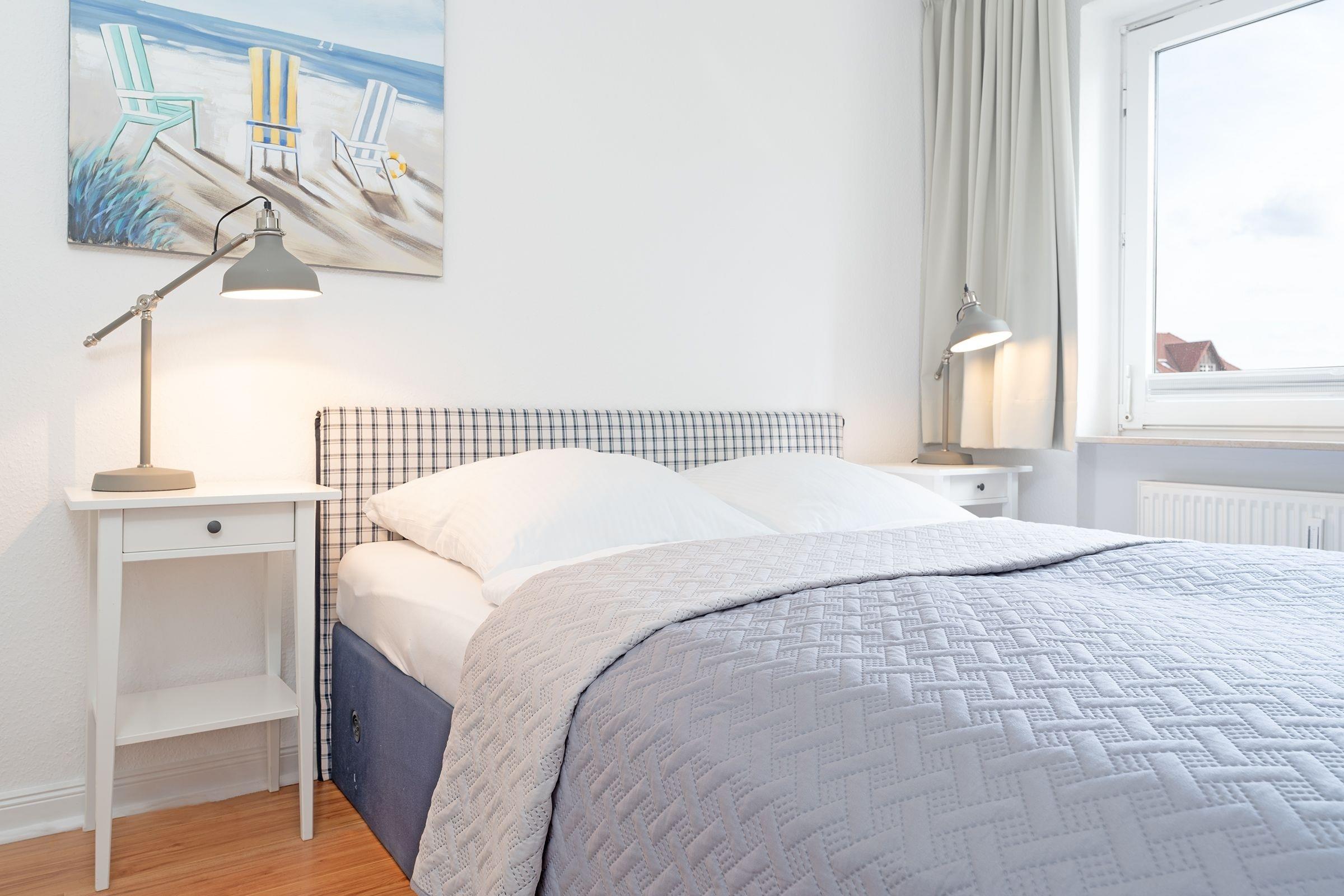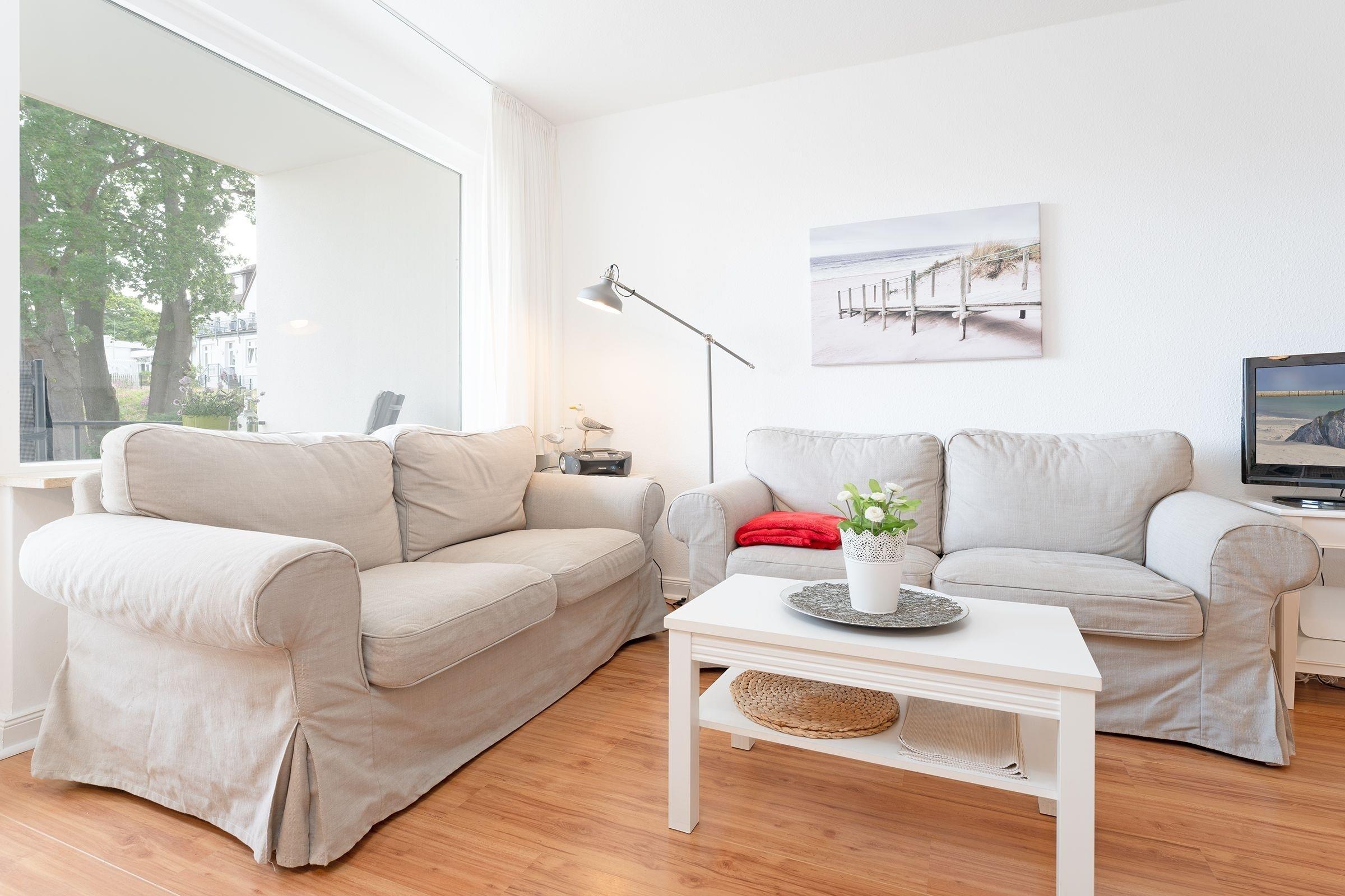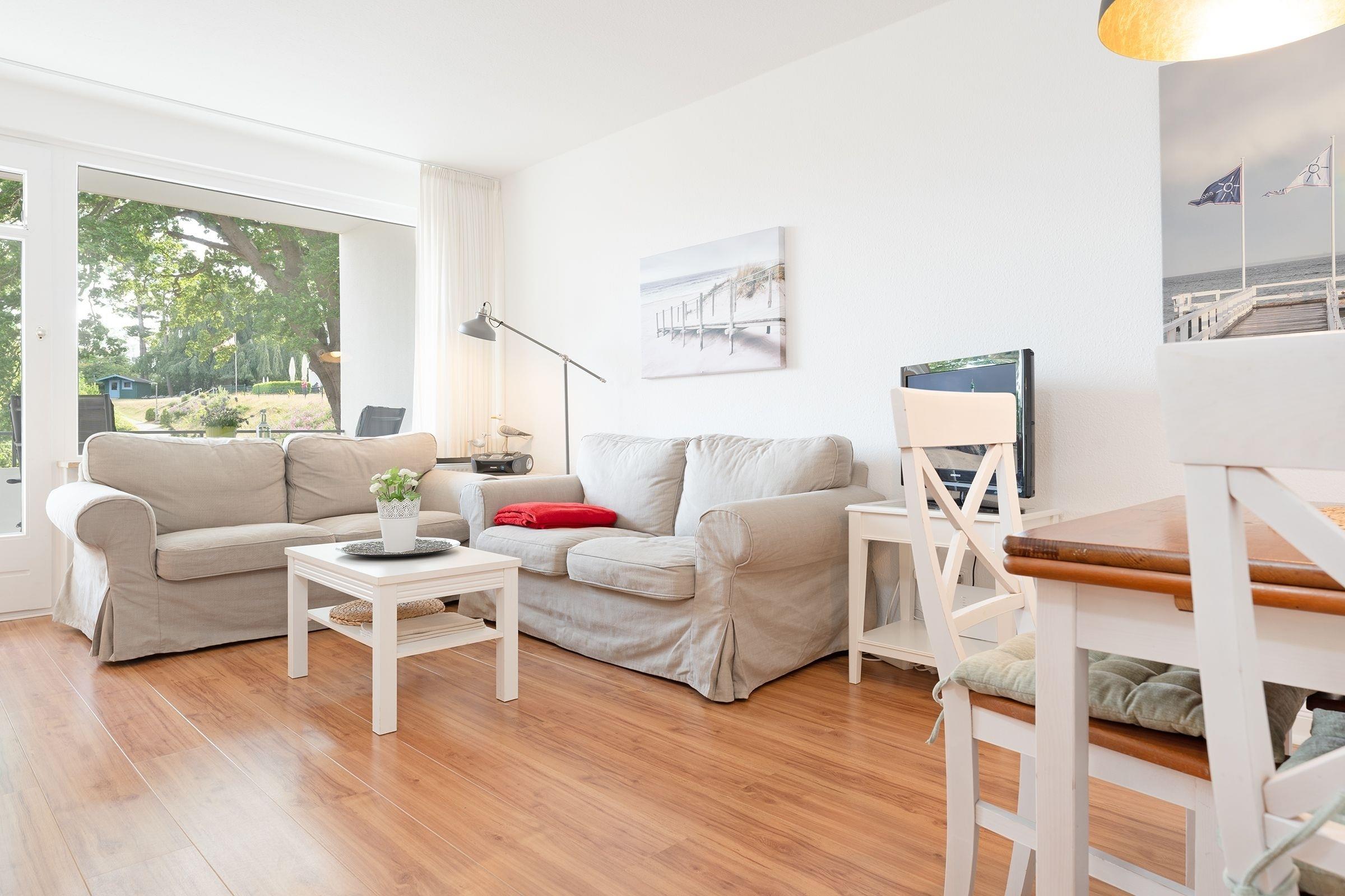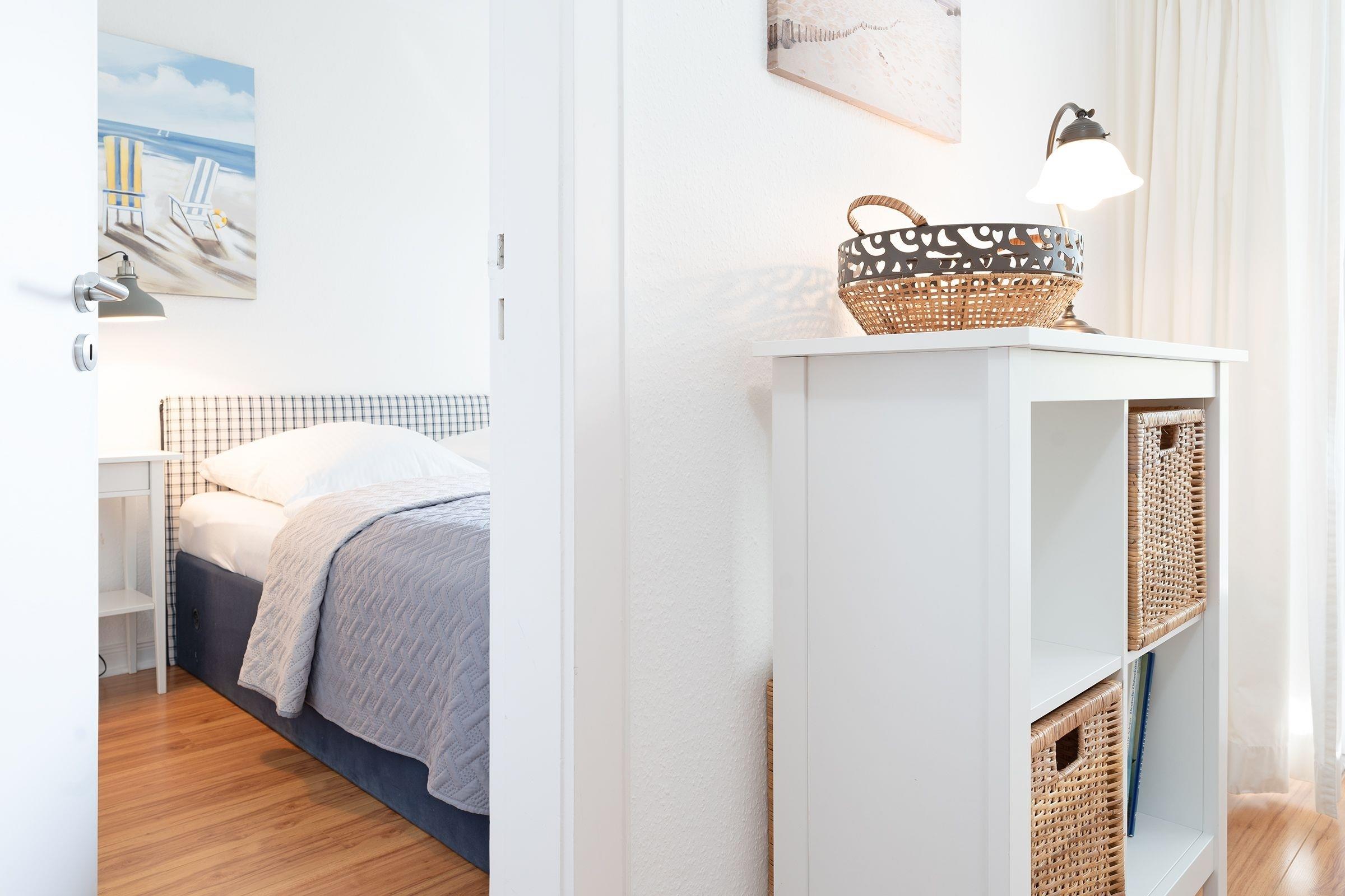 Hochwertige Möbel im modernen Landhaus-Stil strahlen maritime Gemütlichkeit aus. Lichtdurchflutet und hell begrüßt Sie der Wohnraum mit integriertem Essbereich und ausziehbarem Tisch. Zwei bequeme Sofas und ein Flachbild-TV sorgen nach langen Strandspaziergängen für Entspannung. Vom Wohnzimmer führt ein direkter Zugang auf den möblierten Balkon mit Westausrichtung und seitlichem Blick Richtung Ostsee. In der kleinen separaten Küche ist von der Mikrowelle, über den Backofen und den 4-Plattenherd alles vorhanden und die Spülmaschine erledigt den Abwasch. Das größere der beiden Schlafzimmer ist mit einem Doppelbett ausgestattet (2x 90x200 cm), hier sorgen Plissee-Rollos und Vorhänge für Verdunklung. Das zweite Schlafzimmer ist mit einem Etagenbett (je 90x195 cm), sowie einer Kommode für die Unterbringung der Feriengarderobe ausgestattet. Auch hier sorgen Plissee-Rollos für Verdunklung und erholsamen Schlaf. Im modernen und geschmackvollen Designbad kann man Dank Eckdusche, WC und Waschtisch mit Spiegel wunderbar in den Tag starten.