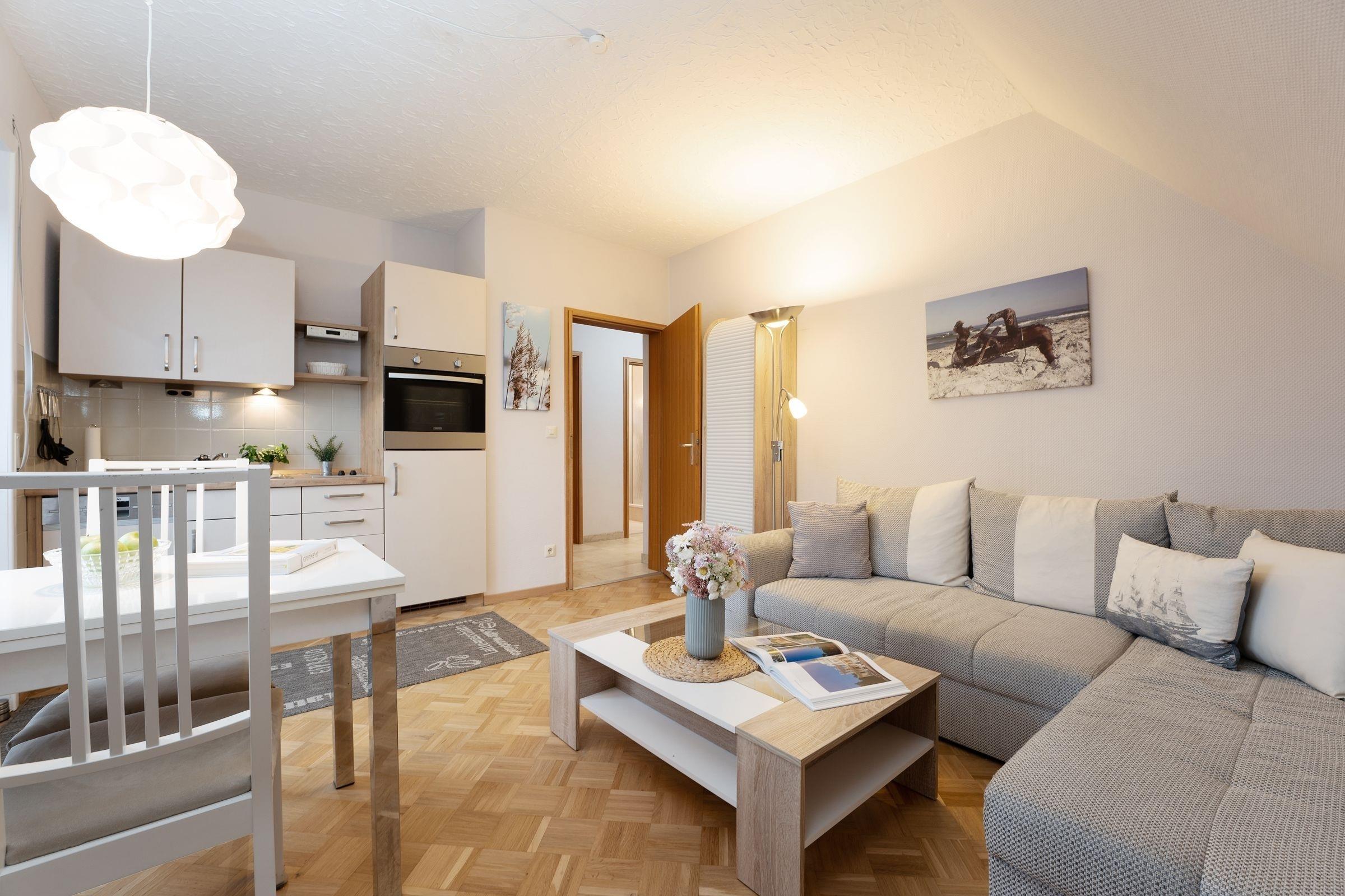 Der offen gestaltete Wohn-/Essbereich umfasst eine großzügige Sitzecke, einen Esstisch sowie eine Küchenzeile und begrüßt Sie behaglich mit moderner Einrichtung.