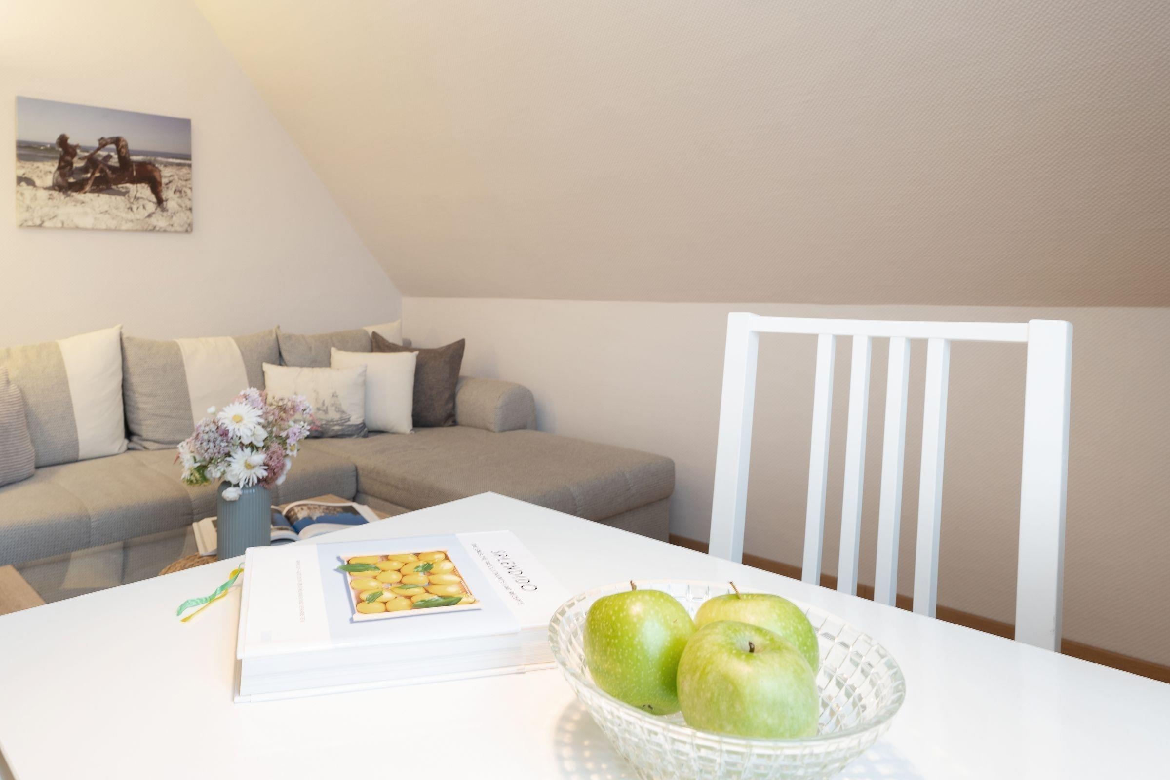 Die integrierte Küchenzeile überzeugt mit hochwertiger Ausstattung wie einem Backofen in angenehmer Arbeitshöhe, sowie einer Spülmaschine. Machen Sie es sich nach langen Strandtagen auf dem Ecksofa mit Schlaffunktion (Liegefläche 150x200cm) bequem, ein Flatscreen-TV sorgt für Unterhaltung. Das geschmackvolle Tageslichtbad in hellen Naturtönen bietet mit schöner Dusche, WC, Waschtisch und beheizbarem Handtuchhalter viel Komfort. Das separate Schlafzimmer ist mit neuem komfortablen Boxspringbett (180x200cm) und Kleiderschrank ausgestattet, durch Außenjalousien ist Verdunklung für die Nacht gewährleistet. Vom Wohnbereich aus haben sie einen direkten Zugang auf den großen, möblierten Balkon mit Südwestausrichtung, freuen Sie sich auf viel Sonnenschein und eine schöne Prise Ostseeluft!