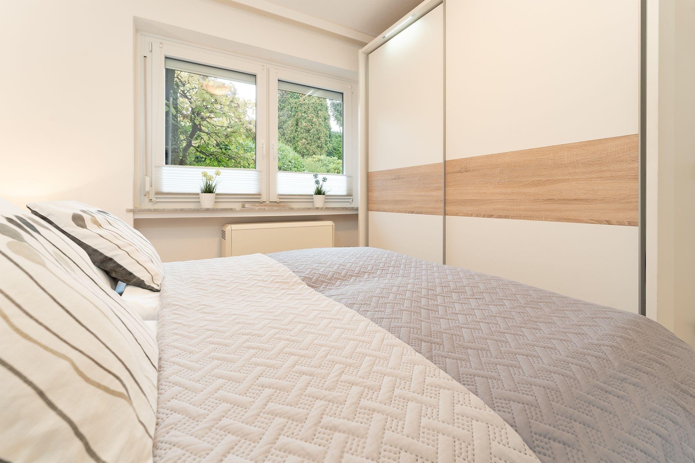 Schlafzimmer 1: 1 Doppelbett (2x 90x200 cm), Kleiderschrank, Verdunkelung (Außenjalousien, Plissees)