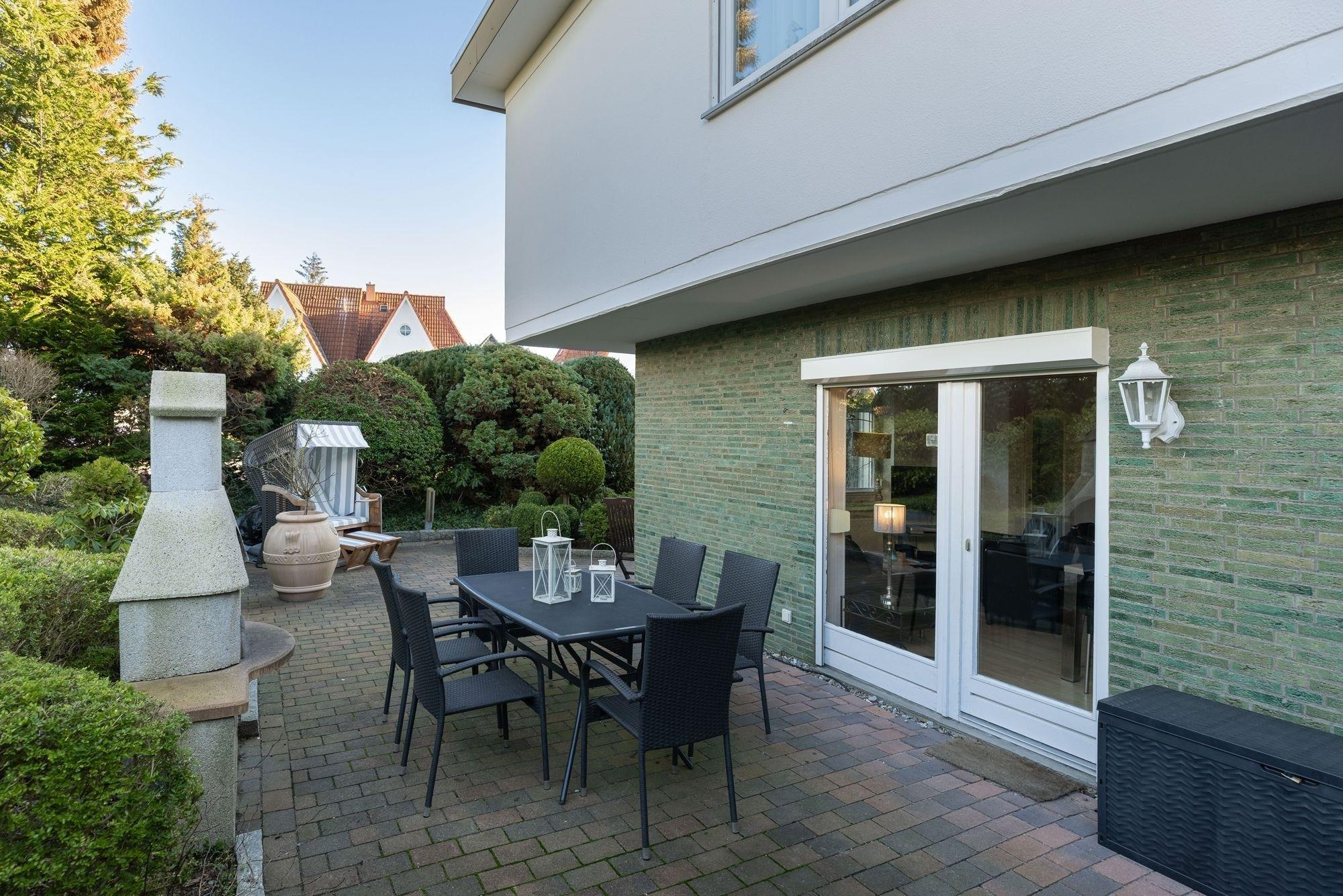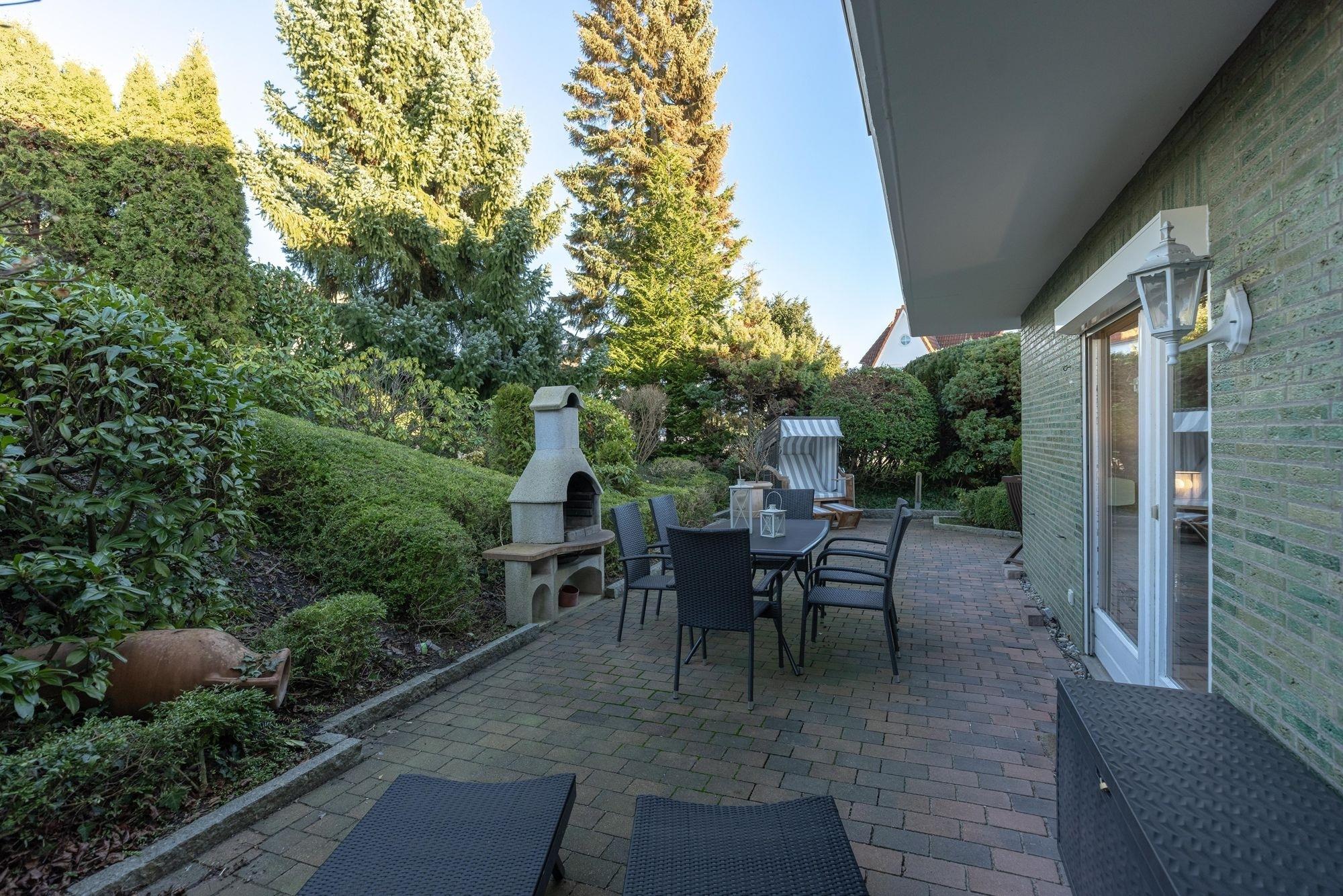 Insgesamt erwarten Sie 3 separate Schlafzimmer, ein Wohn-/Essbereich, eine großzügige Küche sowie ein Duschbad. Ein größeres Schlafzimmer ist mit Doppelbett (2x 90x200 cm) und Kleiderschrank ausgestattet, ein zweites Schlafzimmer mit Einzelbett (90x200 cm) und Kleiderschrank und schließlich das dritte Schlafzimmer mit Etagenbett (je 90x200 cm), Schlafsessel (70x190 cm) und Kleiderschrank. Alle Räume sind hell und modern gestaltet. Die gut ausgestattete Küche lässt kaum Wünsche offen - Annehmlichkeiten wie eine Tassimo-Kaffeemaschine, eine Spülmaschine, ein Backofen, Cerankochfeld und Mikrowelle gehören zur Grundausstattung. Gesellige Mahlzeiten und entspannte Koch- und Grillabende warten auf Sie. Genießen Sie Ihre Urlaubsabende auf Ihrer wunderschön angelegten Terrasse. Stilvolles, wertiges Außenmobiliar und Ihr eigener Grill machen die Terrasse zum erweiterten Wohnraum - Frühstück im Grünen, ein Sonnenbad am Nachmittag und abends den Tag im eigenen Strandkorb auf der Terrasse ausklingen lassen.
