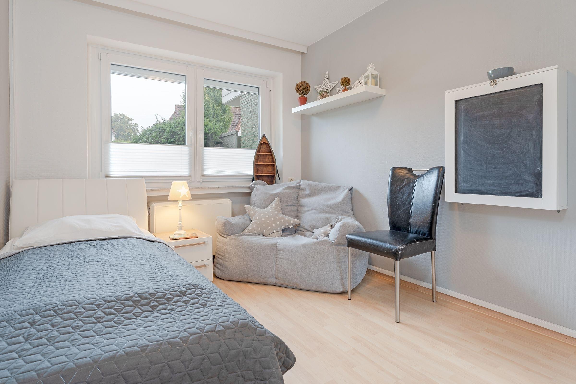 Schlafzimmer 2: 1 Einzelbett (90x200 cm), Kleiderschrank, Verdunkelung (Außenjalousien, Plissees)