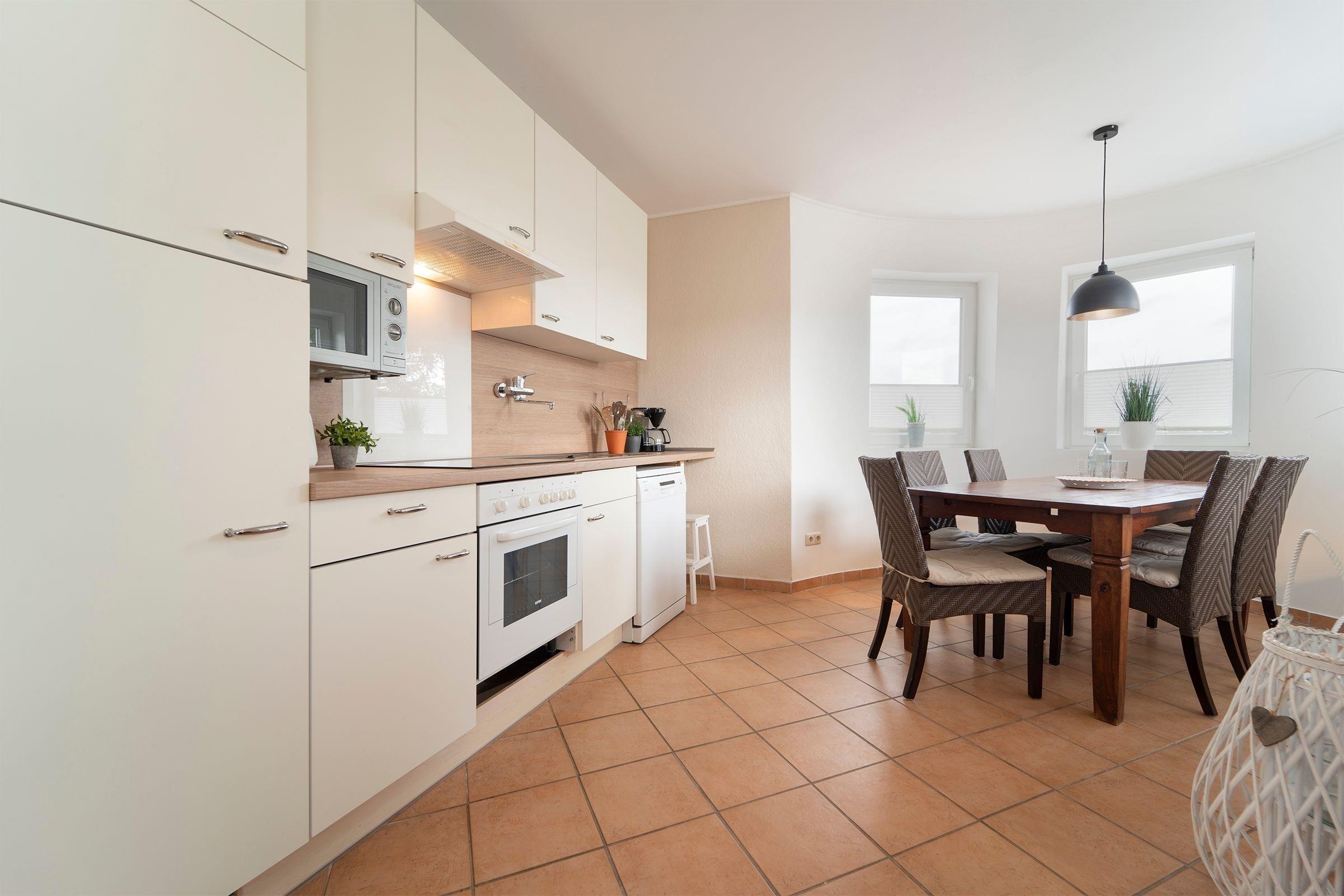Diese 60 m² Erdgeschosswohnung verteilt sich auf 3 Zimmer, die von dem geräumigen Flur abgehen. Davon ein Schlafzimmer mit Doppelbett (2x 90x200cm) und ein Kinderzimmer mit einem Einzelbett (90x200cm) und einem Etagenbett (2x 90x200cm). Die gemütliche Einrichtung zieht sich wie ein roter Faden durch die ganze Wohnung und schenkt Ihnen ein rundum Wohlgefühl. Ein Highlight dieser Wohnung ist die offene und großzügig gestaltete Wohnküche, die zum Verweilen mit der ganzen Familie einlädt. Genießen Sie das schöne Wetter auf der dazugehörigen möblierten Terrasse mit Markise und Grill, wo Sie den Tag entspannt ausklingen lassen können. Mit einer bodentiefe Dusche, einem beheizbaren Handtuchhalter und Fußbodenheizung bleibt auch im Badezimmer kein Wunsch offen. Lassen Sie denn Alltag hinter sich.