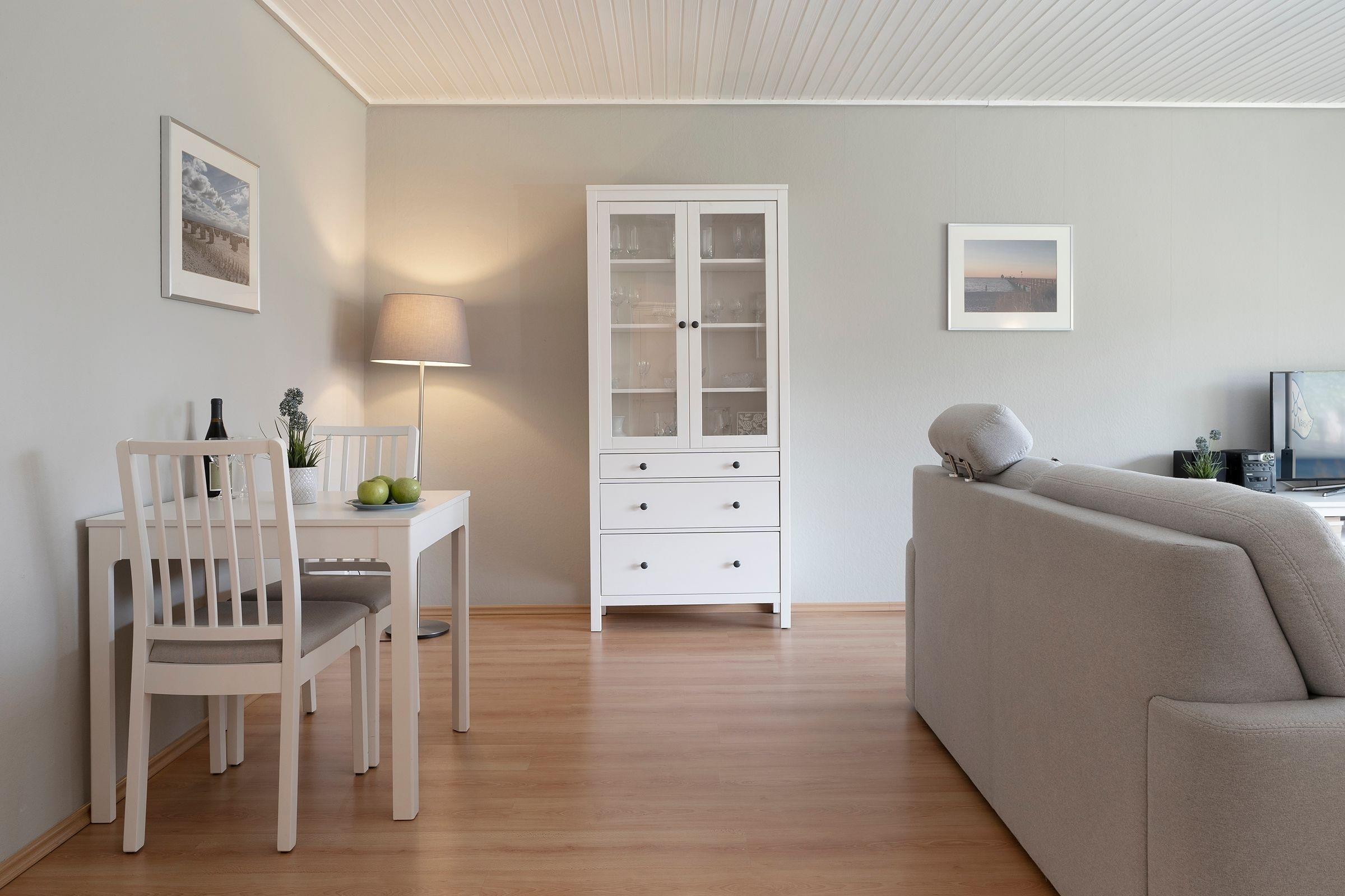 Mit gemütlichem Wohnzimmer, separater Küche, Duschbad mit beheizbarem Handtuchhalter und Waschmaschine, separatem Schlafzimmer mit komfortablem Doppelbett (2x 90x200cm) und Kleiderschrank, sowie eigener möblierter Terrasse mit Sonnenliegen und eingezäuntem Garten bietet dieses Domizil auf ca. 56m² auf großzügige Weise Platz und Komfort für bis zu 2 Personen. Außenjalousien, Plissees und Vorhänge sorgen für Verdunklung und erholsamen Schlaf.
