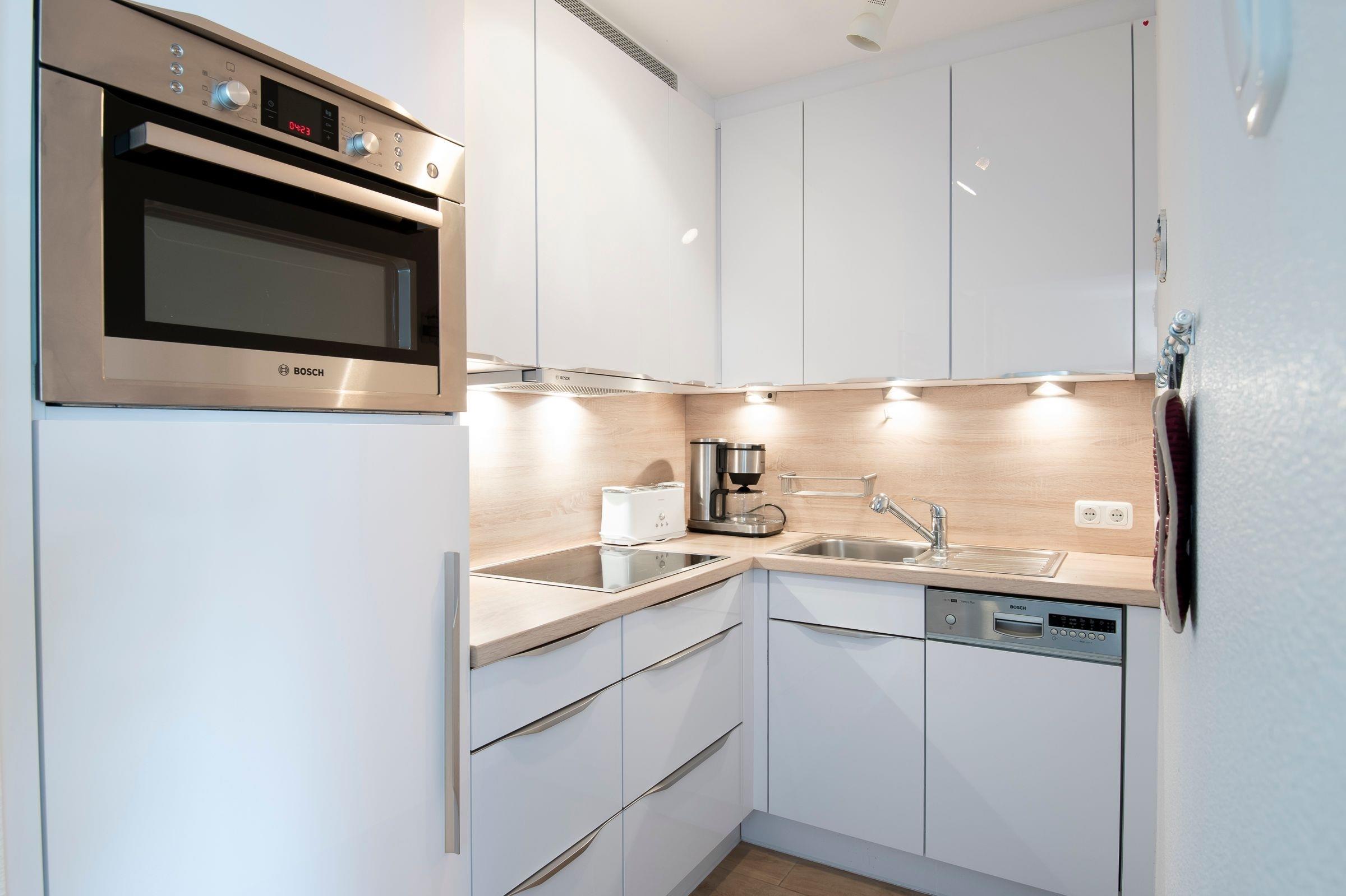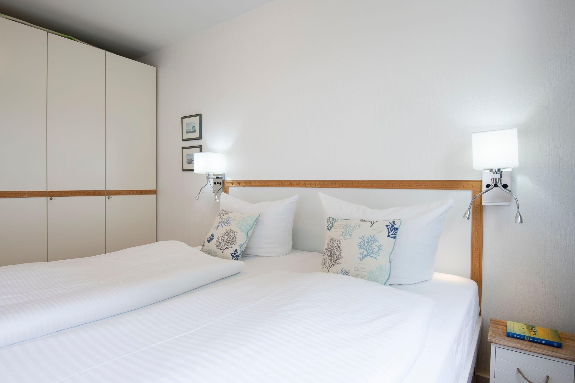 Lichtdurchflutet und hell begrüßt Sie der Wohnraum mit integriertem Essbereich. Eine komfortable Sofaecke und ein Flachbild-TV sorgen nach langen Strandspaziergängen für Entspannung. Über einen kostenlosen WLAN-Anschluss bleiben Sie auch im Urlaub für Ihre Lieben erreichbar. Vom Wohnzimmer führt ein direkter Zugang auf den möblierten Balkon mit seitlichem Blick Richtung Ostsee, eine Markise schützt hier an Sommertagen vor zu starker Sonne. In der kleinen separaten Küche (offene Tür) sind von der Mikrowelle, über den Backofen und den 4-Plattenceranherd diverse Alltagshelfer vorhanden und die Spülmaschine erledigt den Abwasch. Das größere der beiden Schlafzimmer ist mit einem Doppelbett (2x90x190cm), das zweite Schlafzimmer ist mit einem Etagenbett (je 90x200cm) ausgestattet. In beiden Schlafräumen sorgen Außenjalousien für angenehme Verdunklung und erholsamen Schlaf. Das geschmackvolle Designbad sorgt mit Wohlfühlausstattung wie Dusche, WC und Waschtisch mit Schminkspiegel gleich morgens für gute Laune.