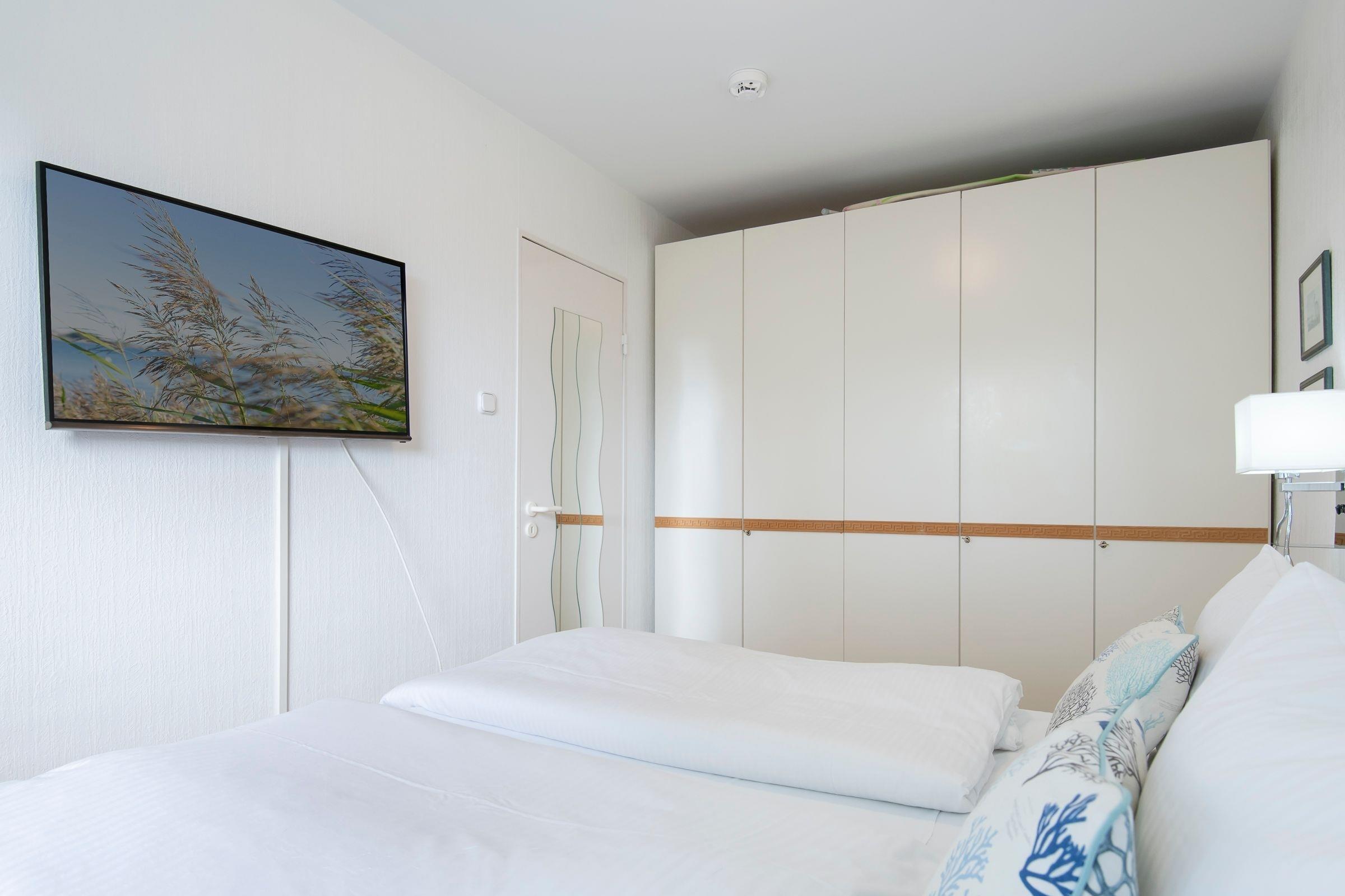 Schlafzimmer 1: 1 Doppelbett (2x 90x190 cm), Kleiderschrank, Außenjalousien