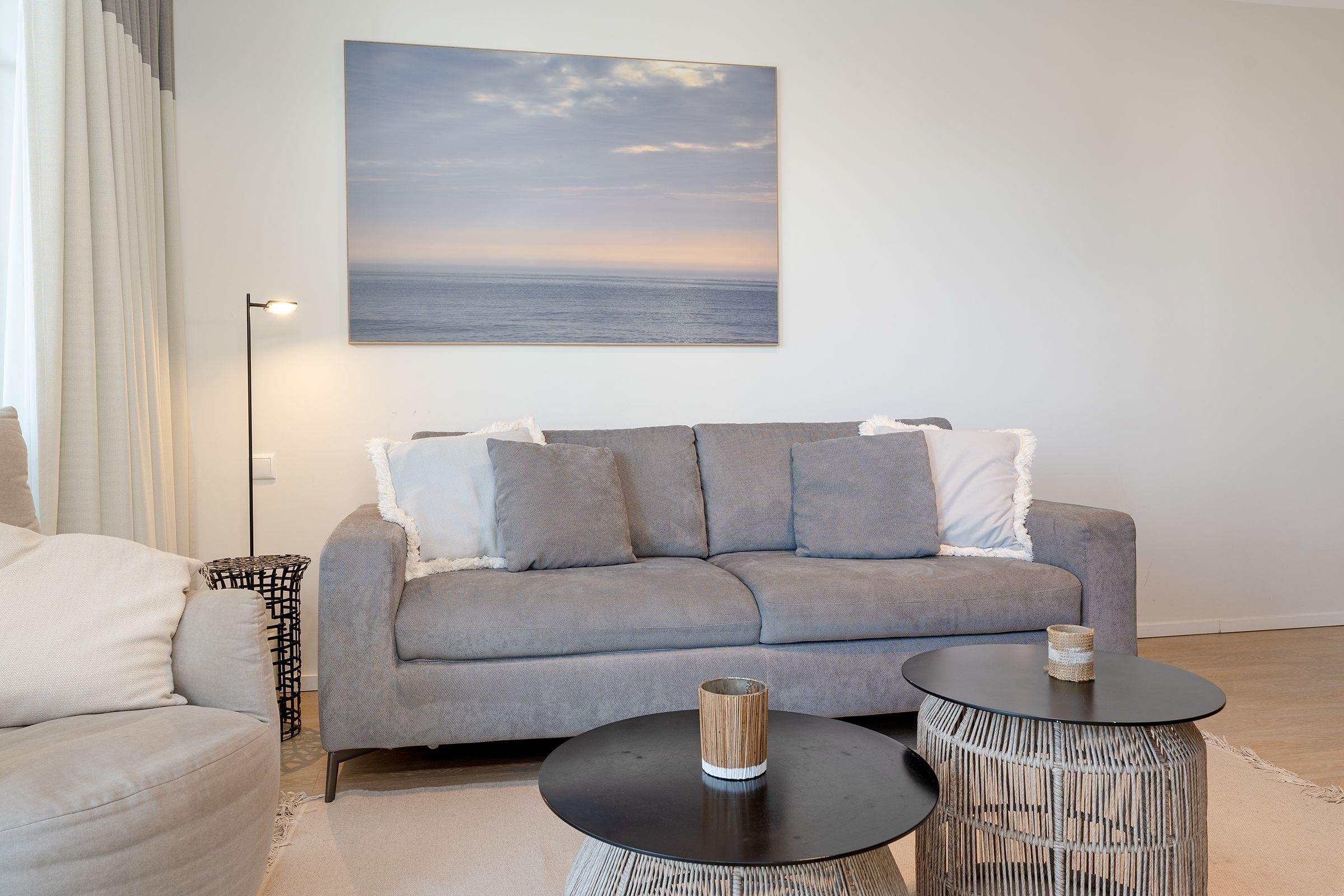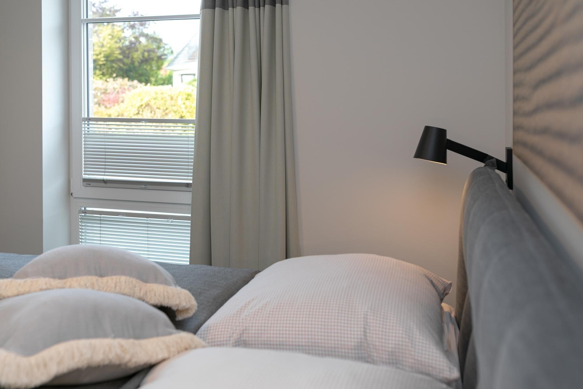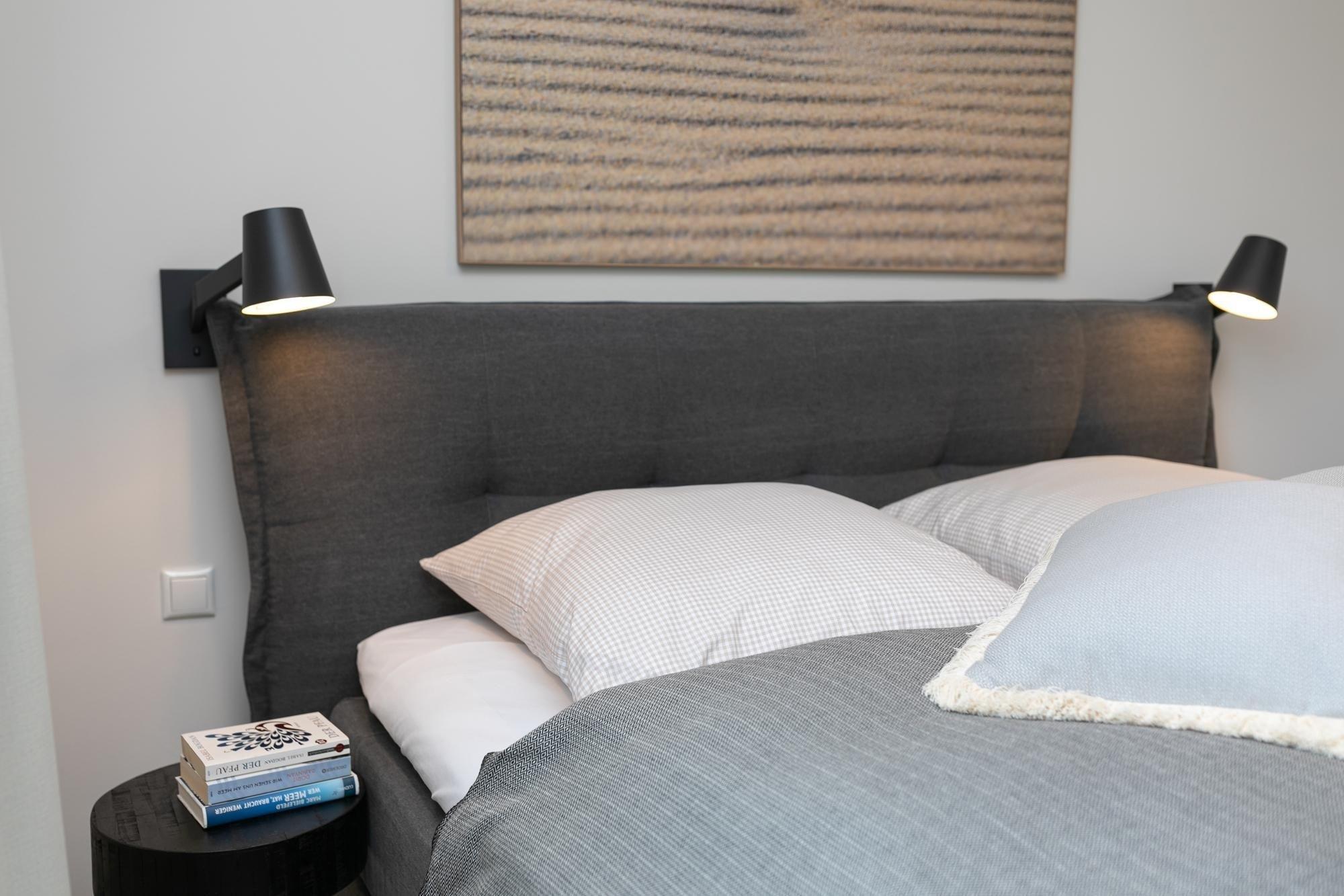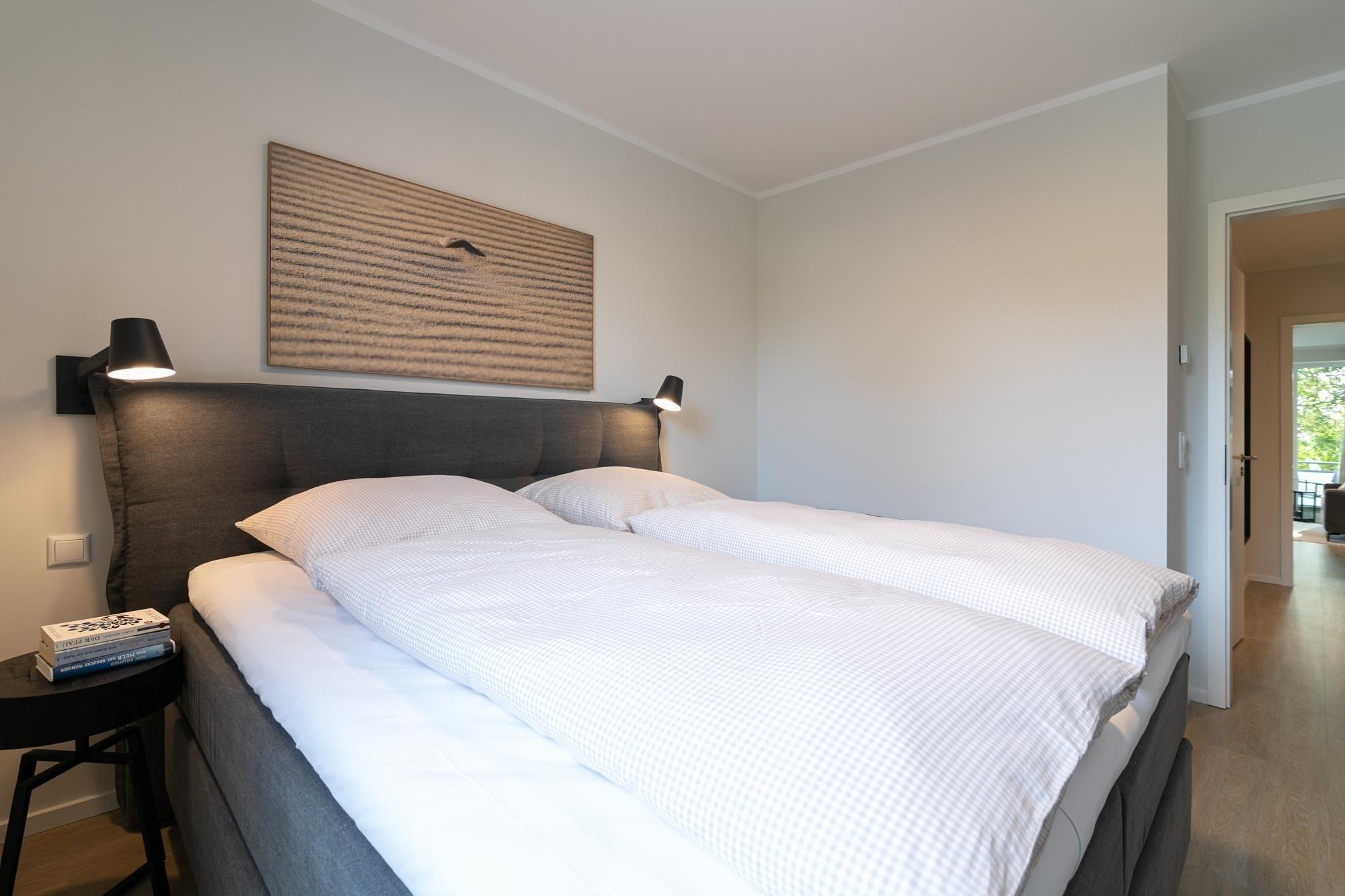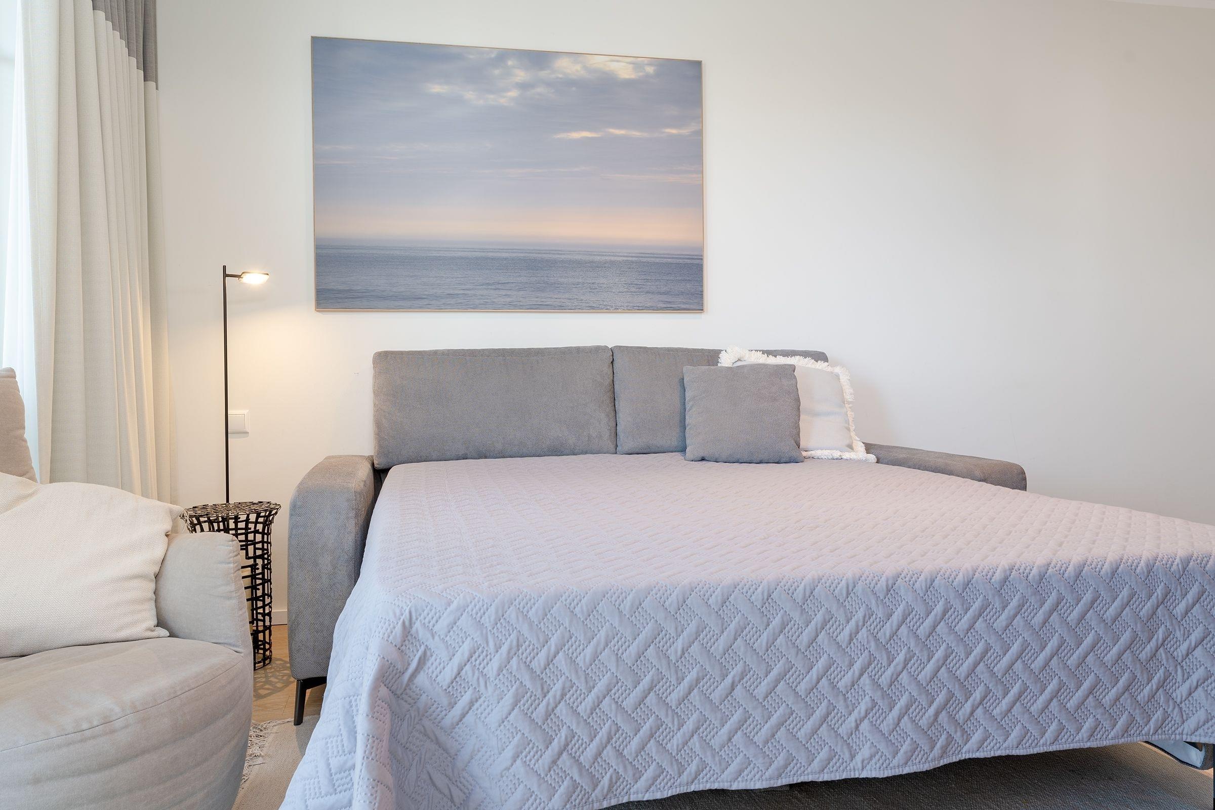 Das stilsichere Ferienobjekt verfügt über ein separates Schlafzimmer mit Doppelbett (durchgehender Topper 180x200cm), einen offen gestalteten Wohn-/Schlafraum mit hochwertiger Schlafcouch (Liegefläche 160x200cm), Sitzecke, TV und clever integrierter Küchenzeile inkl. Essplatz sowie einen möblierten Balkon mit saisonal bedingtem Meerblick (im Winterhalbjahr). Fußbodenheizung sorgt im gesamten Logis für wohlige Wärme, das geschmackvolle Bad überzeugt mit bodentiefer Dusche und beheizbarem Handtuchhalter, Plissees sorgen für angenehme Verdunklung. Lässiger Komfort verbunden mit Wohlfühlambiente und hochwertiger Ausstattung.