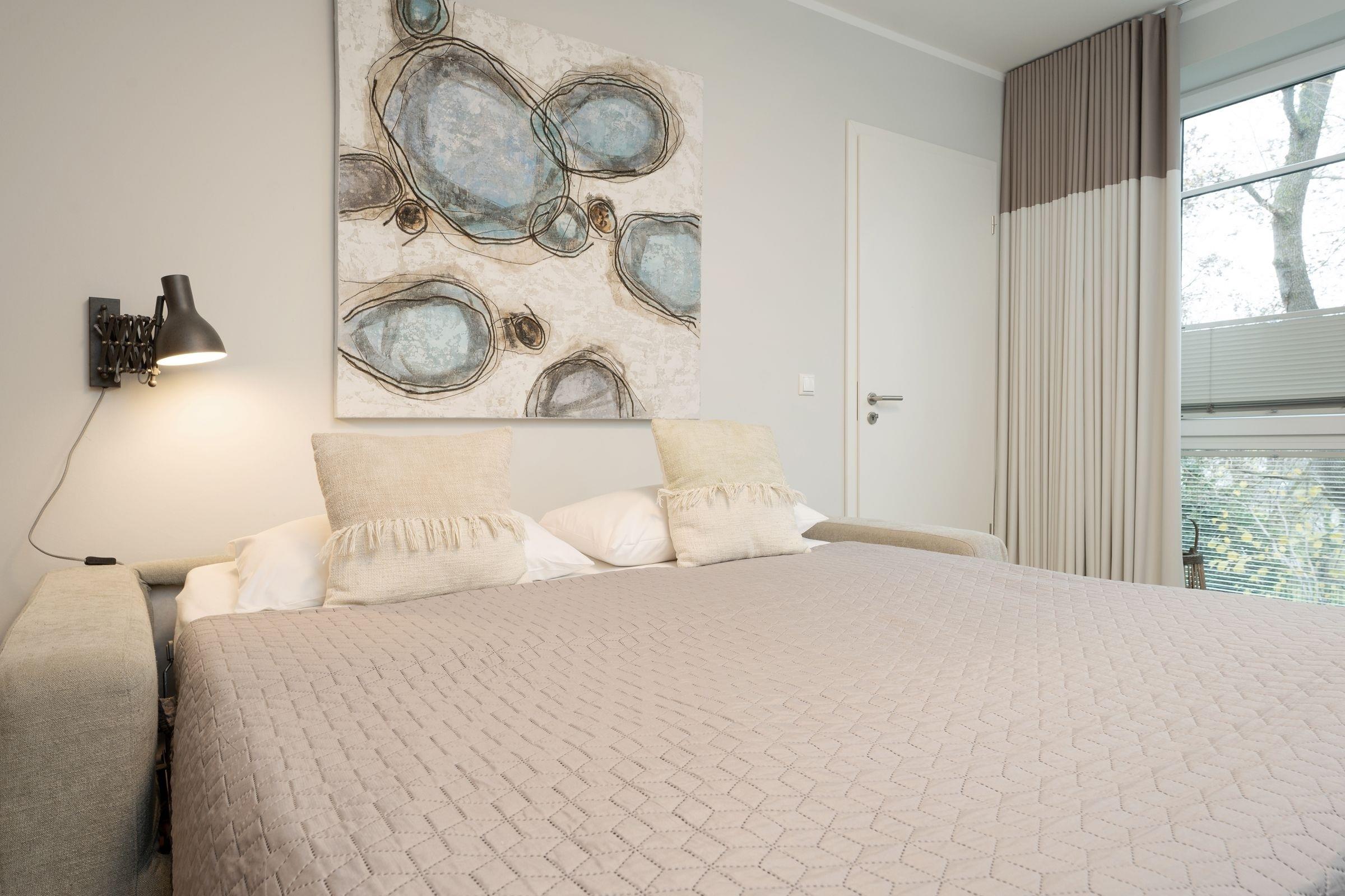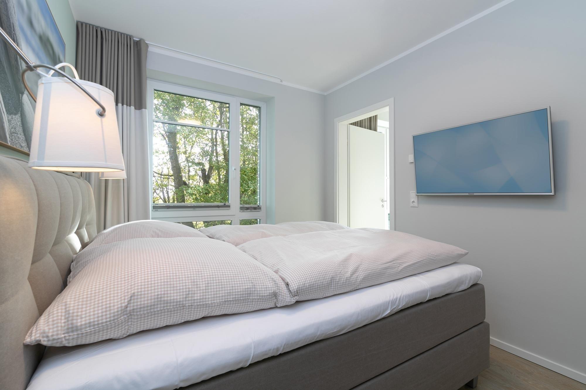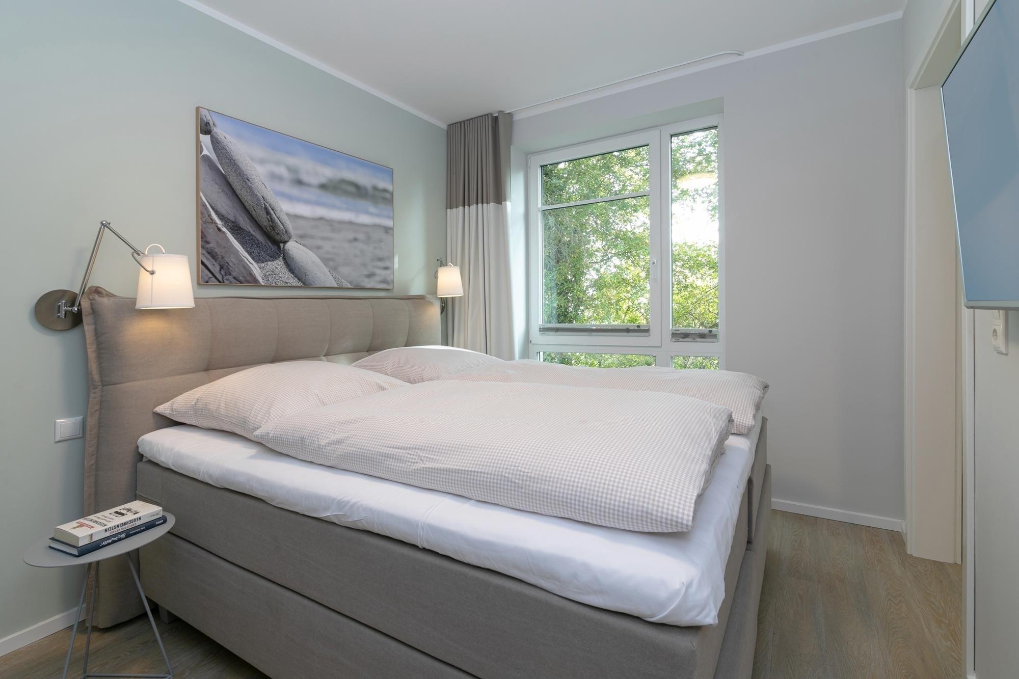 Schlafzimmer: 1 Boxspring-Doppelbett (2x 90x200 cm), durchgehender Topper, TV, Kleiderschrank, Verdunkelung (Plissees, Gardinen)