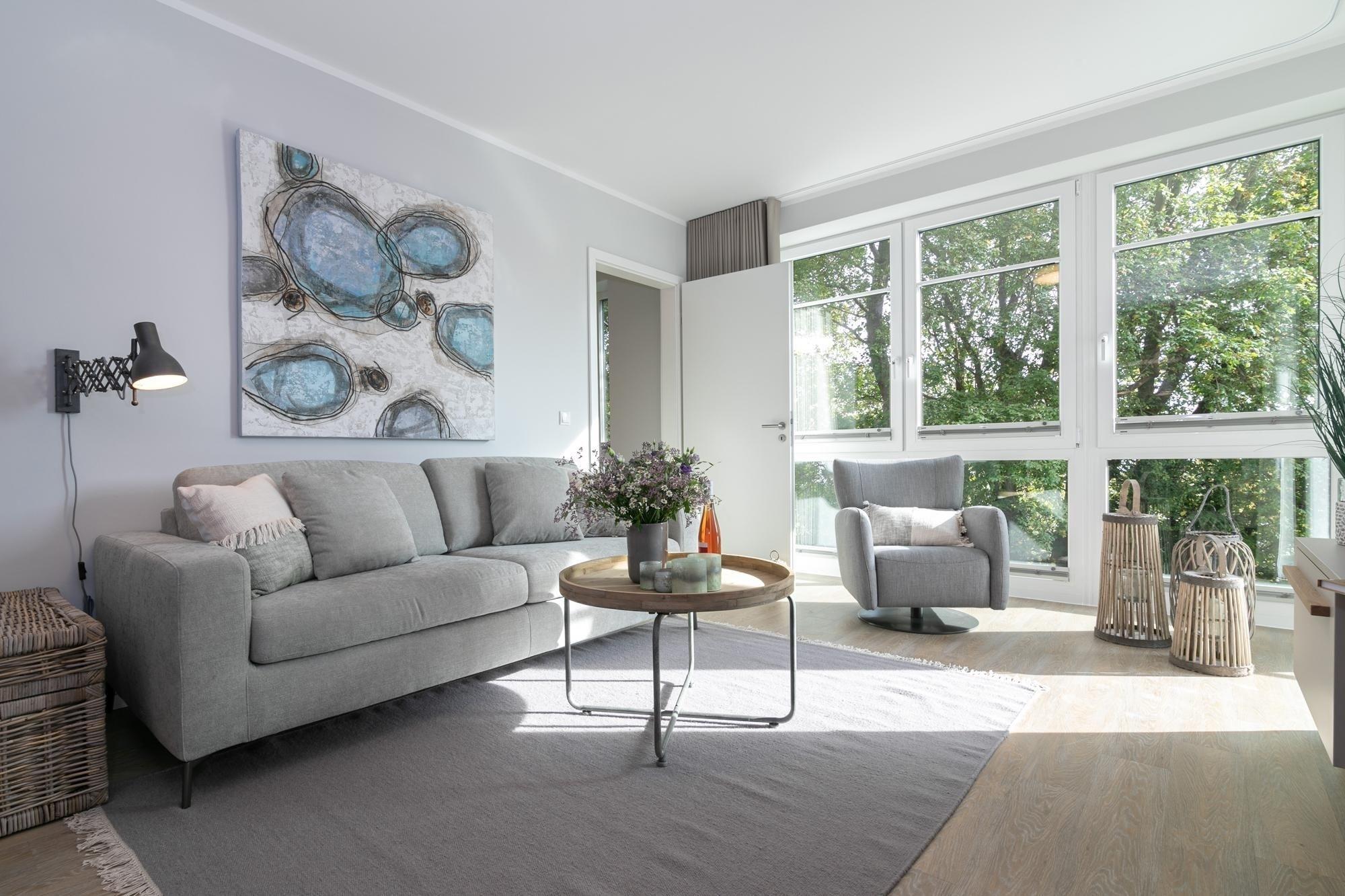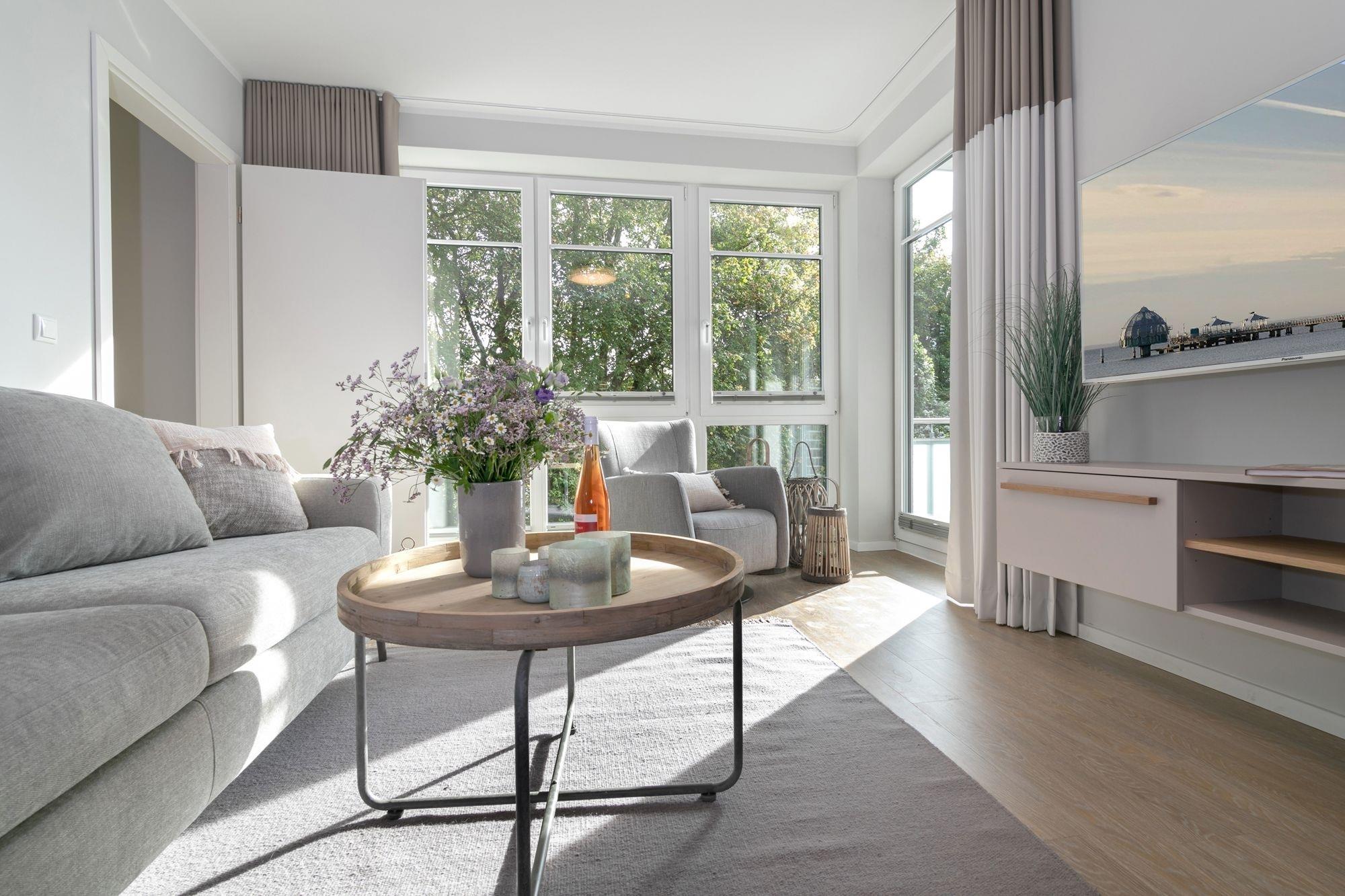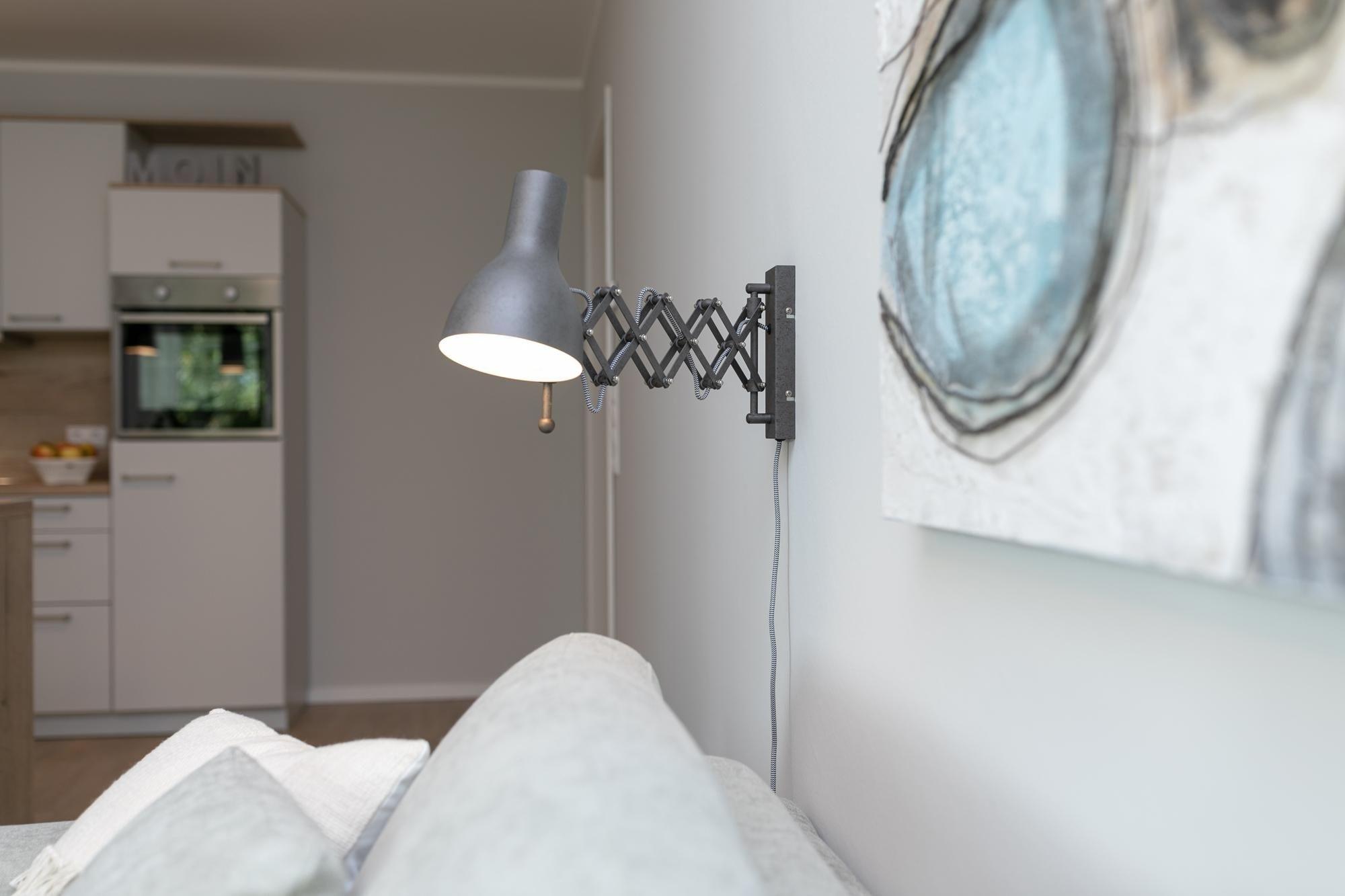 Die moderne Wohnung verfügt über ein separates Schlafzimmer mit Doppelbett (180x200 cm, durchgehender Topper) sowie einen offen gestalteten Wohn-/Schlafraum mit hochwertiger Schlafcouch (Liegefläche 160x200 cm), Sitzecke, TV und clever integrierter Küchenzeile inkl. Essplatz. Auch gehört ein möblierter Balkon dazu. Fußbodenheizung sorgt im gesamten Logis für wohlige Wärme, das geschmackvolle Bad überzeugt mit bodentiefer Dusche und beheizbarem Handtuchhalter, Plissees bieten eine angenehme Verdunklung. Lässiger Komfort verbunden mit Wohlfühlambiente und hochwertiger Ausstattung.