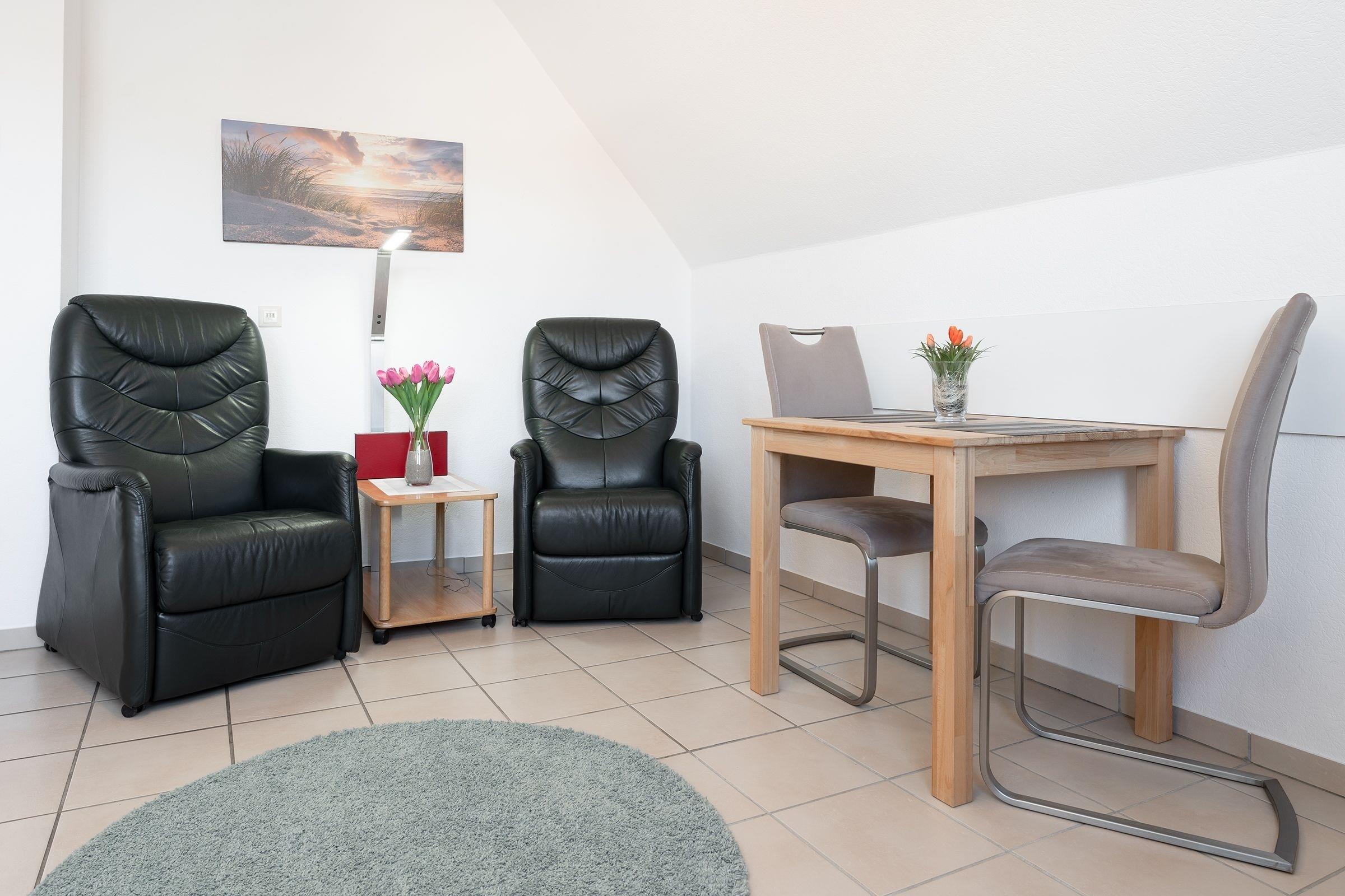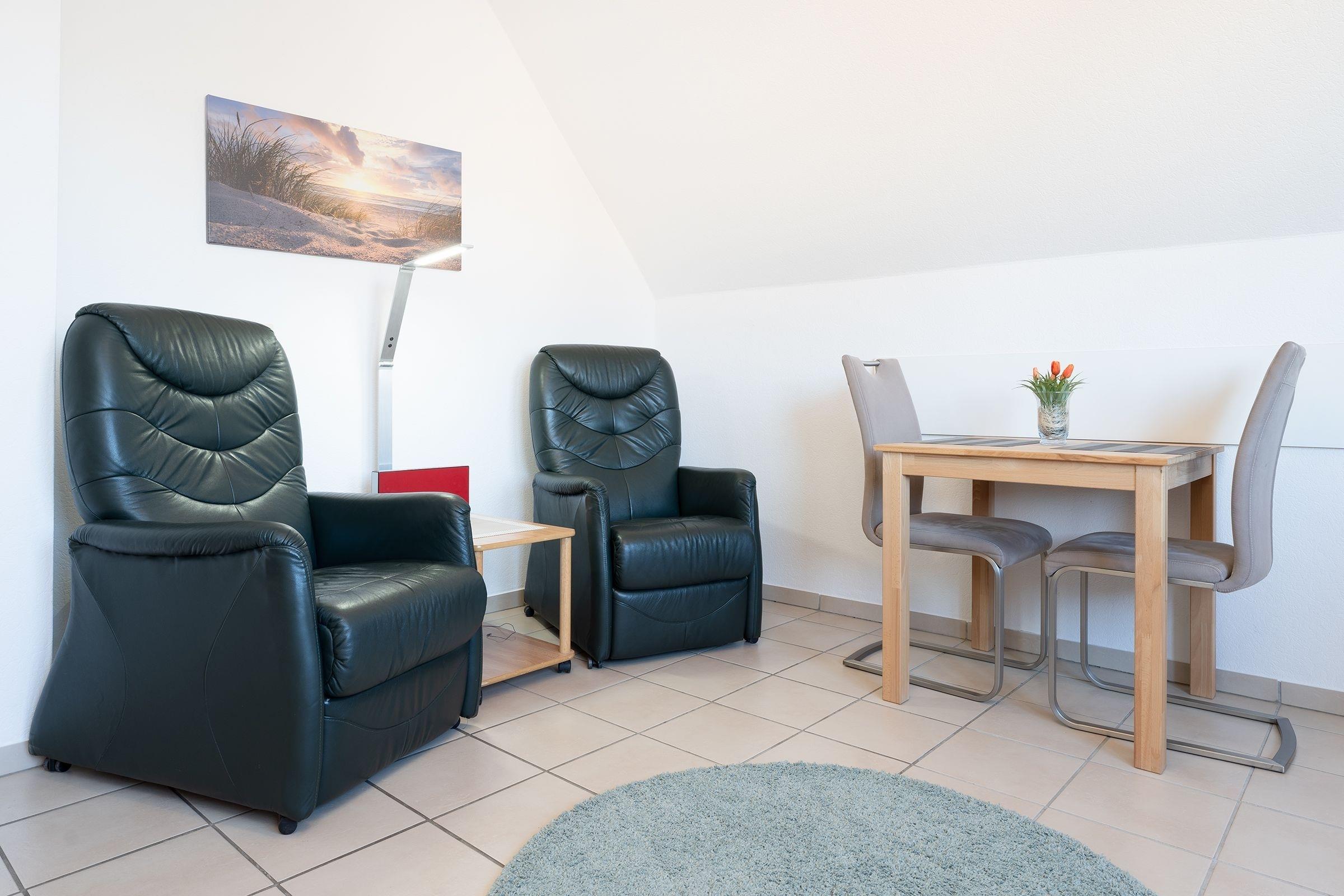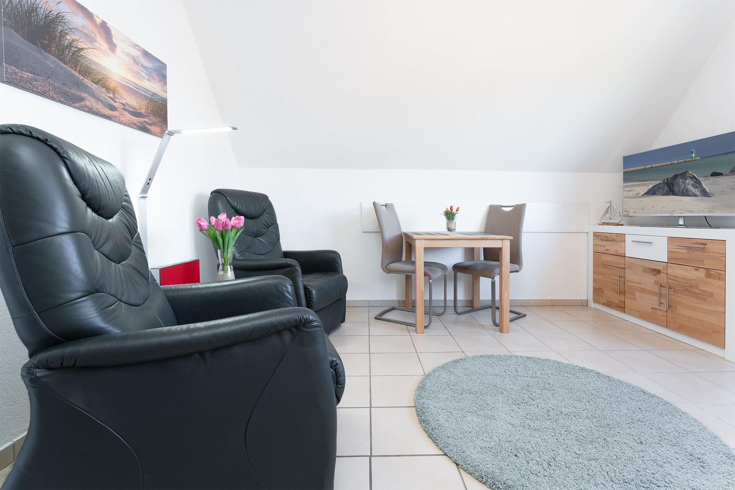 Das Wohnzimmer ist mit zwei bequemen Leder TV Sesseln, die in Liegeposition verstellbar sind, Essplatz für 2 Personen, und TV hell und gemütlich eingerichtet. Vom Wohnbereich führt ein direkter Zugang auf den großzügigen, möblierten Balkon. Die moderne Küche ist mit Annehmlichkeiten wie Cerankochfeld, Backofen, Kühlschrank, Spülmaschine, sowie Mikrowelle gut ausgestattet. Das separate Schlafzimmer verfügt über ein bequemes Doppelbett (2x 90x200 cm) und einen geräumigen Kleiderschrank. Das tageslichthelle Badezimmer bietet Dusche, WC und Waschmaschine. Das gesamte Domizil ist mit Fliesen ausgelegt, Fußbodenheizung sorgt für wohlige Wärme.