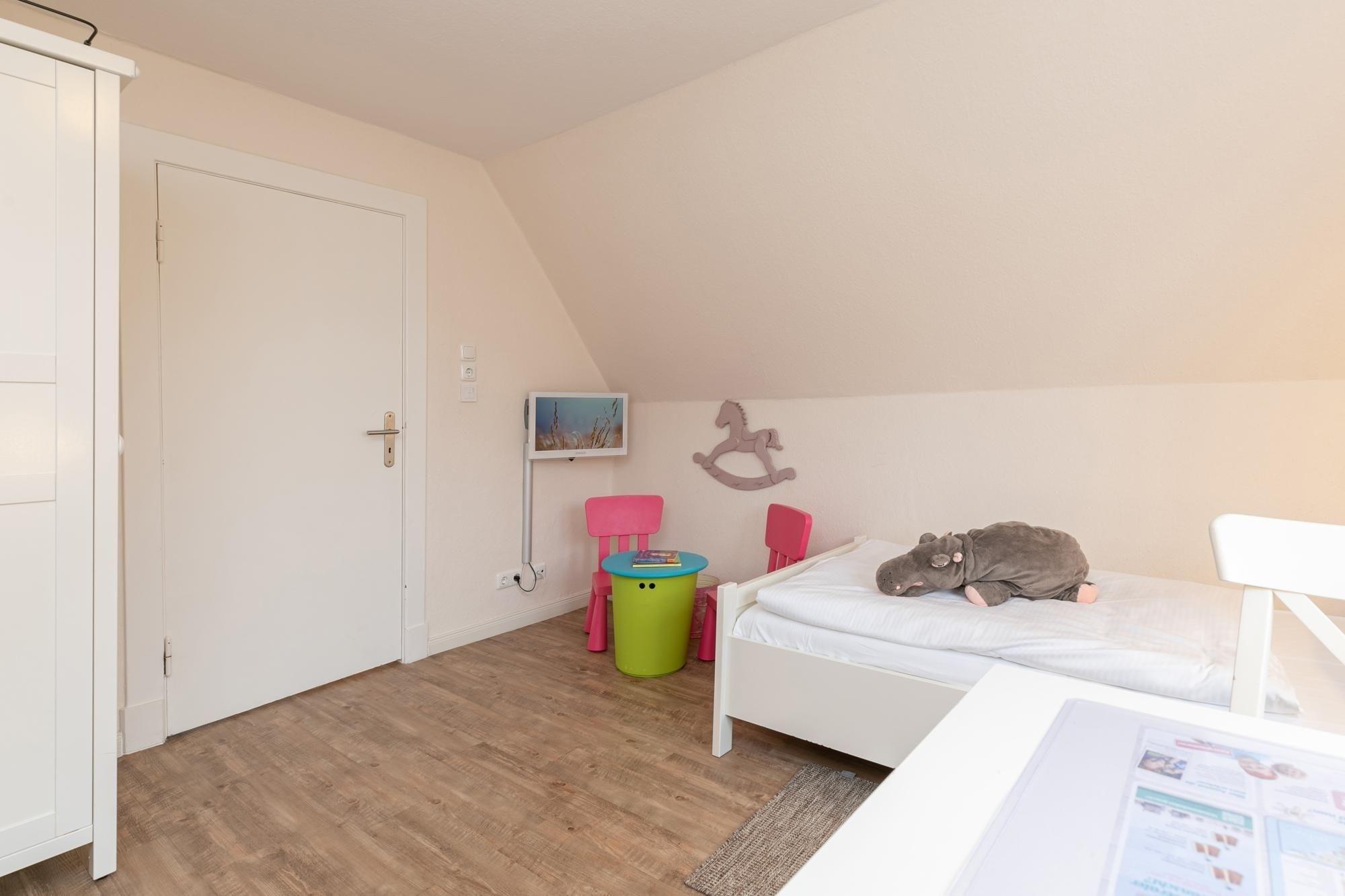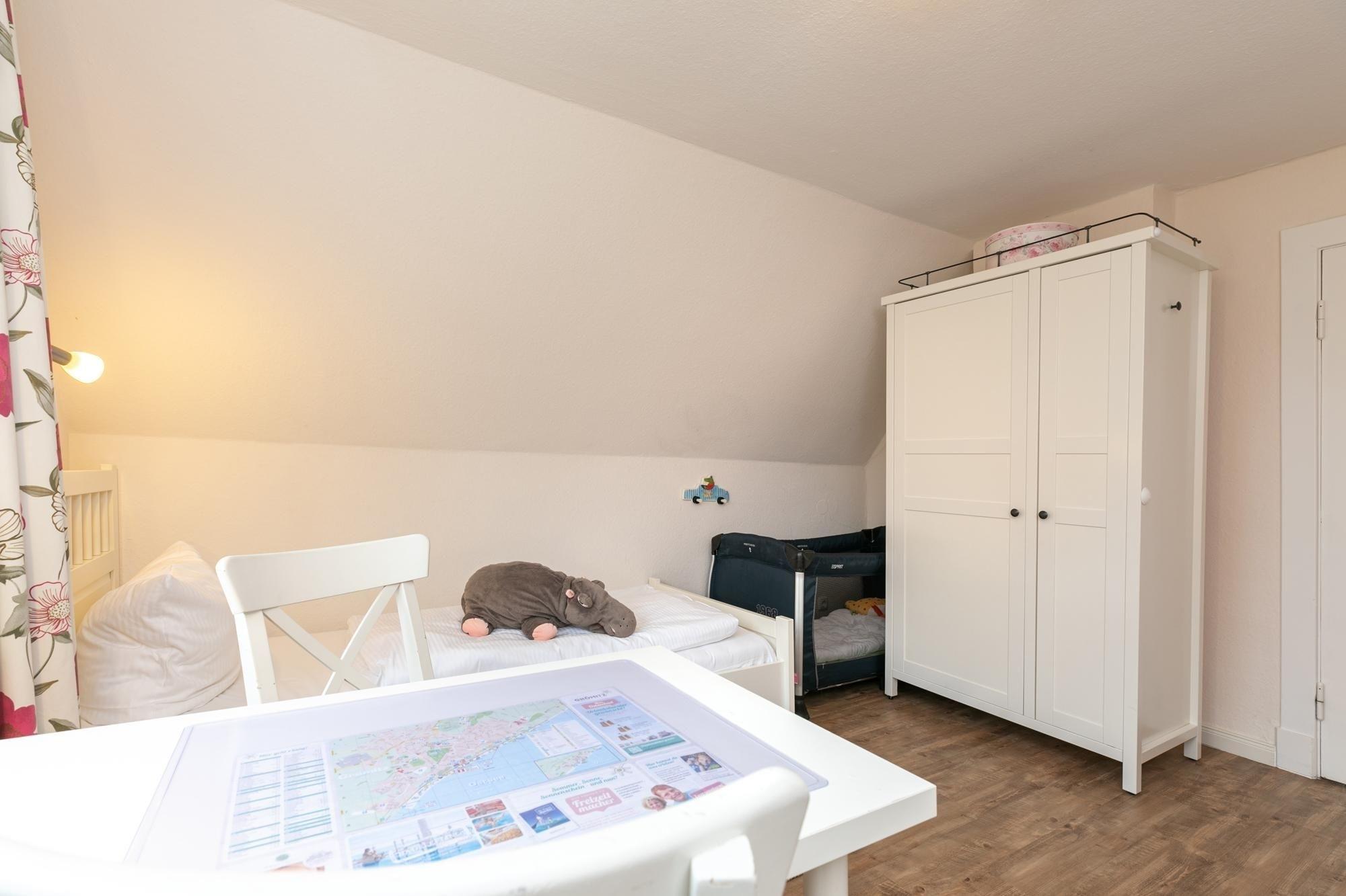 Schlafzimmer 2: 2 Einzelbetten (2x 90x200 cm), TV, Kleiderschrank, Platz für eine Kinderreisebett, Verdunkelung (Außenrolllade)