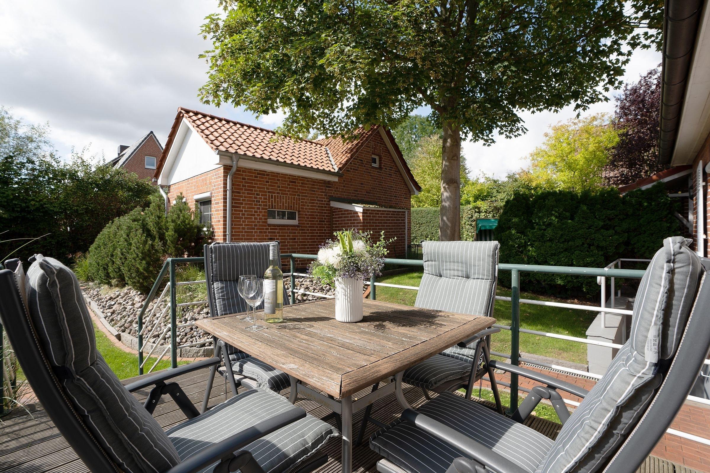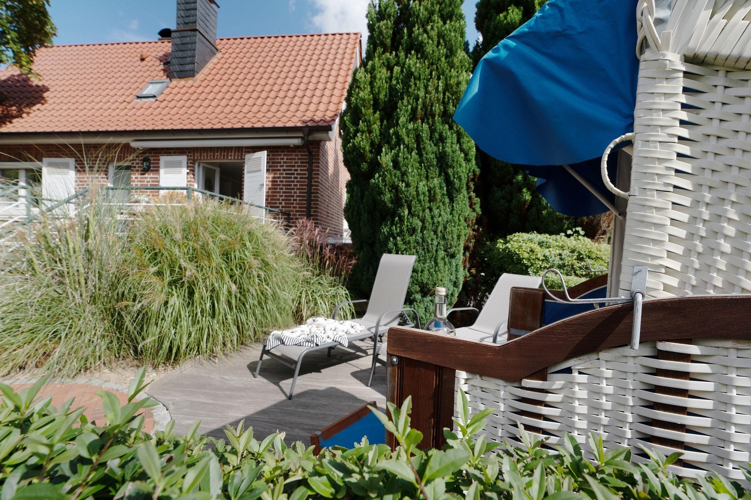 Moderne Ferienwohnung in Grömitz mit Terrasse, Kamin und Strandkorb, nur wenige Gehminuten vom Ostseestrand entfernt.