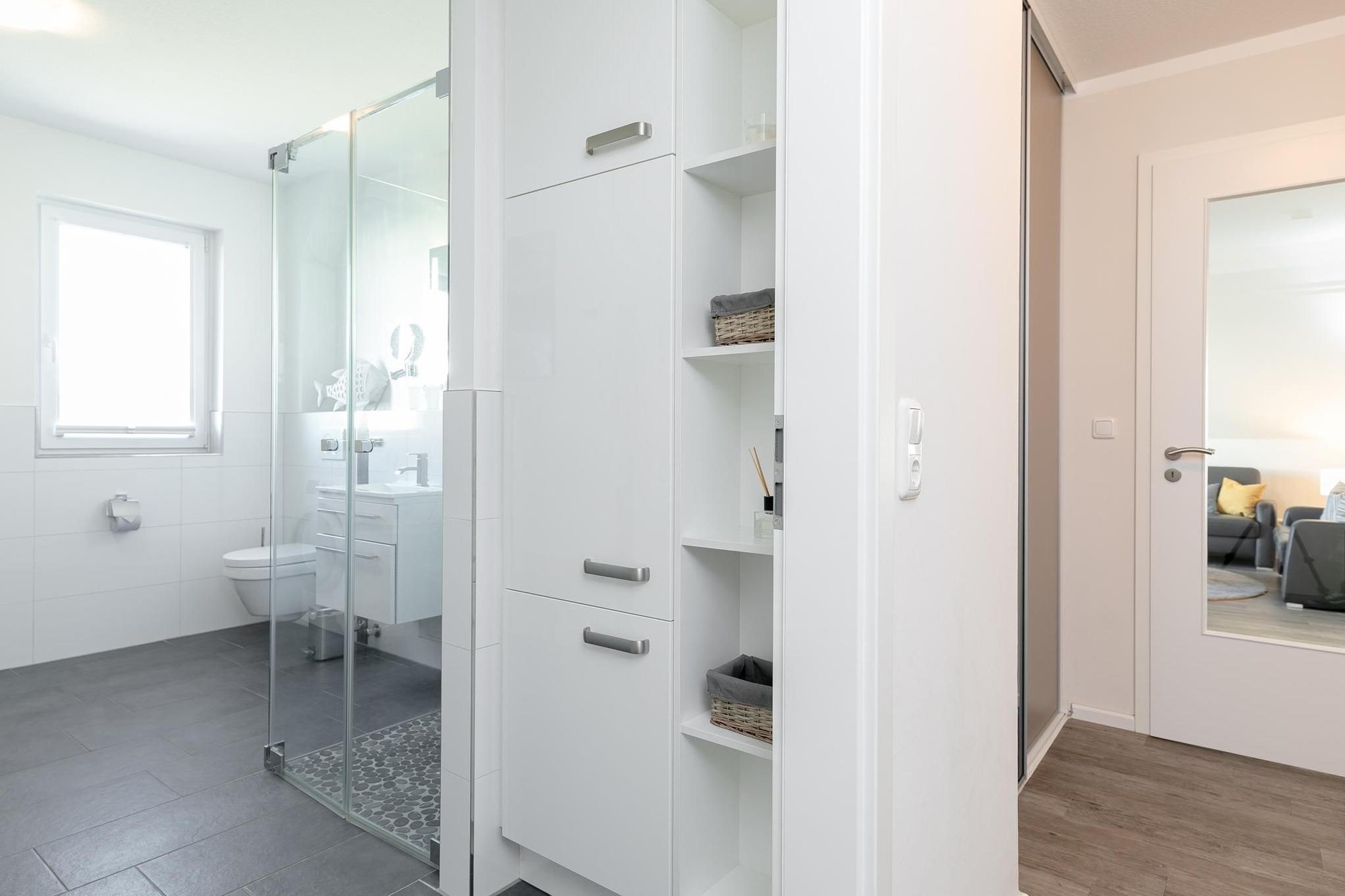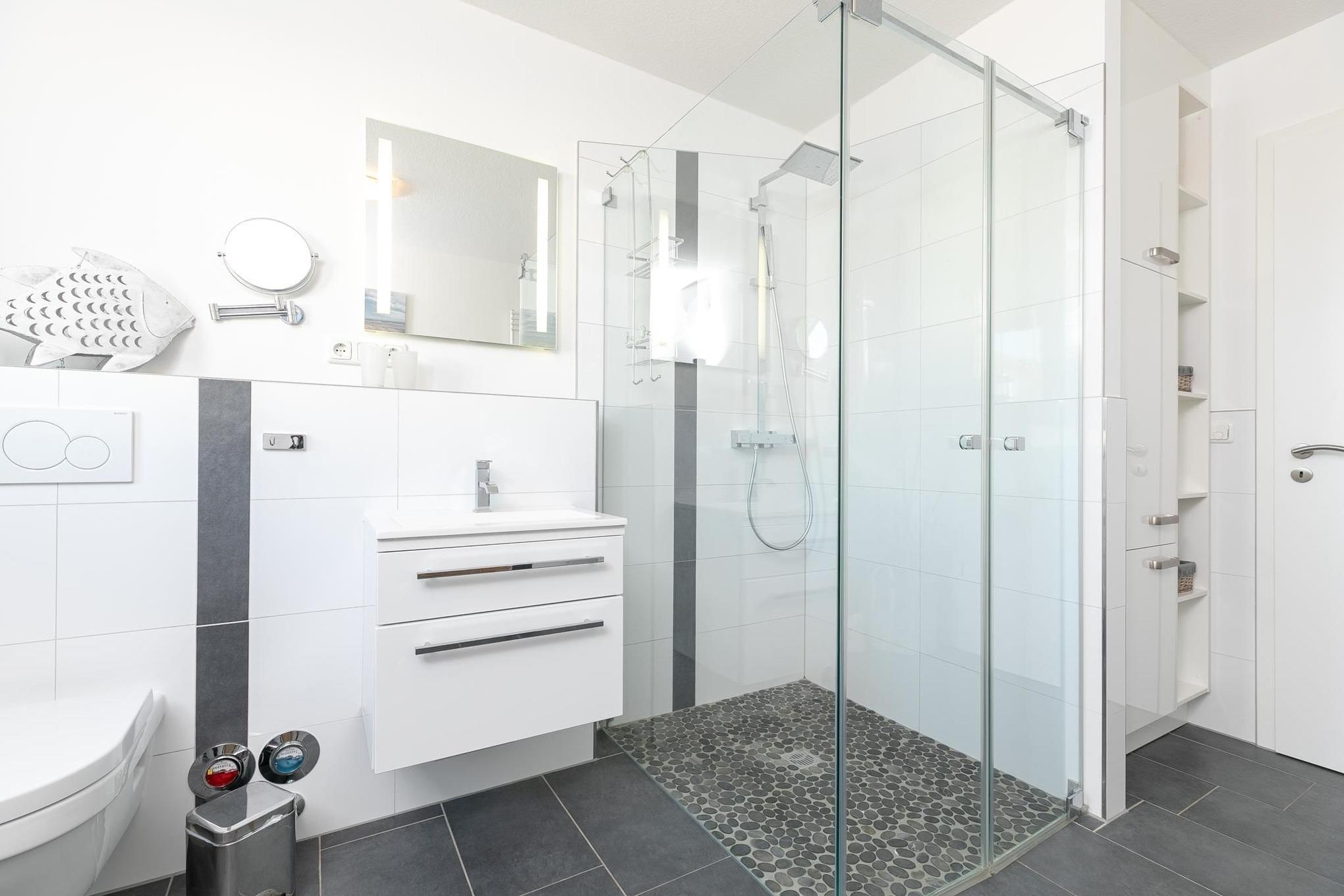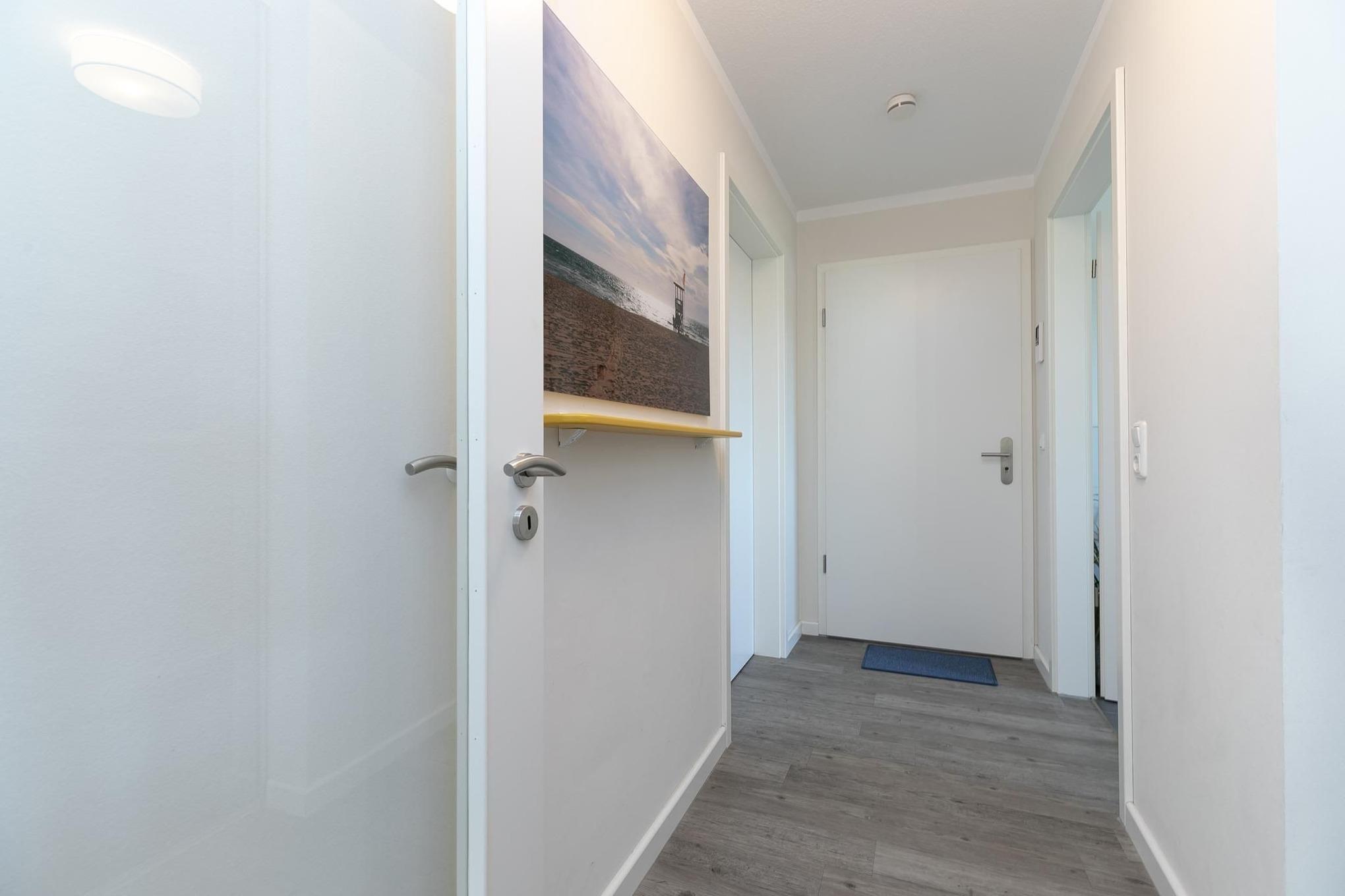 Vom Flur aus geht es zu einem der Wohlfühlbäder, ausgestattet mit ebenerdiger Dusche, Waschtisch, WC, beheizbarem Handtuchhalter, Kosmetikspiegel und praktischem Waschtrockner. Gegenüber liegt ein herrliches Schlafzimmer, ausgestattet mit komfortablem Boxspringbett (180x200cm), Flachbild-TV, sowie begehbarem Kleiderschrank. Das Herzstück der Wohnung ist der lichtdurchflutete Wohnbereich mit offener Küche und Essplatz für bis zu 6 (+1) Personen. Ein direkter Zugang führt auf den möblierten Balkon mit Südostausrichtung. In der gemütlichen Sofaecke mit Flachbild -TV, Desktopaudiosystem und DVD-Player ist für gute Unterhaltung gesorgt.