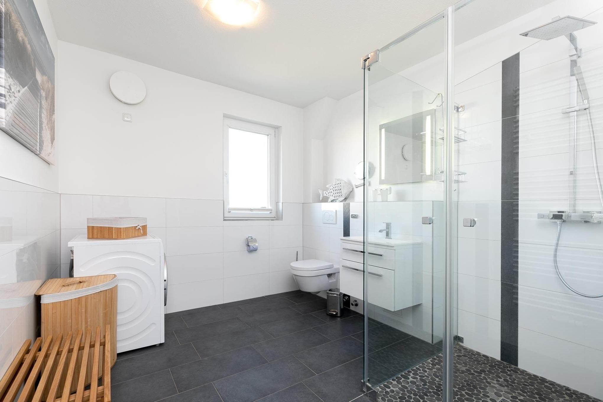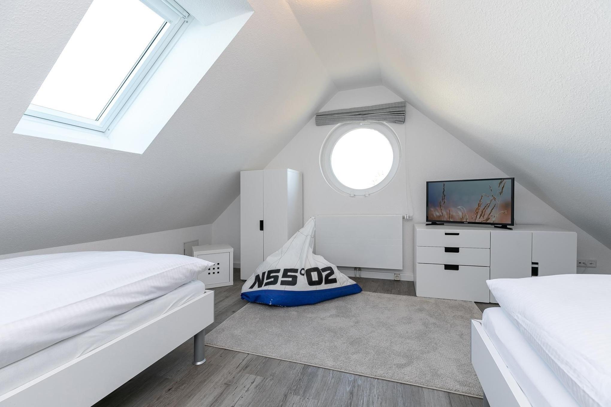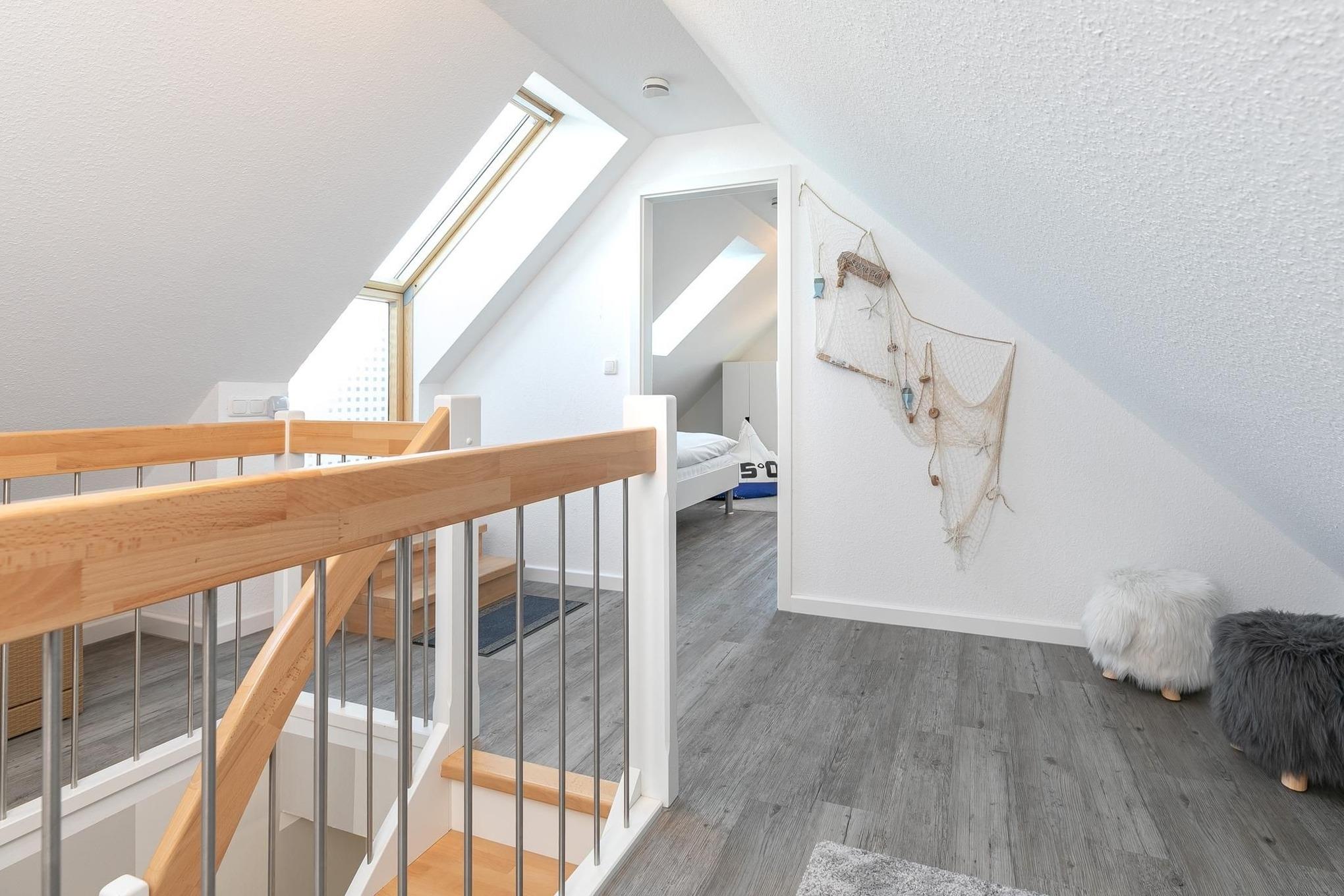 Eine Treppe führt schließlich in den oberen Bereich Ihres Feriendomizils, wo sich ein drittes Schlafzimmer mit 2 Einzelbetten (je 90 x 200cm), Kleiderschrank, Kommode und Flachbild-TV befindet. Ein weiteres Badezimmer mit WC, Waschbecken, Kosmetikspiegel und Badewanne sorgt für einen frischen Start in den Tag. Und nun zu einem weiteren Highlight – drei Treppenstufen führen vom Flur direkt auf eine atemberaubende Dachterrasse mit schönstem Panoramablick über Grömitz, hochwertigen Loungemöbeln und gemütlichem Strandkorb. Für die kleinen Gäste steht eine Spielecke mit Lego Duplo und Smartmax - Magnetbausteinen bereit.