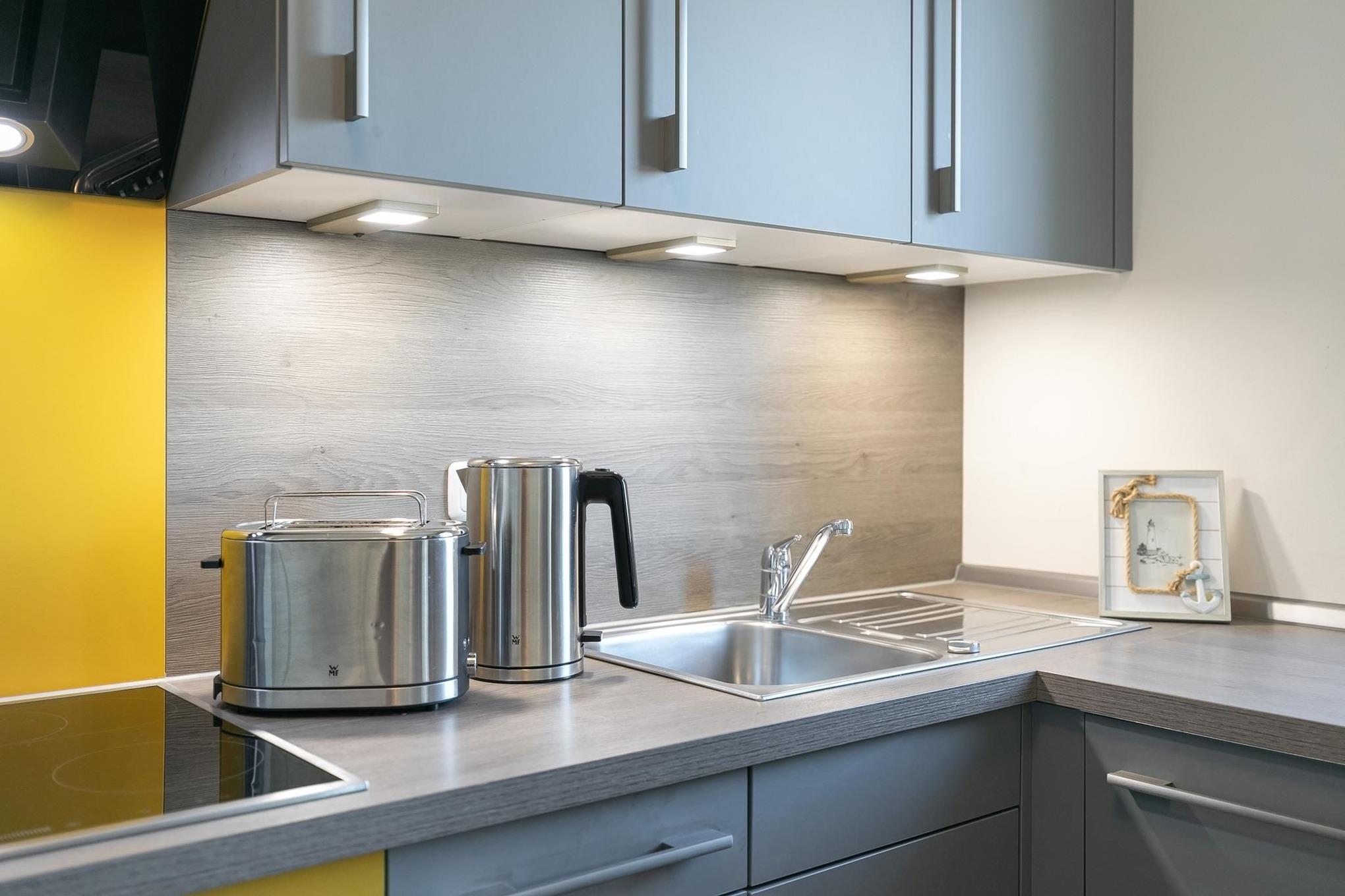 Die elegante Küche lässt mit diversen Annehmlichkeiten wie einem Backofen, Induktionskochfeld, einer Senseo-Padmaschine , Mikrowelle und Spülmaschine kaum Wünsche offen. Abgehend vom Wohnbereich liegt ein weiteres Schlafzimmer, ebenfalls mit bequemen Boxspringbett (180x200cm), Flachbildfernseher und Kleiderschrank ausgestattet und zudem sogar mit eigenem Balkon mit Südwestausrichtung, so dass Sie die Abendsonne genießen können. Purer Luxus!