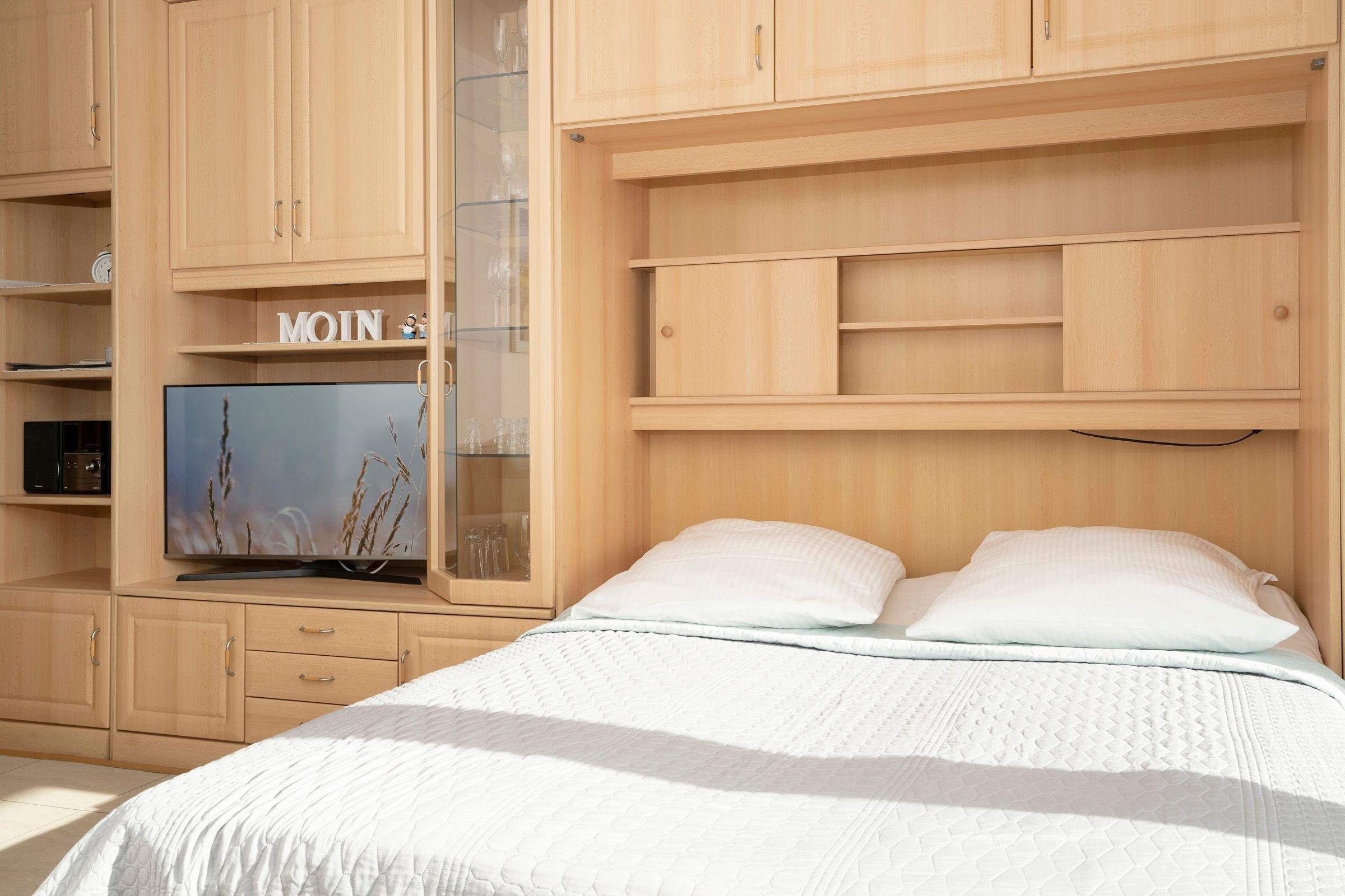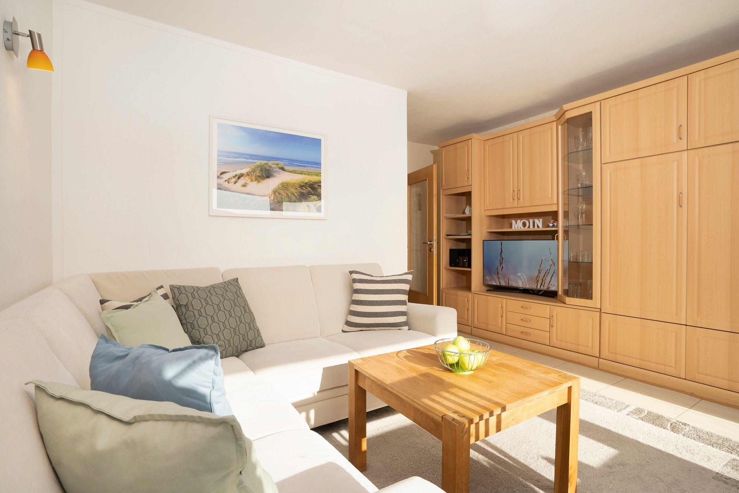 Im Wohnzimmer befindet sich eine Schrankwand mit herausklappbaren Schrankbetten (2x 90x190cm) und ein Essplatz für 4 Personen. Ein moderner TV-Flachbildschirm sowie ein MP3/USB-CD-Radio stehen zur Unterhaltung zur Verfügung. Das Wohnzimmer lässt sich durch eine Außenjalousie verdunkeln. Die Wohnung hat ein separates, komfortables Schlafzimmer mit einem Doppelbett (2x 90x190cm), einem Einbaukleiderschrank, einer Kommode und zwei Nachttischen. Das Fenster lässt sich auch hier vollständig durch Außenjalousie verdunkeln. Die moderne Küche mit separatem Fenster umfasst eine gute Ausstattung, wie z.B. ein 4-Platten-Cerankochfeld und ein Umluft Backofen. Kaffee-Filtermaschine und PAD-Maschine, Eierkocher, Toaster, Wasserkocher sowie eine Spülmaschine gehören ebenso dazu. Das hell geflieste Tageslichtbad mit Außenfenster ist mit Dusche, WC und Waschbecken ausgestattet. Die Wohnung ist vollständig mit einem pflegeleichten und hygienischen PVC-Fußboden ausgestattet.