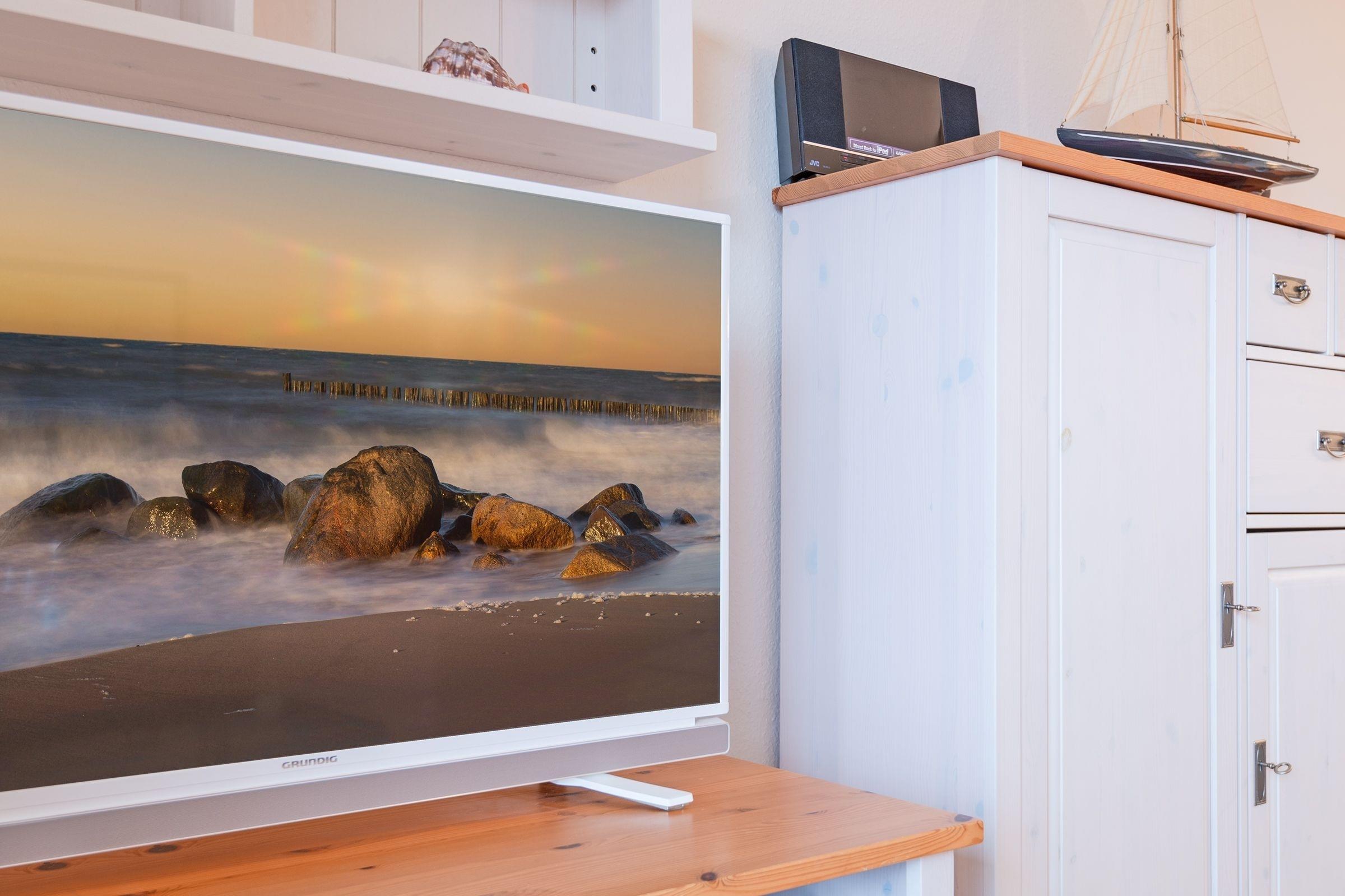 Vom Wohnzimmer mit gemütlicher Couch, TV, sowie CD-Player und Radio gelangen Sie auf den ca. 8m² großen Balkon mit Markise und traumhaftem Meerblick. Hier könnte Ihr Tag mit heißem Kaffee und leckerem Frühstück starten.