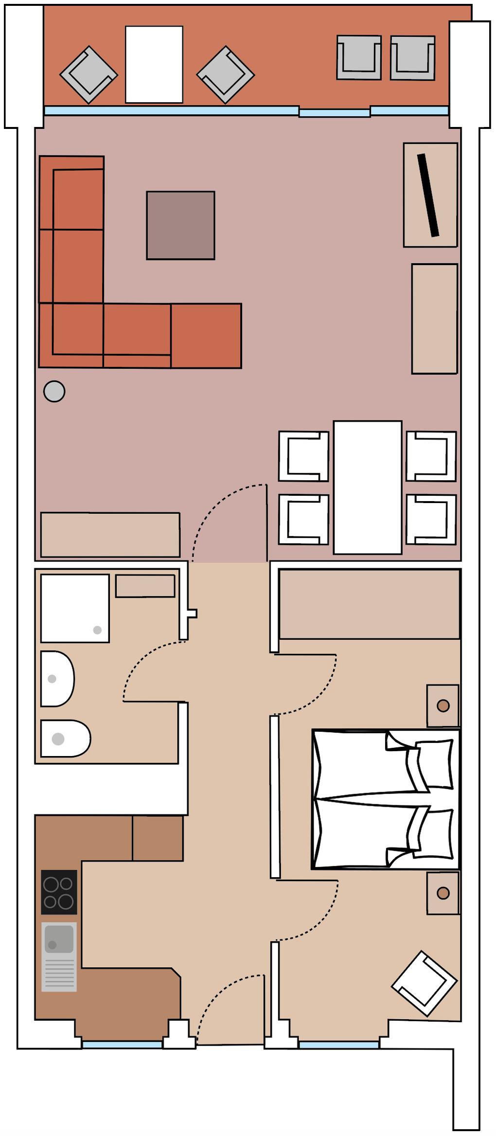 Diese Ferienwohnung für 2 Personen hat ca. 58 m², verteilt auf 2 Zimmer plus Bad und Balkon.