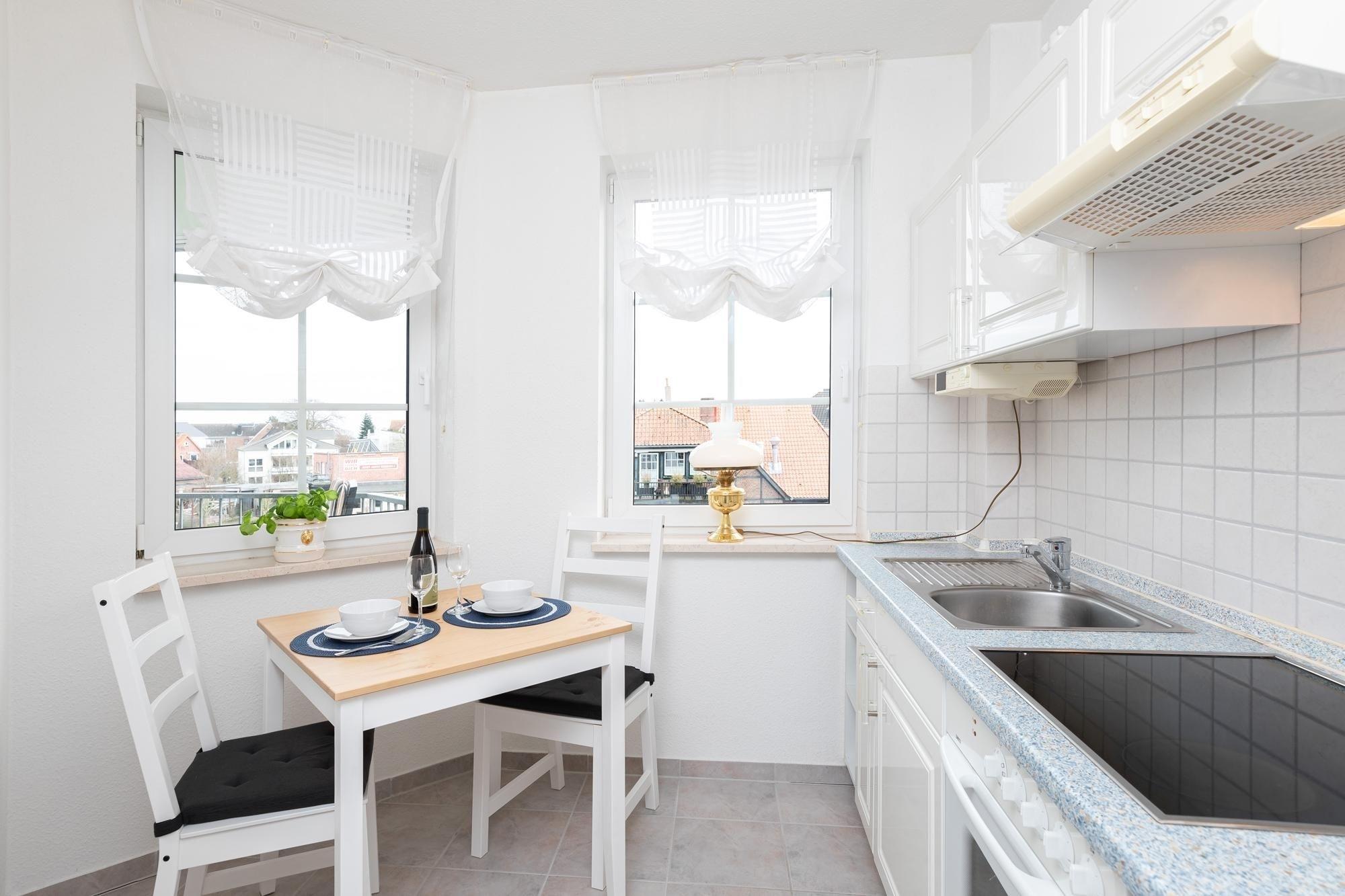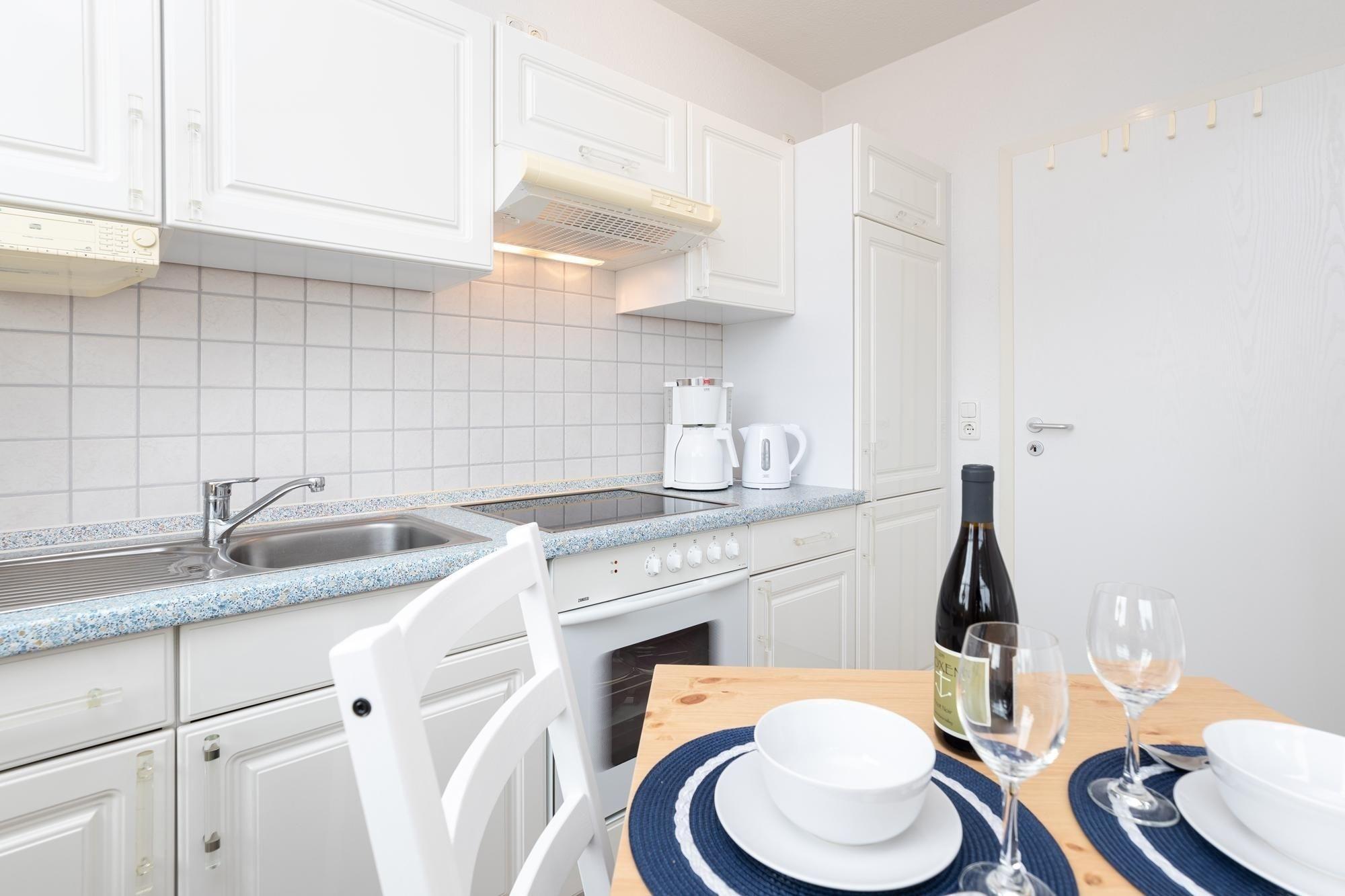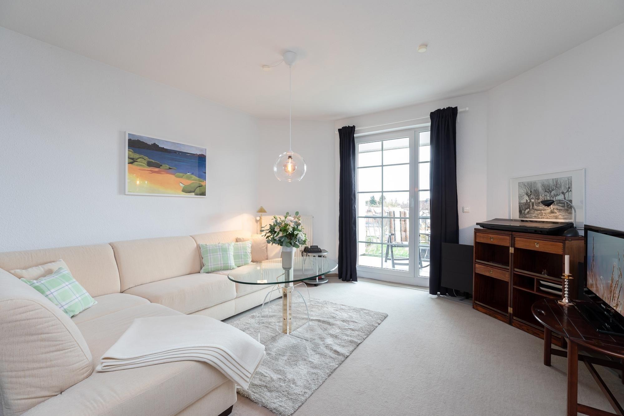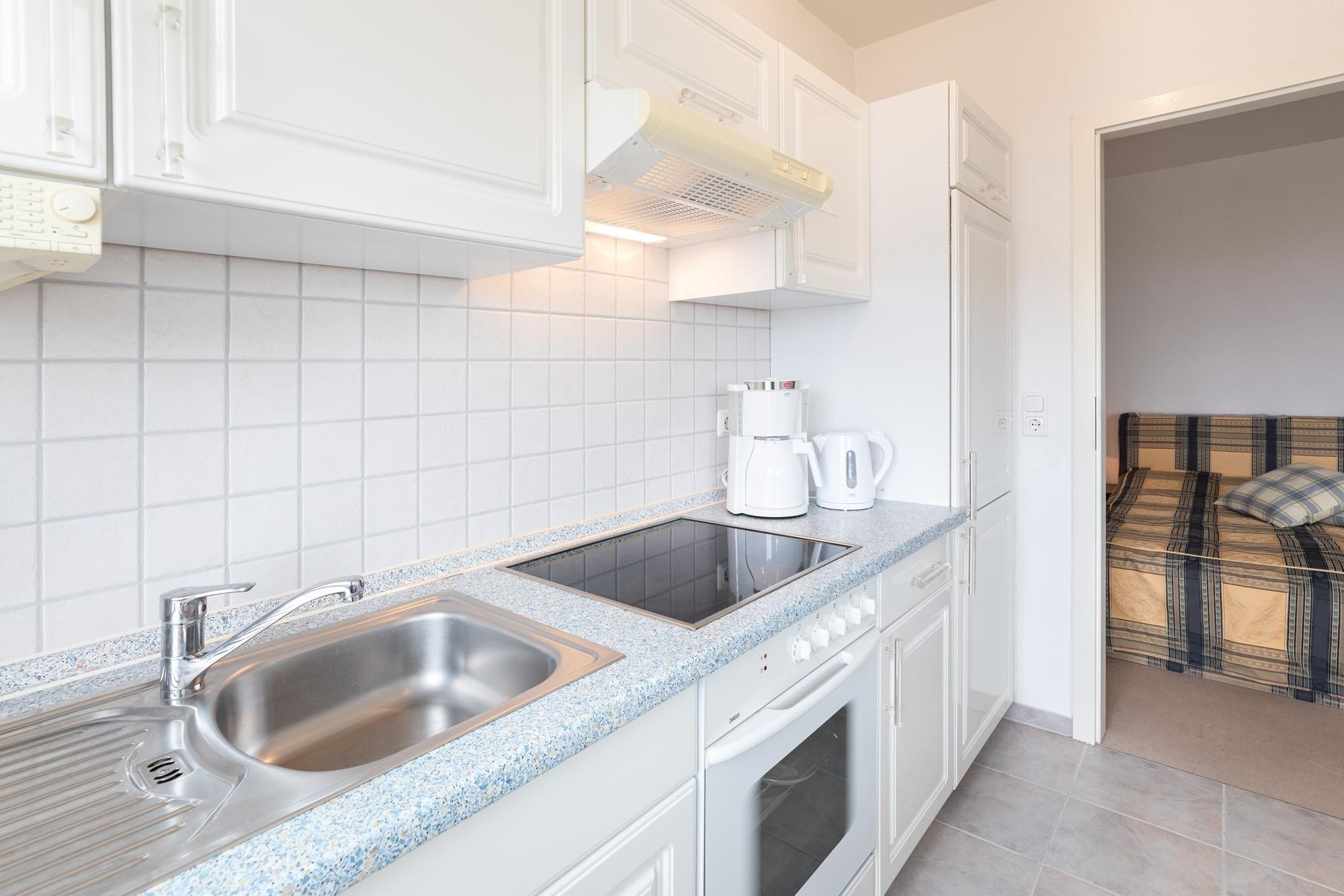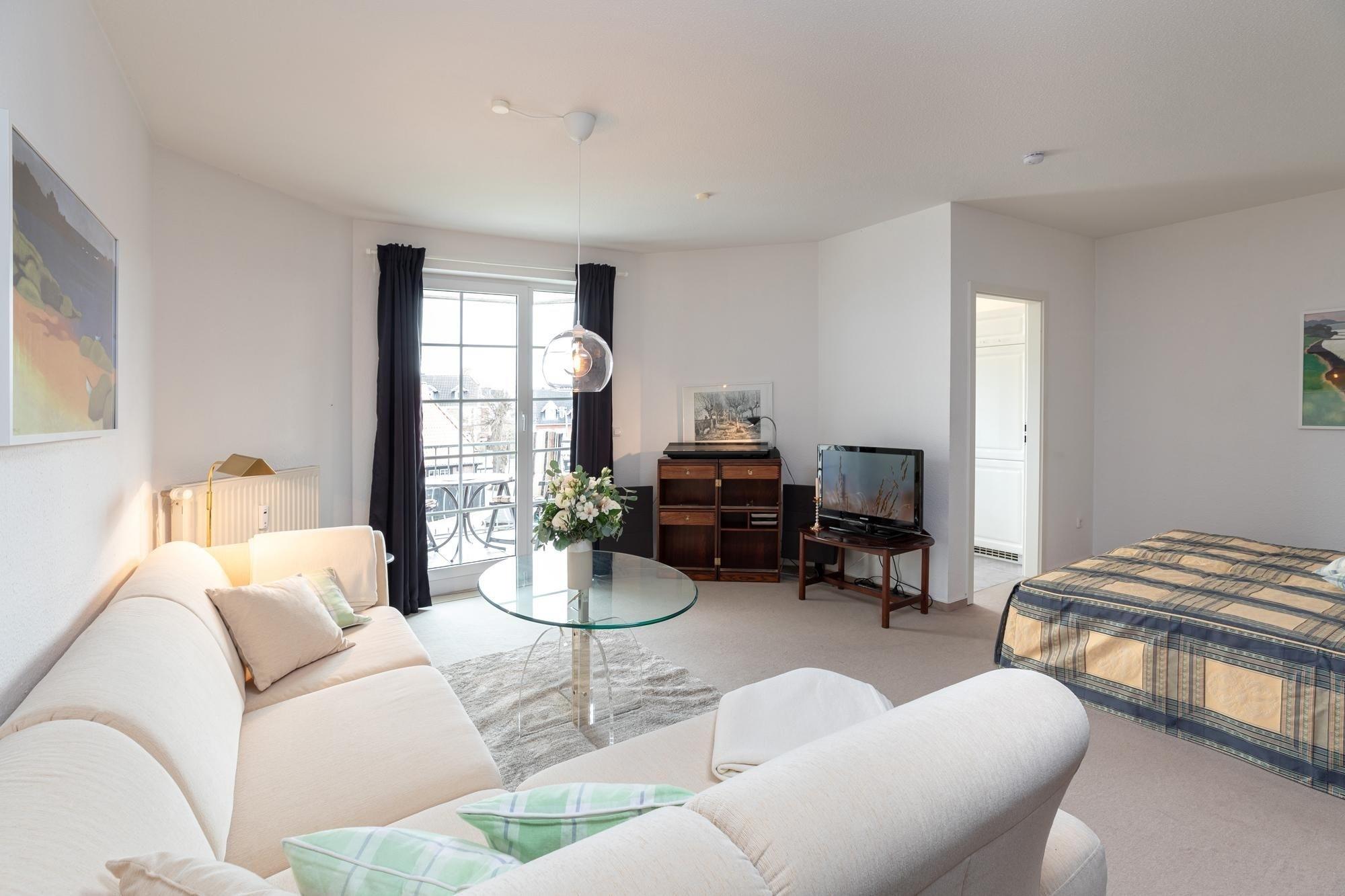 Machen Sie es sich im gemütlichen Wohn-/Schlafraum auf Sofa und Sesseln bequem, für elektronische Unterhaltung sorgen TV, Radio und ein kostenfreier WLAN-Zugang. Nach einem ausgiebigen Strandtag finden Sie Ruhe und Entspannung in dem komfortablen Doppelbett (2x90x200cm), Vorhänge sorgen für angenehme Verdunklung. Mit Alltagshelfern wie 4-Platten-Ceranherd, Backofen und Kühlschrank mit Gefrierfach bietet die separate Küche perfekte Voraussetzungen für entspanntes Kochen im Urlaub. Das Badezimmer ist mit Dusche (Einstiegshöhe ca. 26 cm) und WC klassisch ausgestattet. Auf Ihrem großzügigen Balkon genießen Sie die herrliche Ostseeluft, ein Sonnenschirm schützt an Sommertagen vor zu starker Sonnenstrahlung.