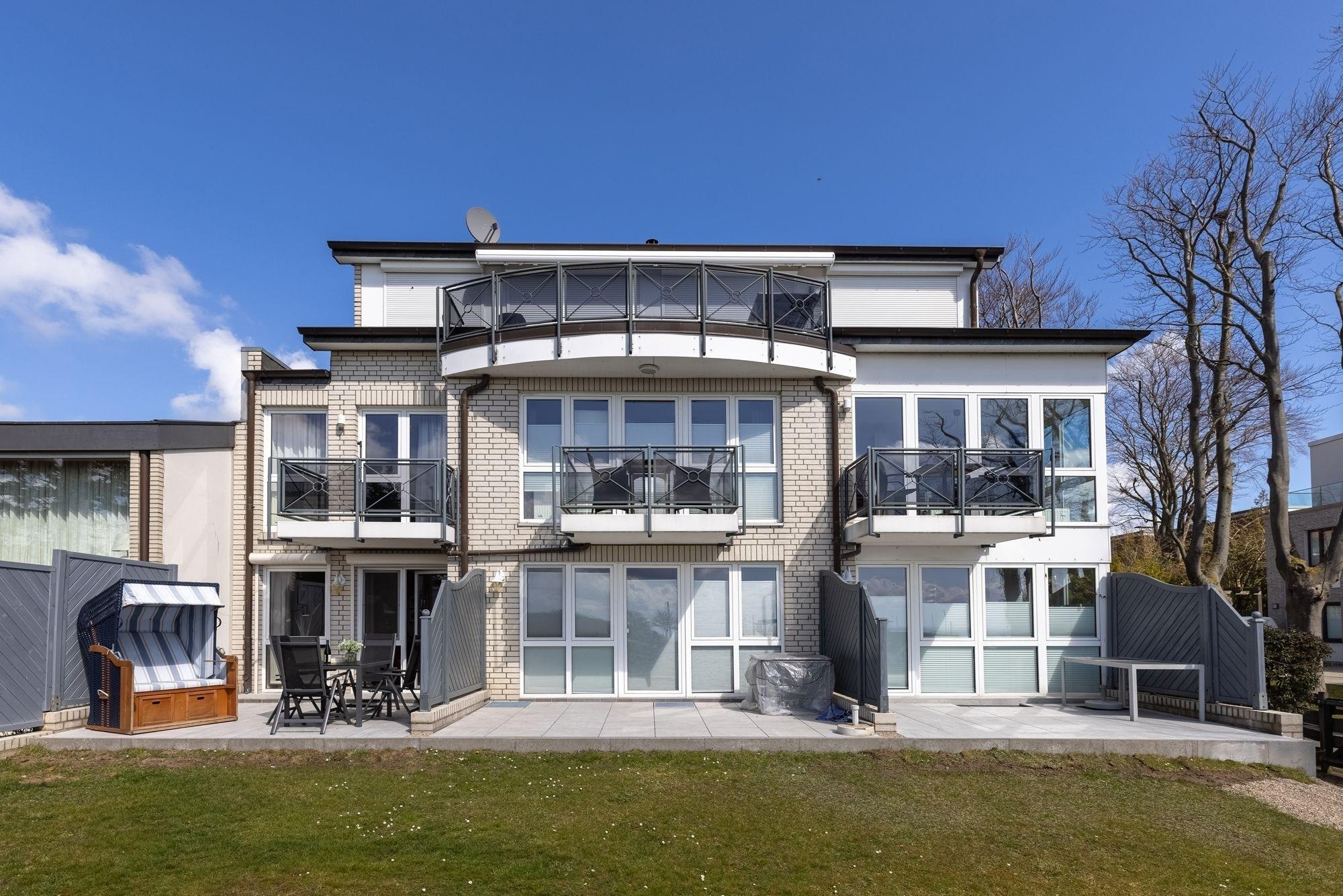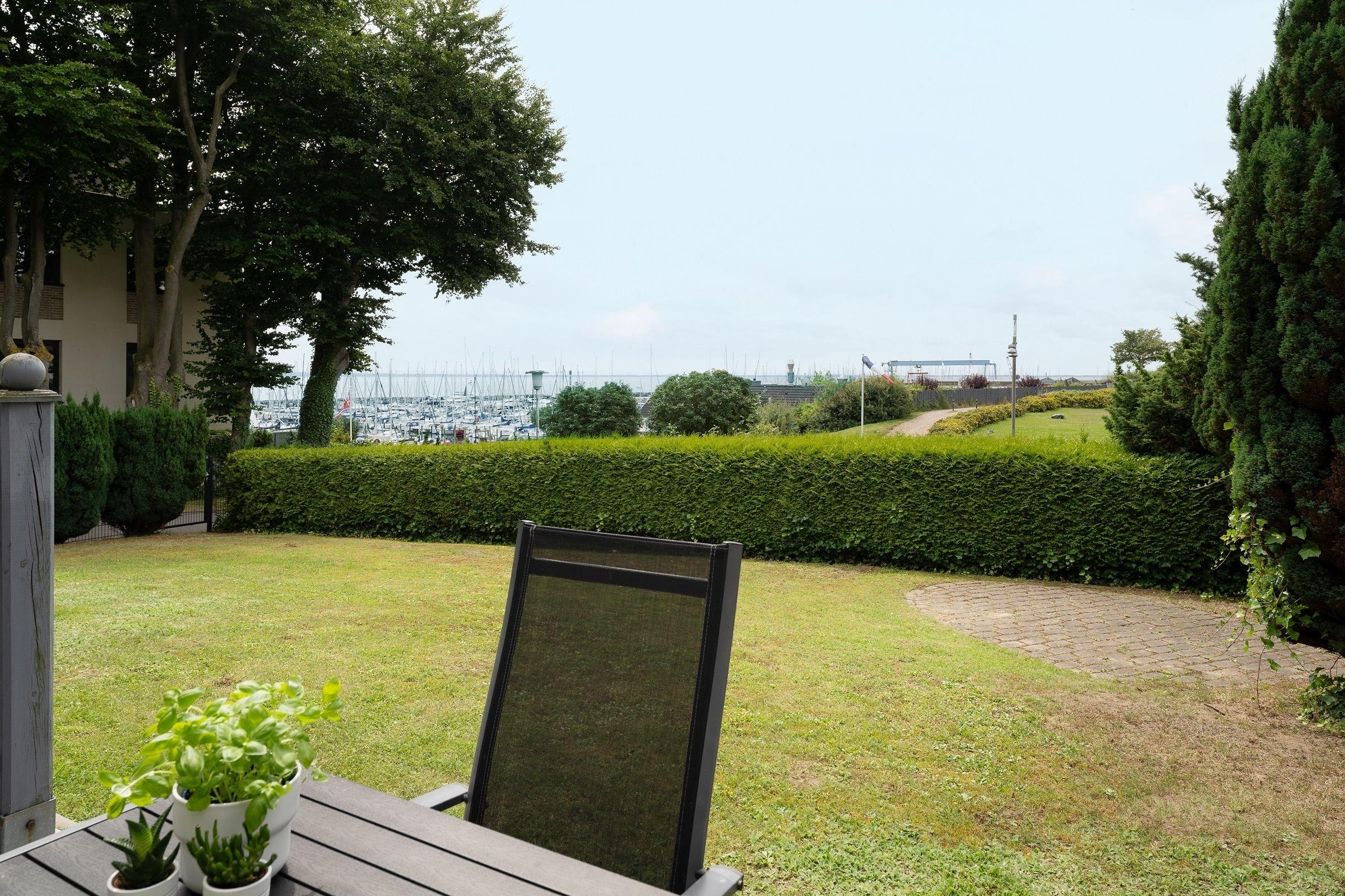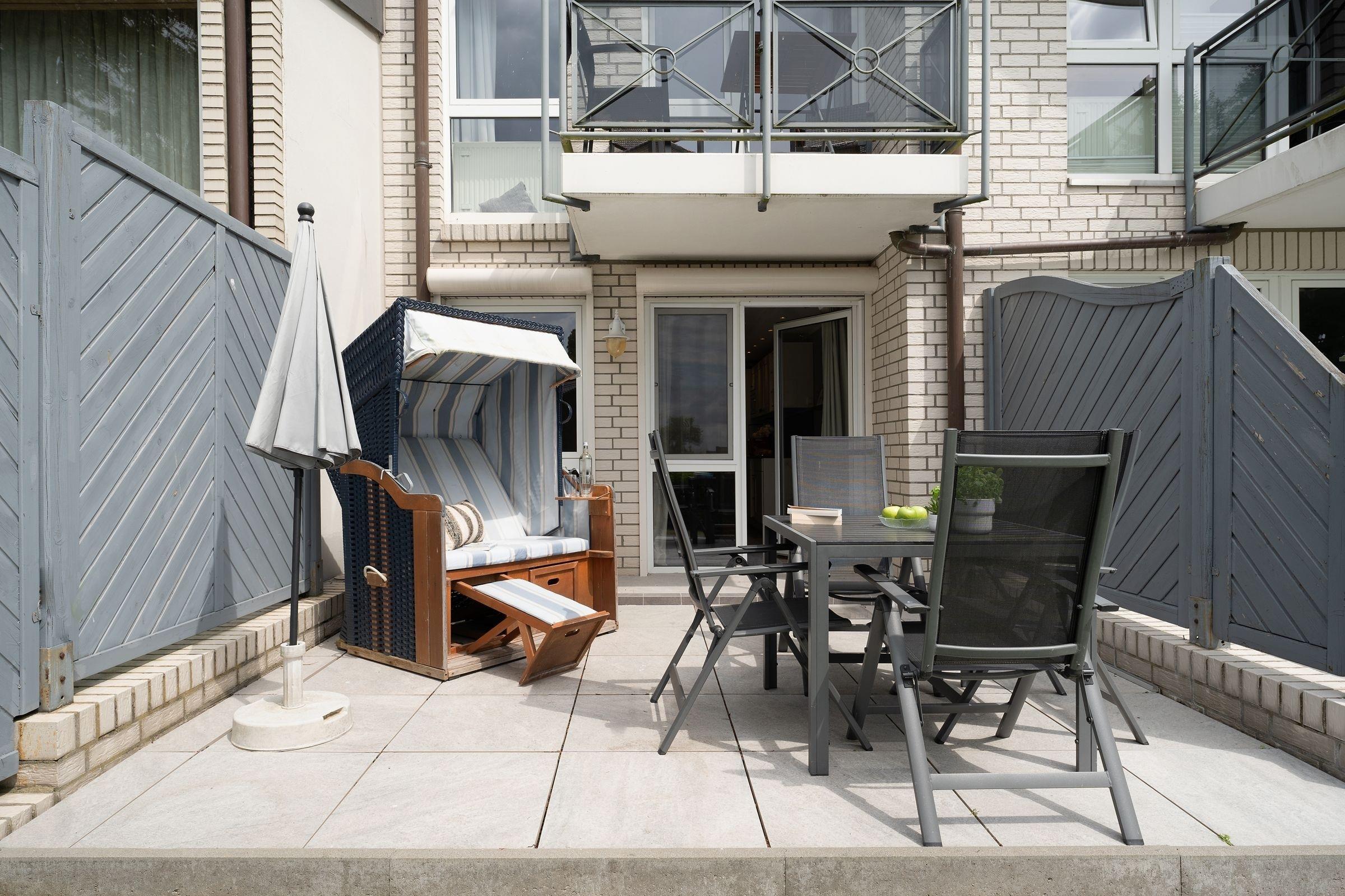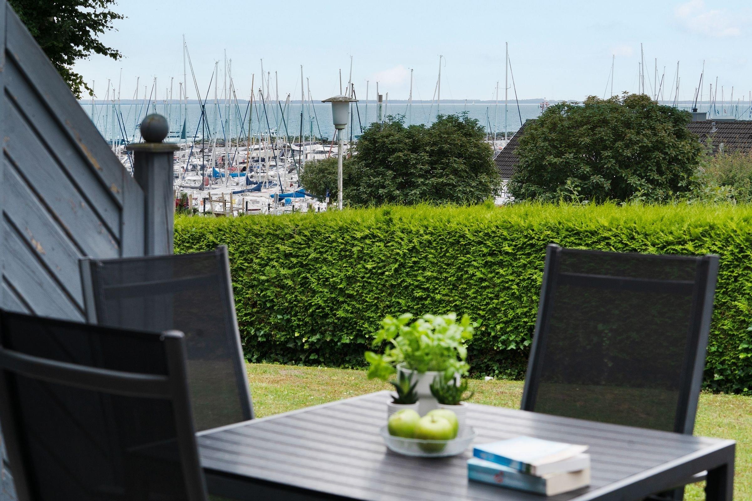Moderne Erdgeschosswohnung in Grömitz mit Terrasse, Yachthafenblick und Strandkorb für entspannte Ostseeferien.