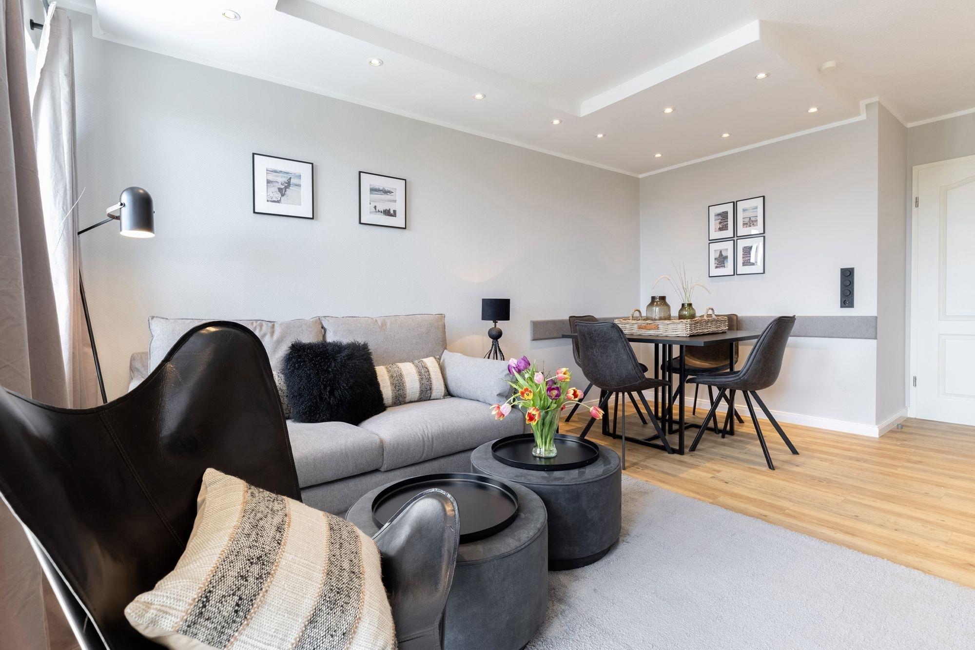 Diese moderne, top ausgestattete Erdgeschosswohnung umfasst ca. 47 m² und ist mit 2 Schlafzimmern für bis zu 4 Personen ausgerichtet. Sie liegt auf der rechten Seite des Hauses.