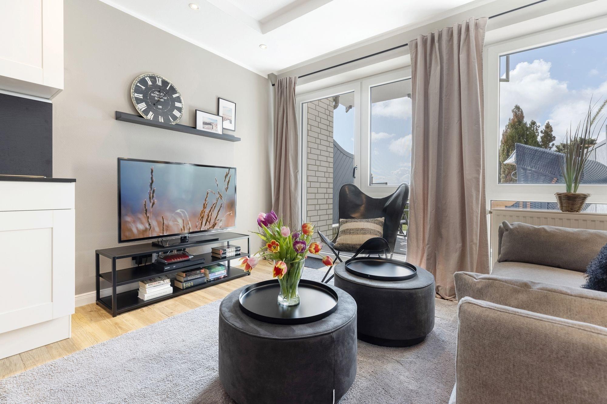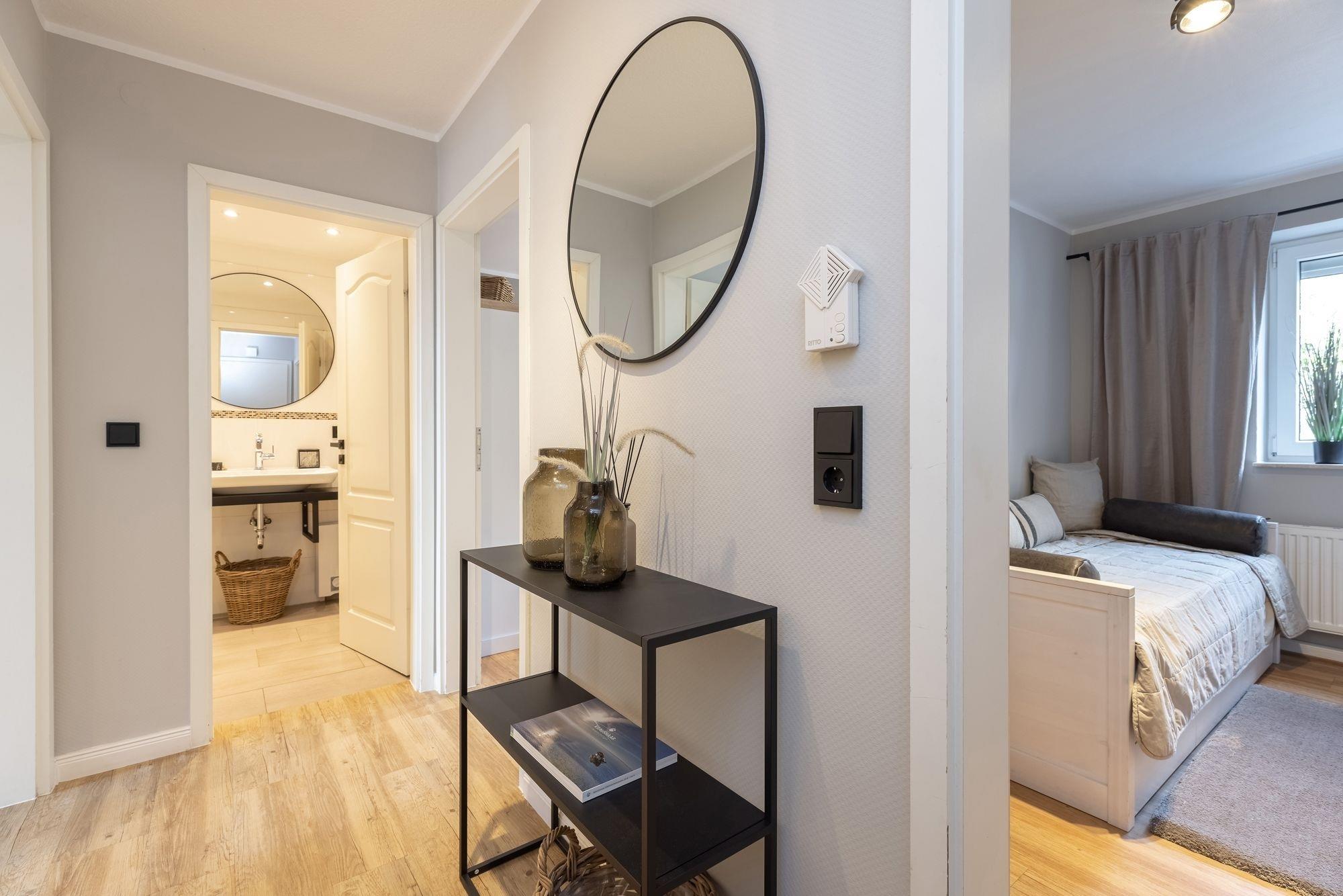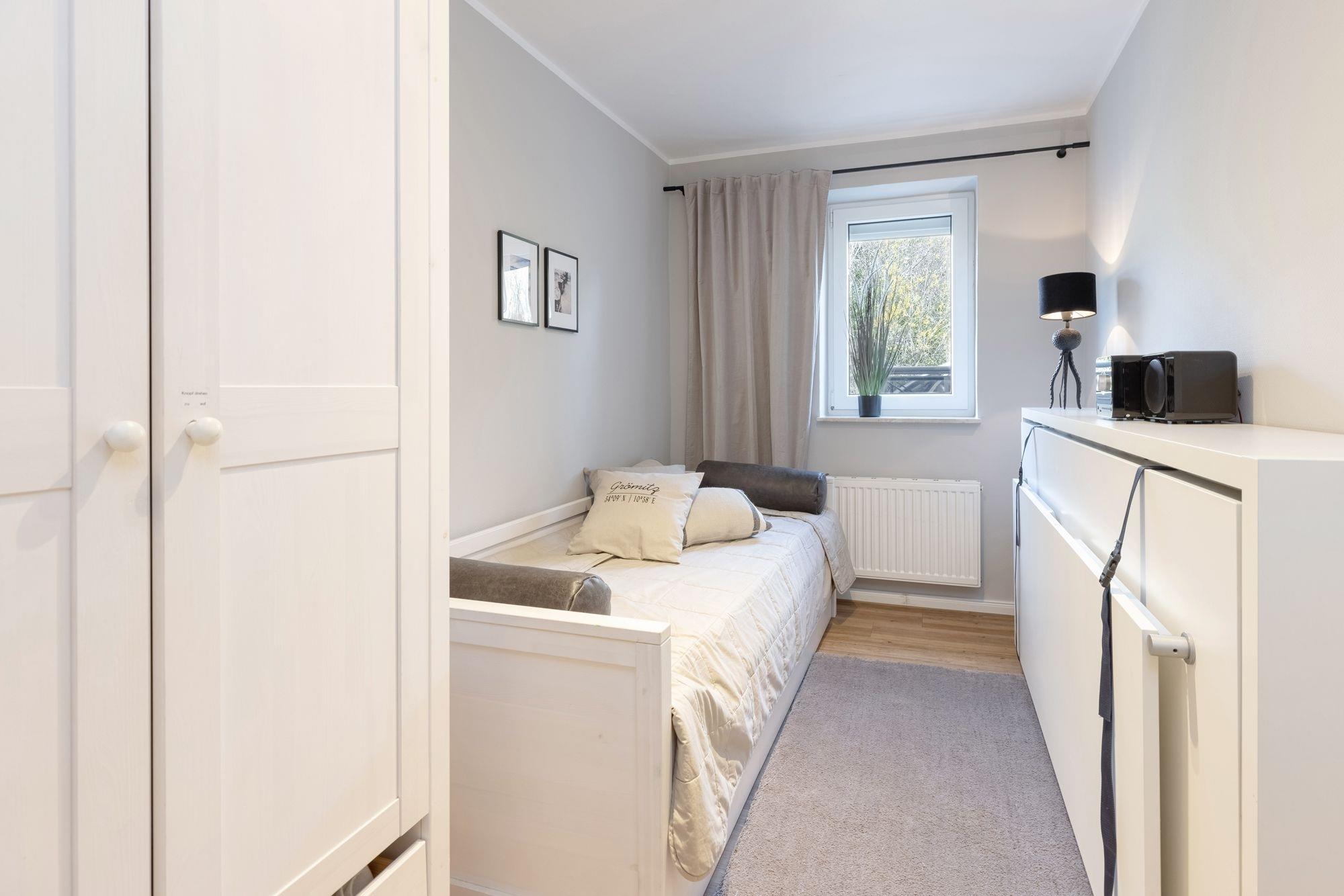 Vom Eingangsbereich aus führt der Flur zu allen Zimmern. Ein Zimmer mit ausziehbarem Kojenbett bietet 2 Schlafplätze (2x 85x195 cm), ein weiteres Schlafzimmer verfügt über ein Doppelbett (160x200 cm) und einen geräumigen Kleiderschrank mit Schiebetüren. Das modern eingerichtete Bad ist in hellen Naturtönen gefliest und überzeugt mit Annehmlichkeiten wie einer geräumigen Dusche, WC, Waschtisch und praktischer Handtuchheizung. Der komfortable Wohnraum mit gemütlicher TV-Ecke und dem angrenzenden Essplatz für bis zu 4 Personen lädt zu gemütlichen Stunden ein. Bereiten Sie Ihre Ferienmahlzeiten in der geschickt integrierten, hochwertig ausgestatteten Küche zu und genießen Sie gesellige Momente bei leckerem Essen und maritimen Flair. Vom Wohnzimmer aus gelangen Sie mit einem Schritt auf die dazugehörige teilüberdachte Terrasse mit Südwestausrichtung und Blick Richtung Yachthafen. Genießen Sie die Sonne auf diesem friedlichen und schön angelegten Außenbereich, Strandkorb und Ostseeluft sind inklusive!