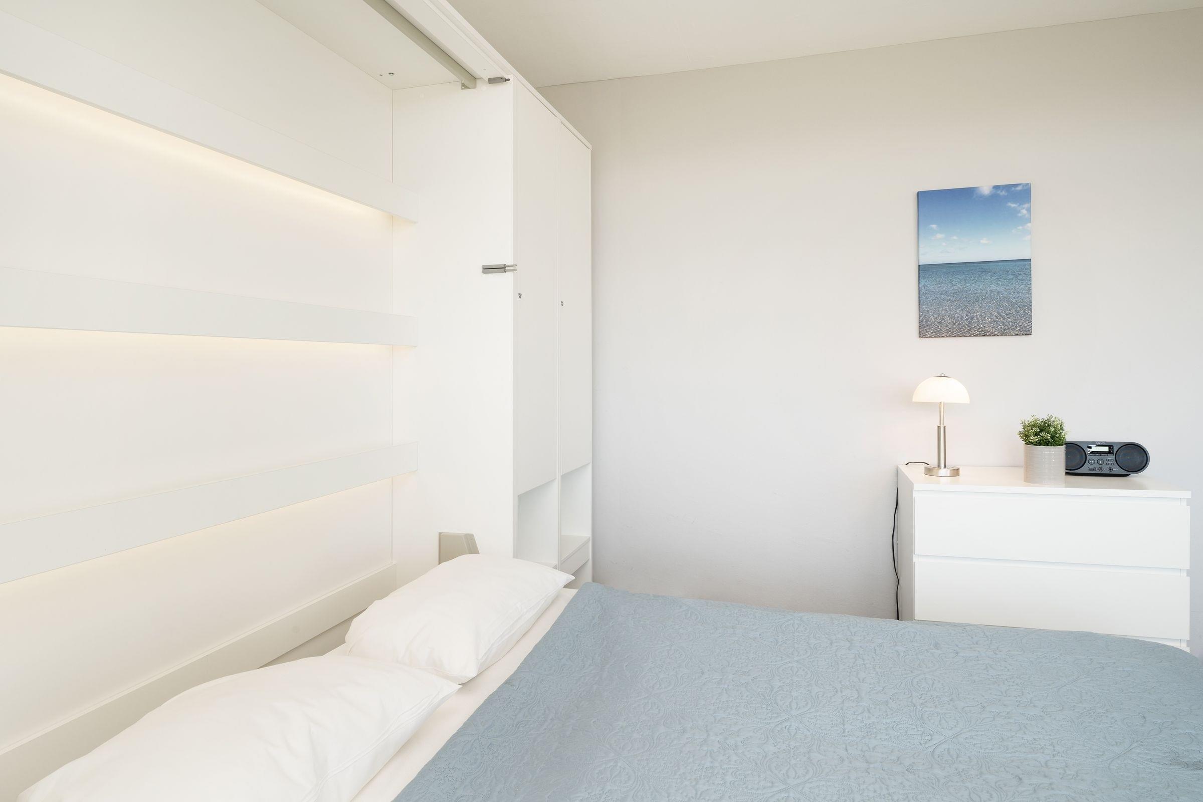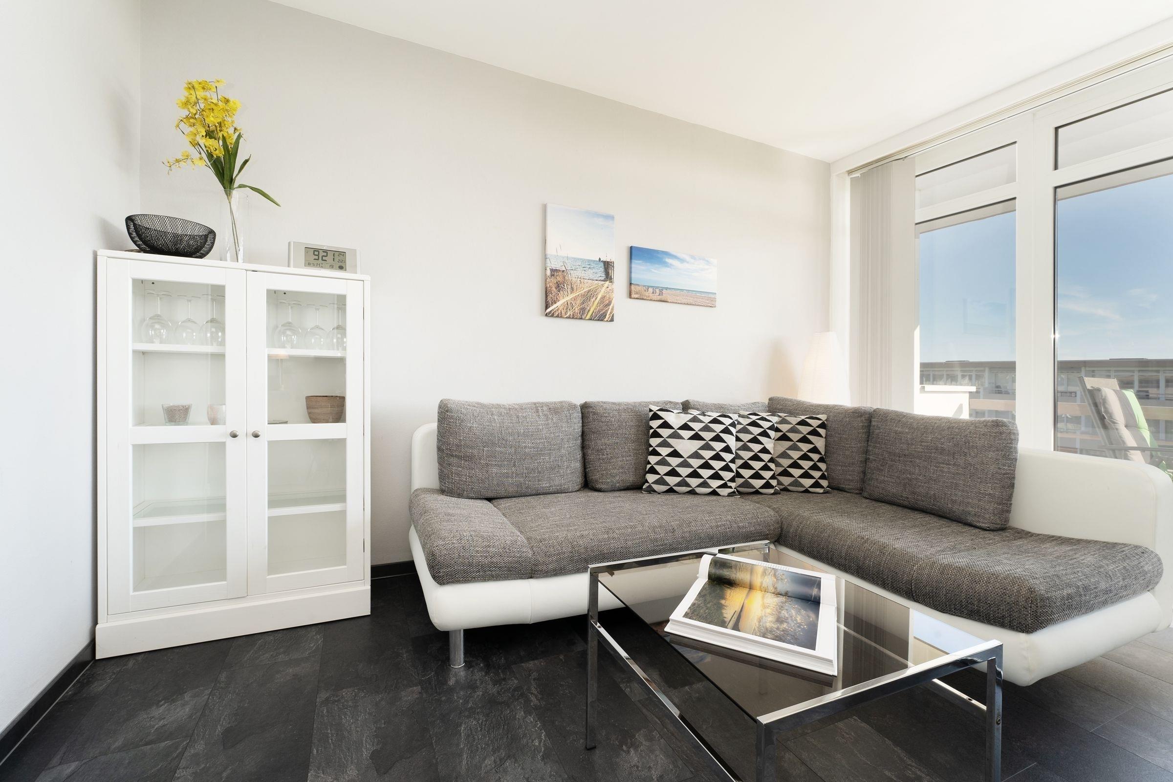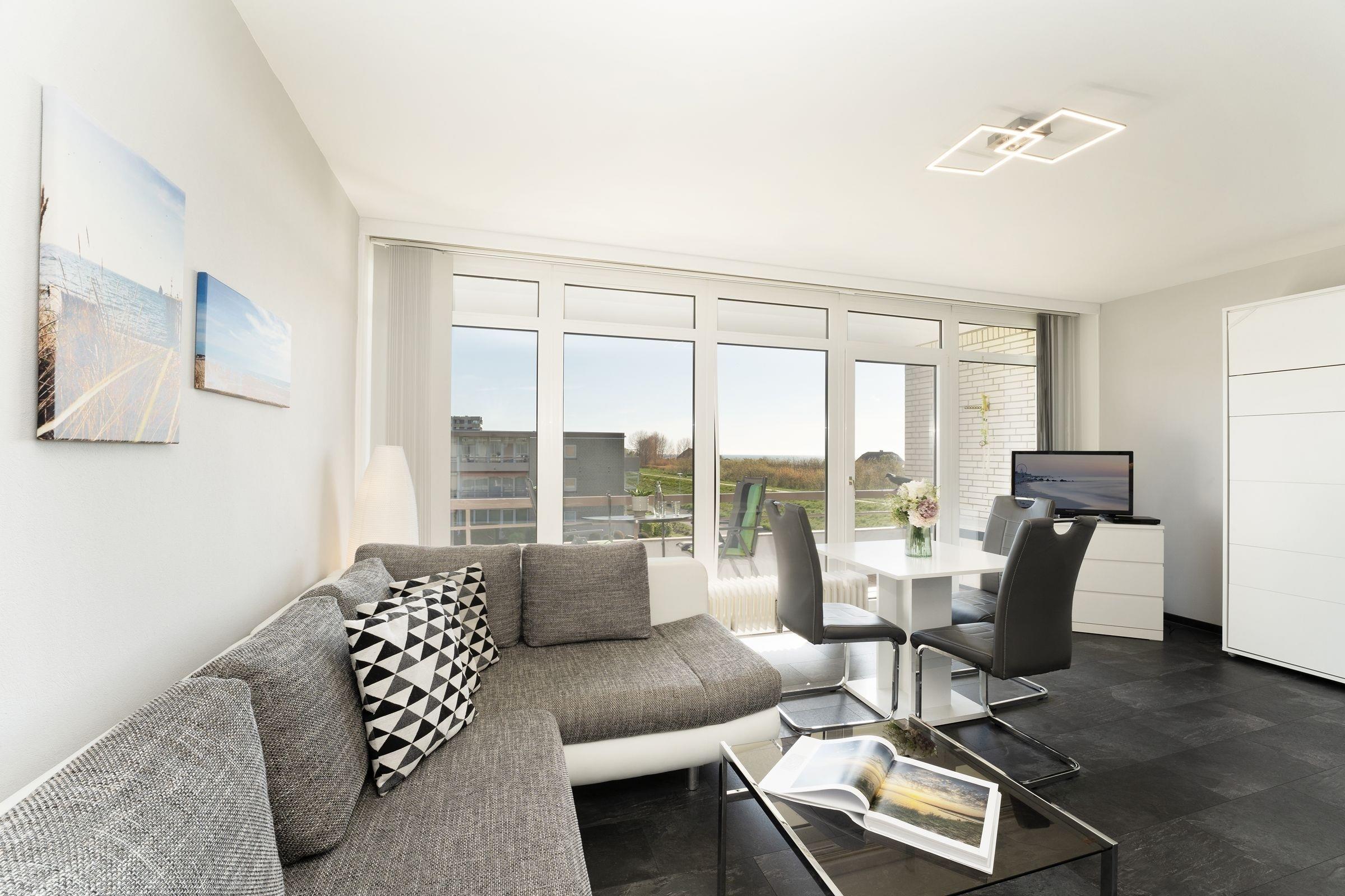 Für alles ist gesorgt! In der gut ausgestatteten, separaten Küche können Sie sich nach Herzenslust Ihre Lieblingsmahlzeiten zubereiten. Ein 4-Platten-Cerankochfeld, eine Mikrowelle, ein Kühlschrank, ein Backofen und eine Kaffeemaschine machen die Ausstattung perfekt. Das Wohn-/Schlafzimmer ist nicht nur funktional sondern auch gemütlich. Ein Schlafsofa und ein Schrankbett lassen sich mit wenigen Handgriffen in gemütliche Nachtlager umwandeln (je 1 Matratze 160x200 cm). Der Meerblick ist einfach atemberaubend! Alternativ bietet der Fernseher weitere Unterhaltung. Sie mögen es dunkel? Ziehen Sie dafür einfach die Vertikallamellen vor. Um morgens gut in den Tag zu starten, können Sie wahlweise mit dem Radio oder dem CD Player Ihrer Lieblingsmusik lauschen. Der ca. 5 m² große Balkon mit bequemer Möblierung lädt zum Verweilen ein.