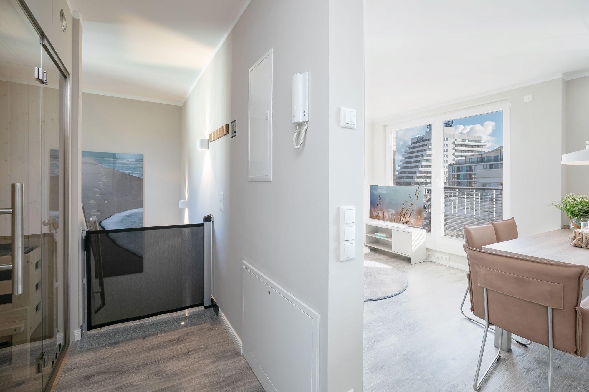 Luxuriöses Penthouse mit großer Dachterrasse und Sauna im Herzen von Grömitz, ideal für entspannte Urlaubstage am Meer.