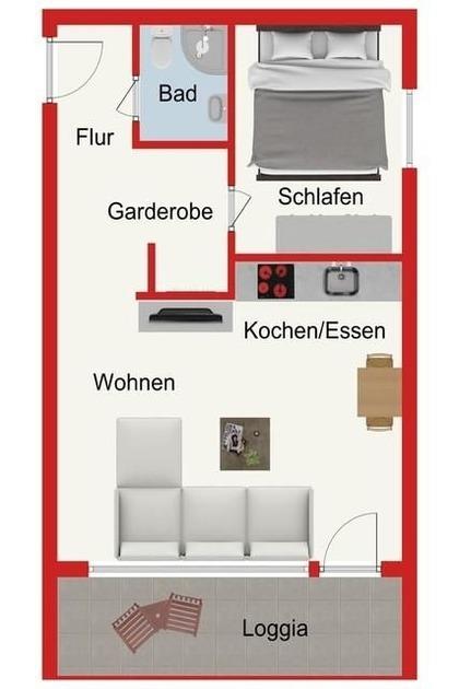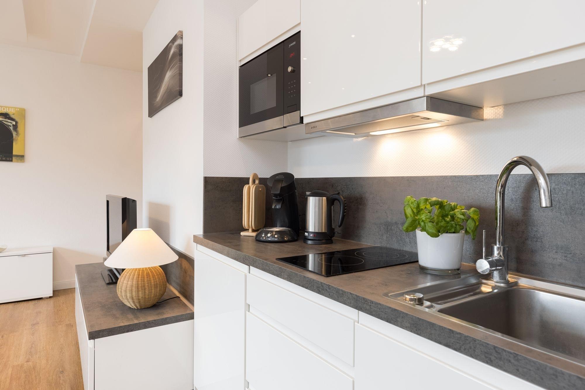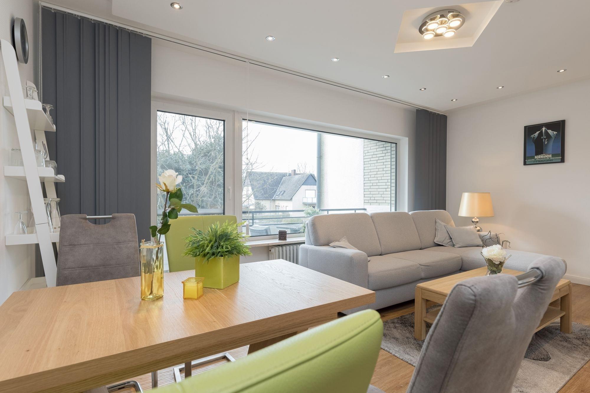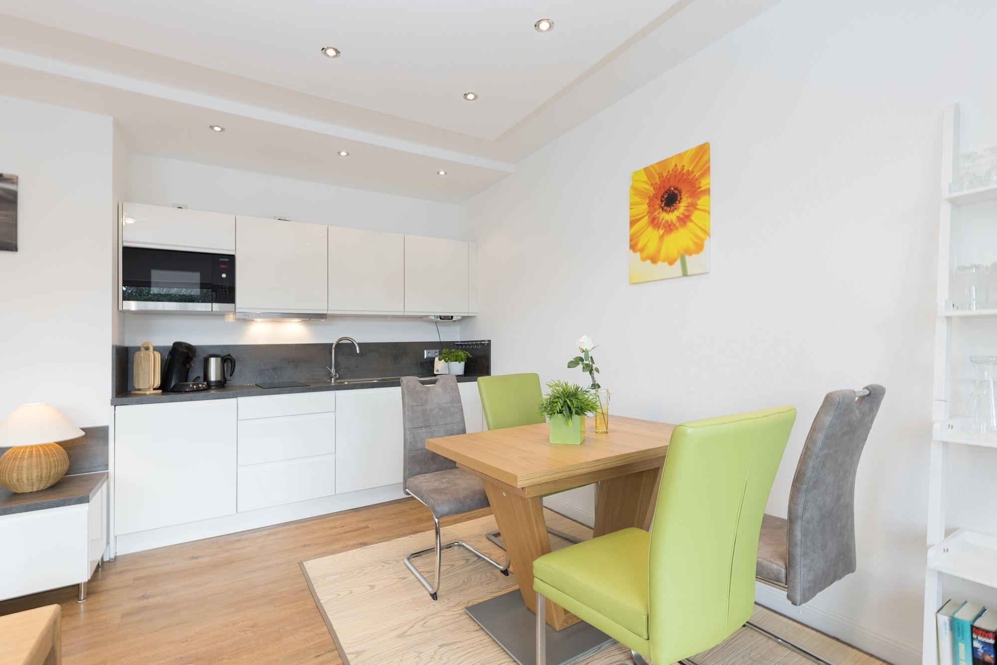 Ein kleiner heller Flur begrüßt die eintretenden Gäste und bietet Abstellmöglichkeiten. Im Wohnbereich mit Essplatz und integrierter Küchenzeile lassen sich gesellige Stunden beim Spielen oder Fernsehen verbringen. Für mitreisende Kinder lässt sich das Sofa in ein kuscheliges Nachtlager (120x220 cm) verwandeln. Loggen Sie sich in das kostenlose WLAN-Netzwerk ein und streamen Sie Ihre Lieblingsmusik. Wenn Sie sich selbst verpflegen möchten, stehen in der modernen Küche 2 Kochfelder, Mikrowelle, Kühlschrank, Spülmaschine, Kaffeemaschine, Wasserkocher und Toaster parat. Durch die Terrassentür betreten Sie den möblierten Balkon. Das Doppelbett im separaten Schlafzimmer (2x 80x200 cm) verspricht eine erholsame Nacht nach einem ereignisreichen Urlaubstag. Zur Nachtruhe lässt die Wohnung sich mit Außenrollläden verdunkeln. Das kleine, aber moderne Badezimmer mit bodentiefer Dusche, WC, Waschtisch und Fön verbreitet mit Farbakzenten eine fröhliche Urlaubsstimmung.
