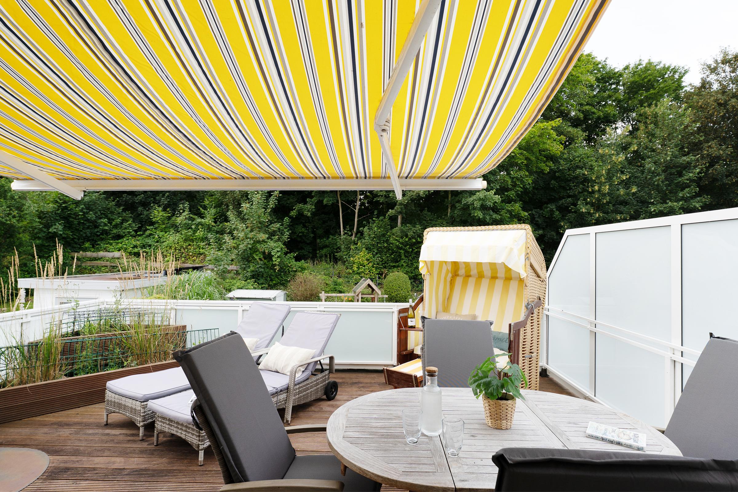 Im hellen und freundlichen Wohnbereich können Sie ungestörte Zweisamkeit genießen. Auch an Regentagen lässt es sich hier gut aushalten, denn ein Flat-TV und ein kostenloser WLAN-Anschluss zum Streamen Ihrer Lieblingsmusik stehen Ihnen zur Verfügung. In der zum Wohnbereich offenen Küche sorgen Sie mühelos für Ihr leibliches Wohl. Dank hochwertiger Ausstattung geht die Zubereitung schmackhafter Köstlichkeiten leicht von der Hand - zum Beispiel eine Kaffeespezialität aus der Nespresso-Kapselmaschine. Ein gemütlicher Essplatz ist ebenfalls integriert. Bei Sonnenschein können Sie Ihre Mahlzeiten aber auch auf der eigenen großzügigen Dachterrasse genießen, bei Bedarf verwandelt diese sich durch eine Markise in ein schattiges Plätzchen. Sonnenliegen, Terrassenmöbel und auch ein Strandkorb bieten vielfältige Rückzugs- und Entspannungsmöglichkeiten. Ein auf dem Steingrill zubereiteter Ostseefisch schmeckt unter freiem Himmel bei einem Glas Wein doppelt gut. Ein Sichtschutz sorgt für ungestörte Urlaubsmomente. Erholung und Ruhe finden Sie im komfortablen Doppelbett (2x 90x200 cm) im separaten Schlafzimmer, das sich angenehm abdunkeln lässt. Ihre Reisegarderobe bringen Sie mühelos in einem geräumigen Kleiderschrank unter. Das zeitlose Tageslichtduschbad rundet die stilvolle Ausstattung dieses Feriendomizils ab.