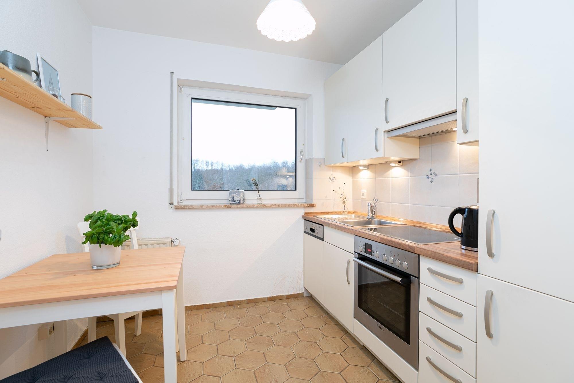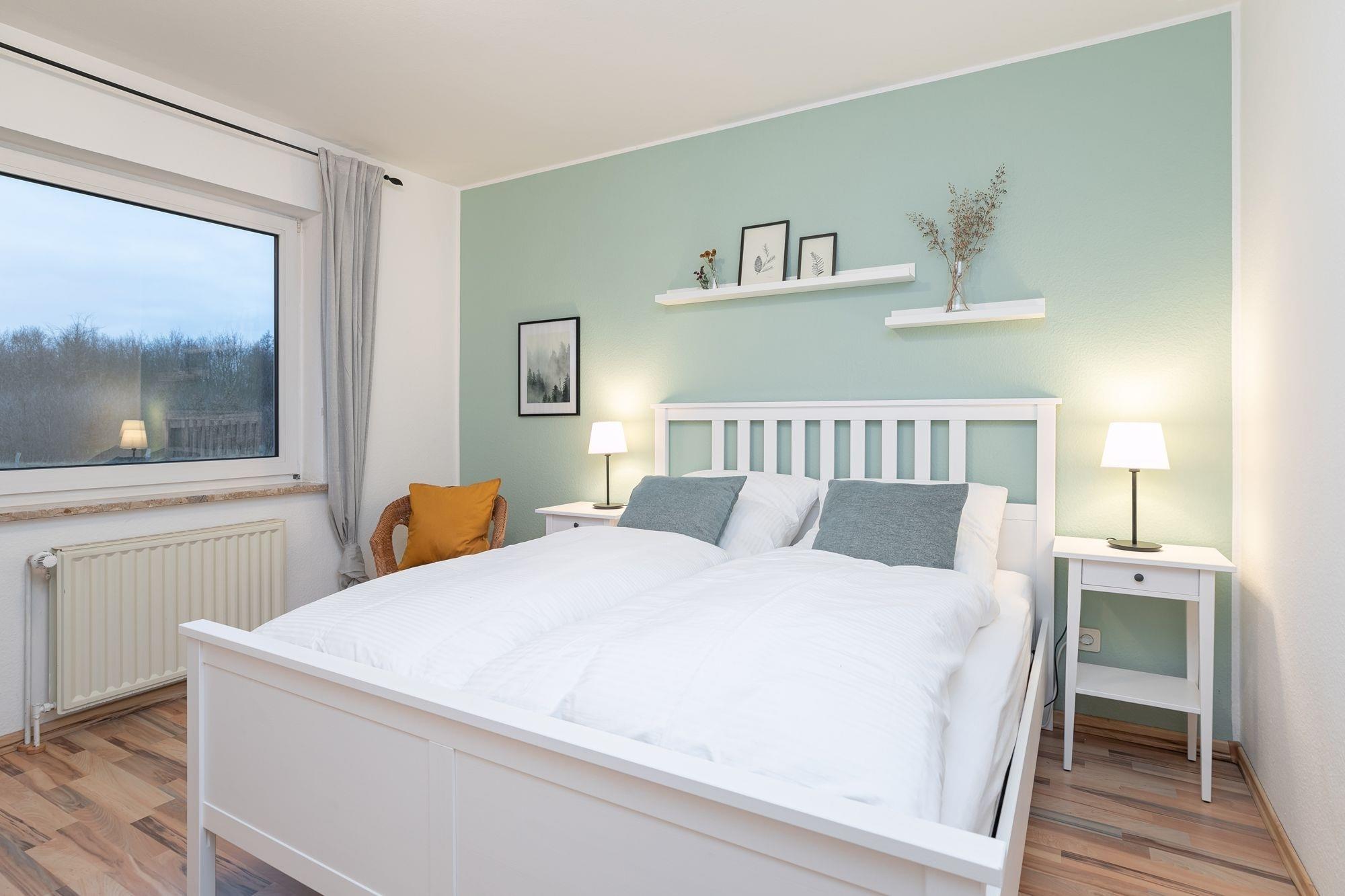 Der moderne Wohnbereich im nordischen Stil überzeugt mit schlichter Eleganz. Relaxen und kuscheln Sie auf dem gemütlichen Sofa vor dem Fernseher oder essen und spielen Sie gemeinsam am geräumigen Esstisch. Über den kostenlosen WLAN-Anschluss bleiben Sie erreichbar und mit Ihren Lieben daheim verbunden. Zur Nacht haben Sie bei Bedarf die Möglichkeit die Eckcouch in einen komfortablen Schlafplatz für einen 5. Reisegast zu verwandeln (140x200 cm). Zu einem Urlaub gehört auch gutes Essen - in der separaten Küche finden Sie alles, um sich und Ihre Lieben kulinarisch zu verwöhnen. Nach einem ereignisreichen Tag können Sie dann in zwei separaten Schlafzimmern die Seele baumeln lassen und neue Energie tanken. In beiden Schlafzimmern bieten Kleiderschränke ausreichend Stauraum für Ihre Urlaubsgarderobe. Für eine angenehme Nachtruhe sorgen entweder ein bequemes Doppelbett (160x200 cm)oder zwei Einzelbetten (je 90x200 cm). Ein Badezimmer mit Dusche rundet das Angebot dieser Ferienwohnung ab. Nutzen Sie die möblierte Terrasse für ein ausgiebiges Frühstück bei Sonnenschein oder für entspannte Stunden bei einem guten Glas Wein. Der Ausblick in den zum Haus gehörenden Garten sorgt für Entspannung.