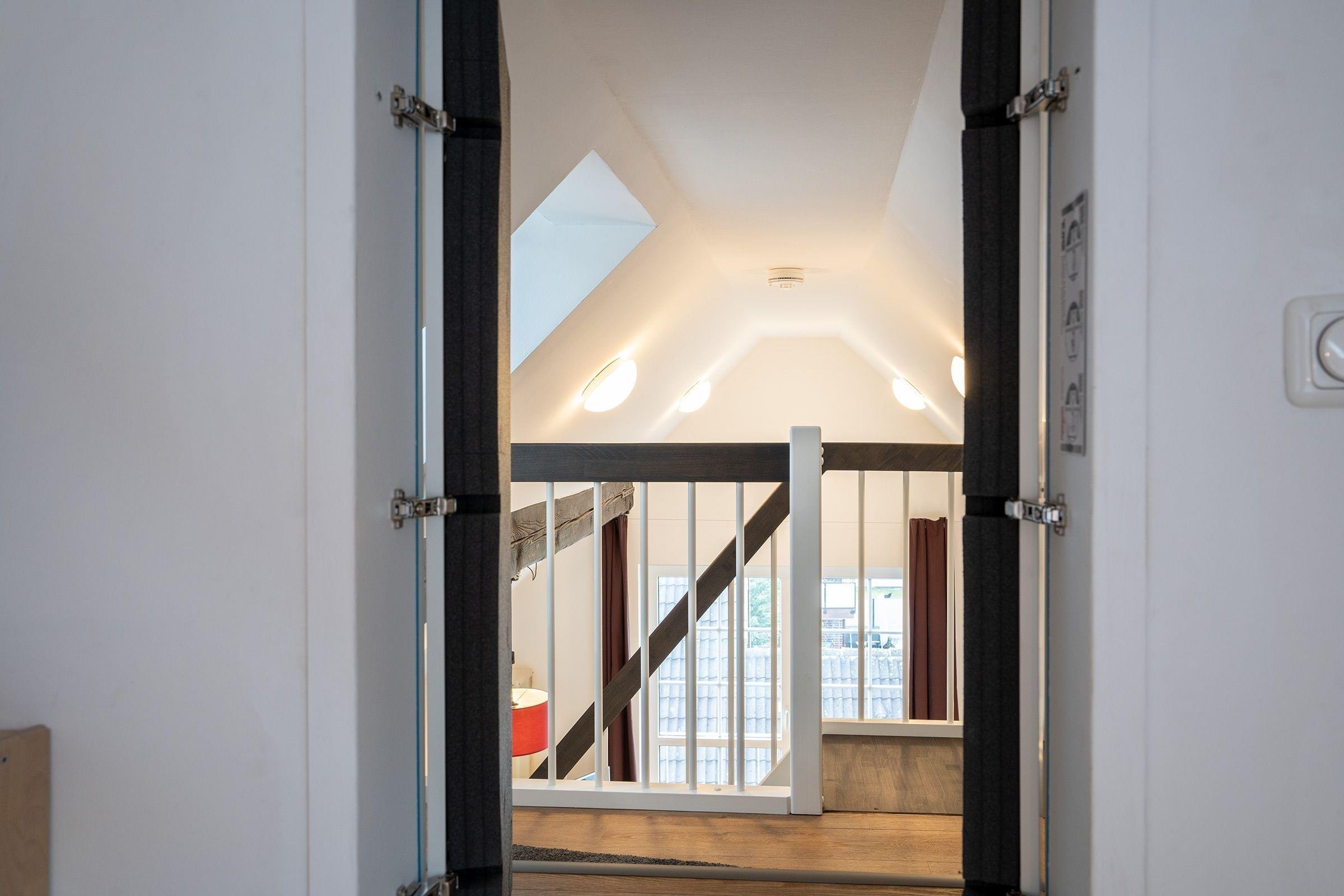 Eine Treppe führt hinauf ins 2. Obergeschoss, wo Sie einen weiteren Wohnraum mit einem Schlafsofa (140x200 cm) für 2 Personen, einen TV, eine Musikanlage sowie eine kleine Bücher- und Spielesammlung vorfinden. Auf dieser Etage befinden sich ebenfalls das separate Schlafzimmer mit Doppelbett (2x 90x200 cm) sowie ein separates, hell gefliestes Duschbad mit Waschmaschine. Eine weitere kleine Treppe führt in das 3 OG. Dort befindet sich unter dem Spitzdach eine kleine