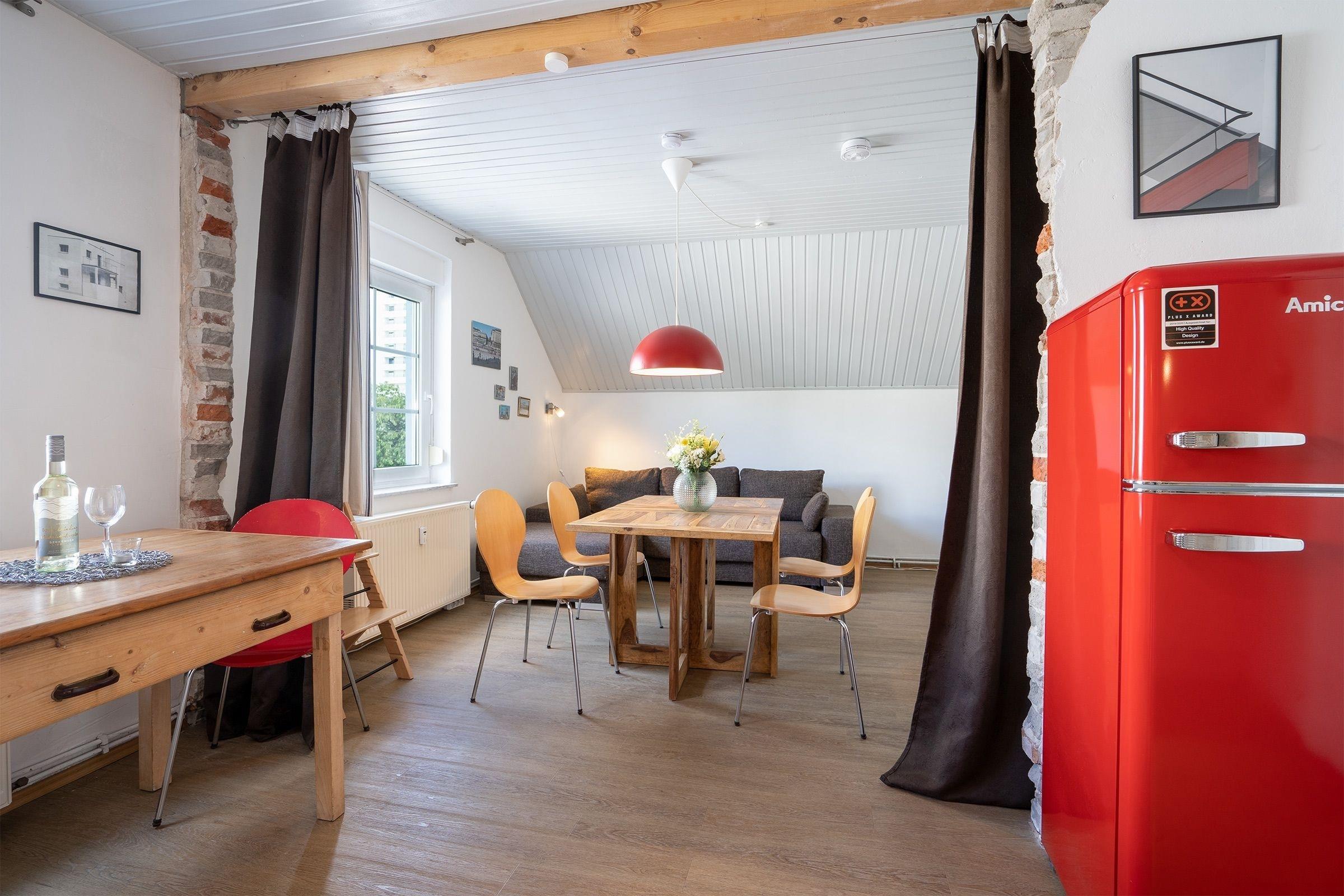 Durch den Haupteingang gelangen Sie über wenige Stufen in den Eingangsbereich der Appartementanlage Seeschwalbe mit nur 7 Wohneinheiten. Über eine urige Holztreppe erreichen Sie auf der 1. Etage (rechte Seite) Ihre Wohnung. Beim Eintreten befinden Sie sich direkt im geräumigen Wohn- und Essbereich mit offener Küche und vielen Fenstern. In der Küche stehen Ihnen alle notwendigen Küchengeräte zur Verfügung und hier ist viel Platz, um ausgiebig mit der Familie zu kochen. Den Wohn- und Essbereich können Sie mit einem Vorhang in eine kleine Küche und einen separaten Wohnraum mit Ecksofa (Schlafmöglichkeit für 1 Person, 135x200cm), Kleiderschrank, Musikanlage und Flachbildfernseher aufteilen.