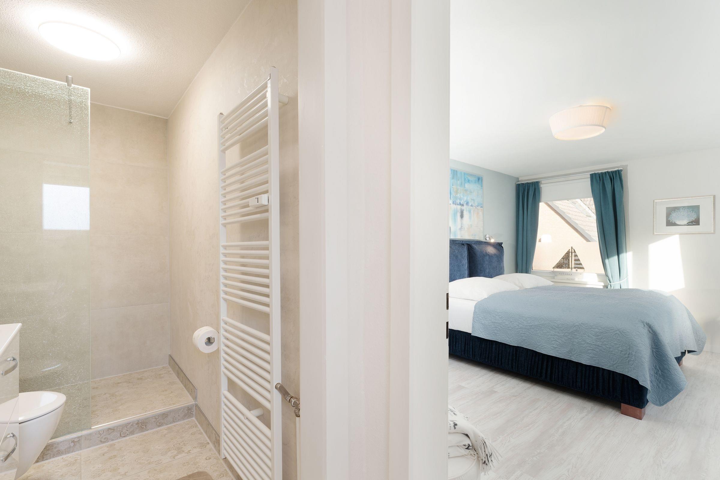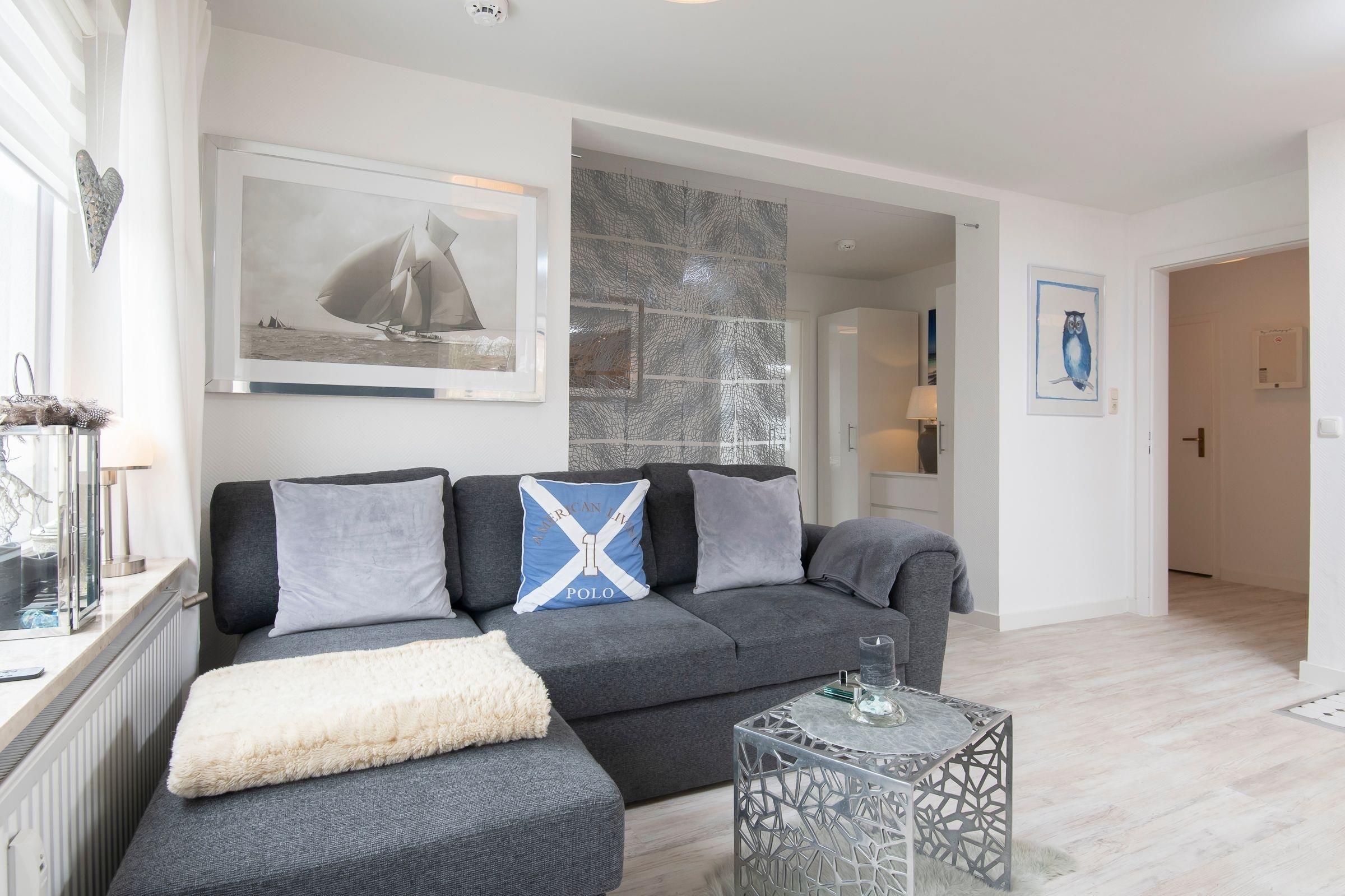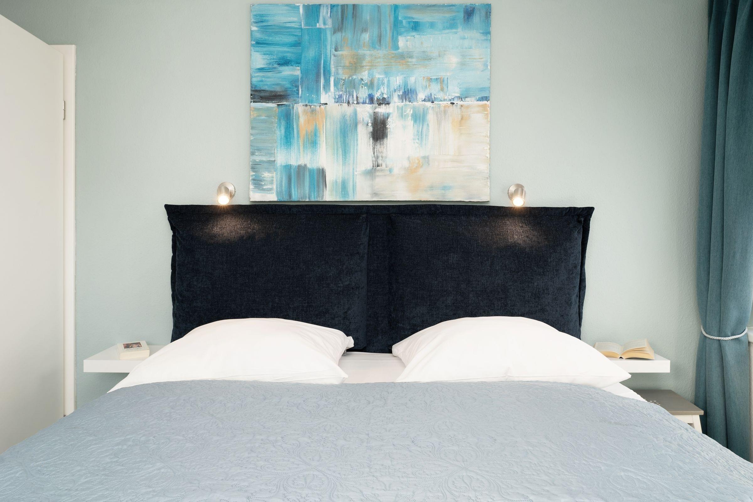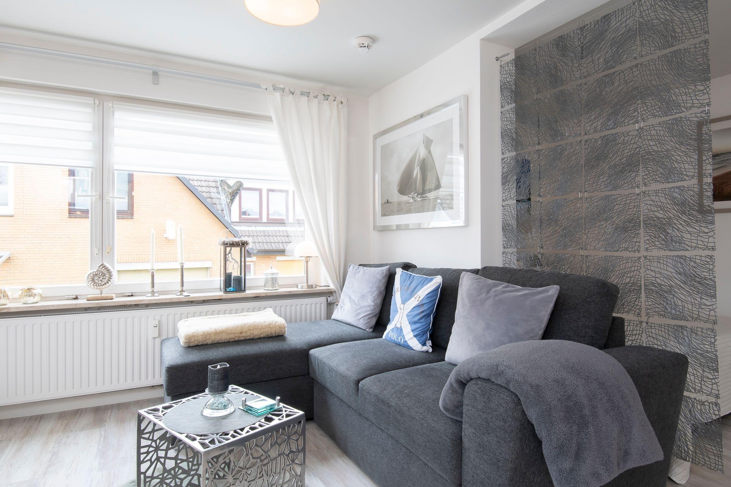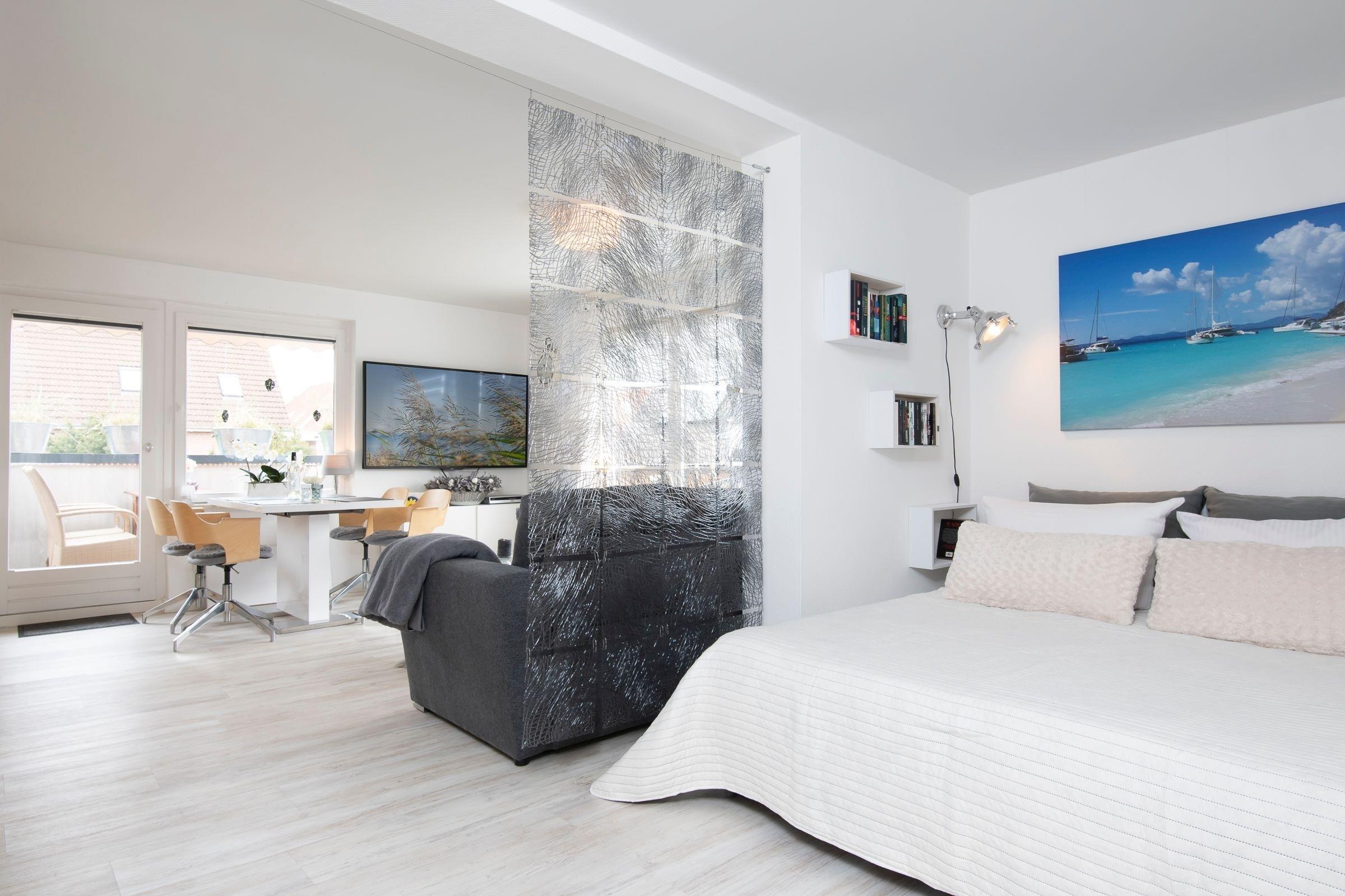 Herzlich willkommen! Treten Sie ein in den stilvoll eingerichteten, offenen Wohn- und Essbereich mit Küche, Esstisch, Ecksofa und großem Flachbildfernseher. Von hier aus haben Sie Zugang zum möblierten Balkon mit Markise, auf dem Sie Ihre Auszeit genießen können. In einer Nische hinter dem Wohnbereich befindet sich ein Boxspring-Doppelbett (140x200 cm). Dieser offene Schlafbereich lässt sich durch einen transparenten Raumteiler vom Wohnbereich abtrennen. An der Schlafnische vorbei erreichen Sie das separate Schlafzimmer mit Doppelbett (180x200 cm), Kleiderschrank und einem weiteren Fernseher. Die Wohnung verfügt über ein komfortables Badezimmer sowie ein tageslichthelles Gäste-WC.
