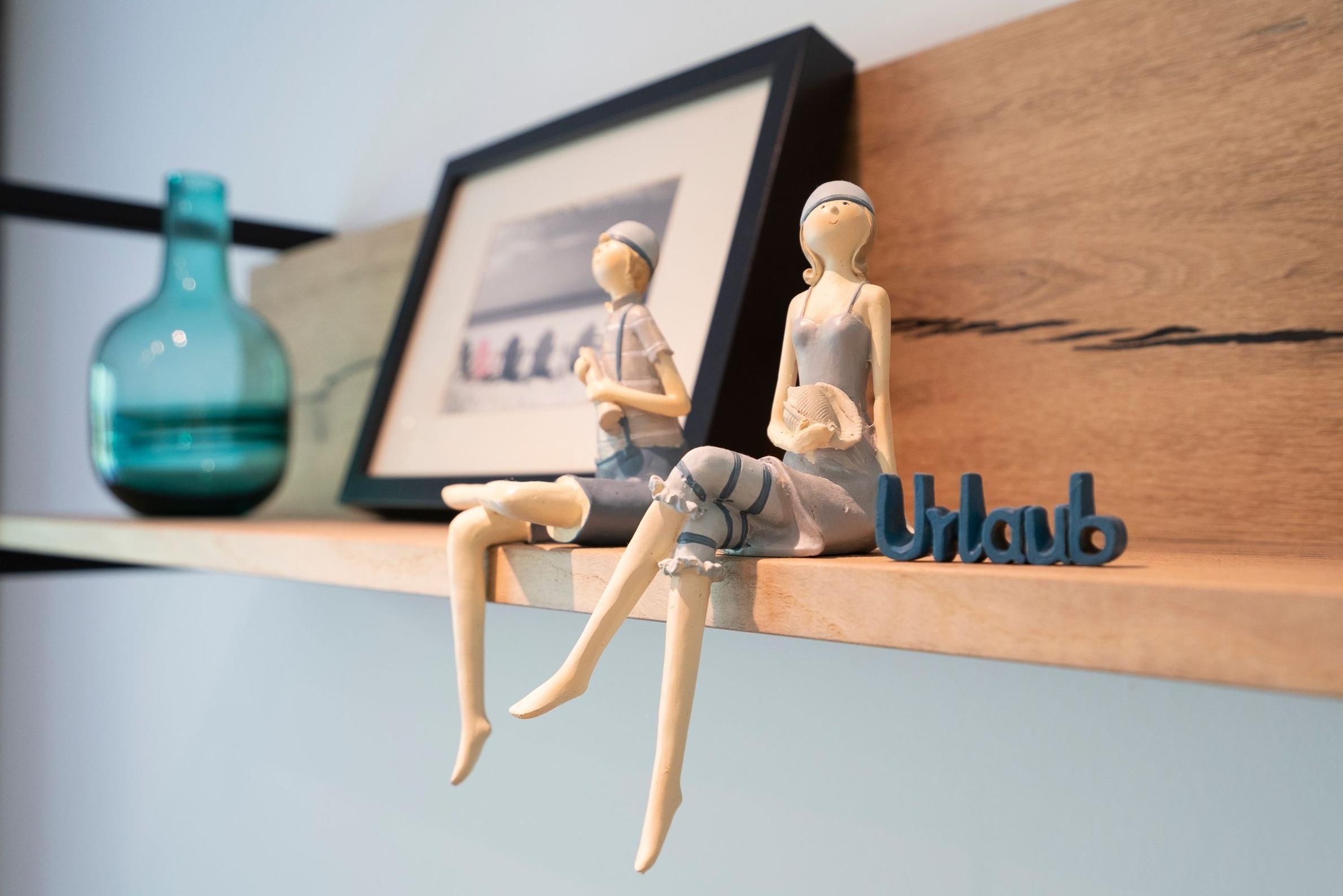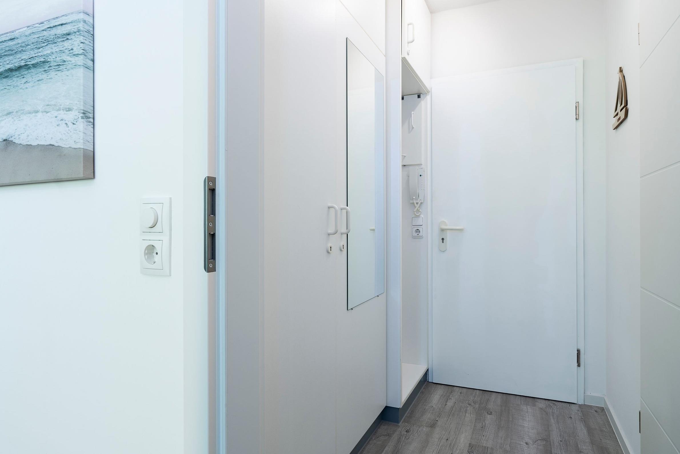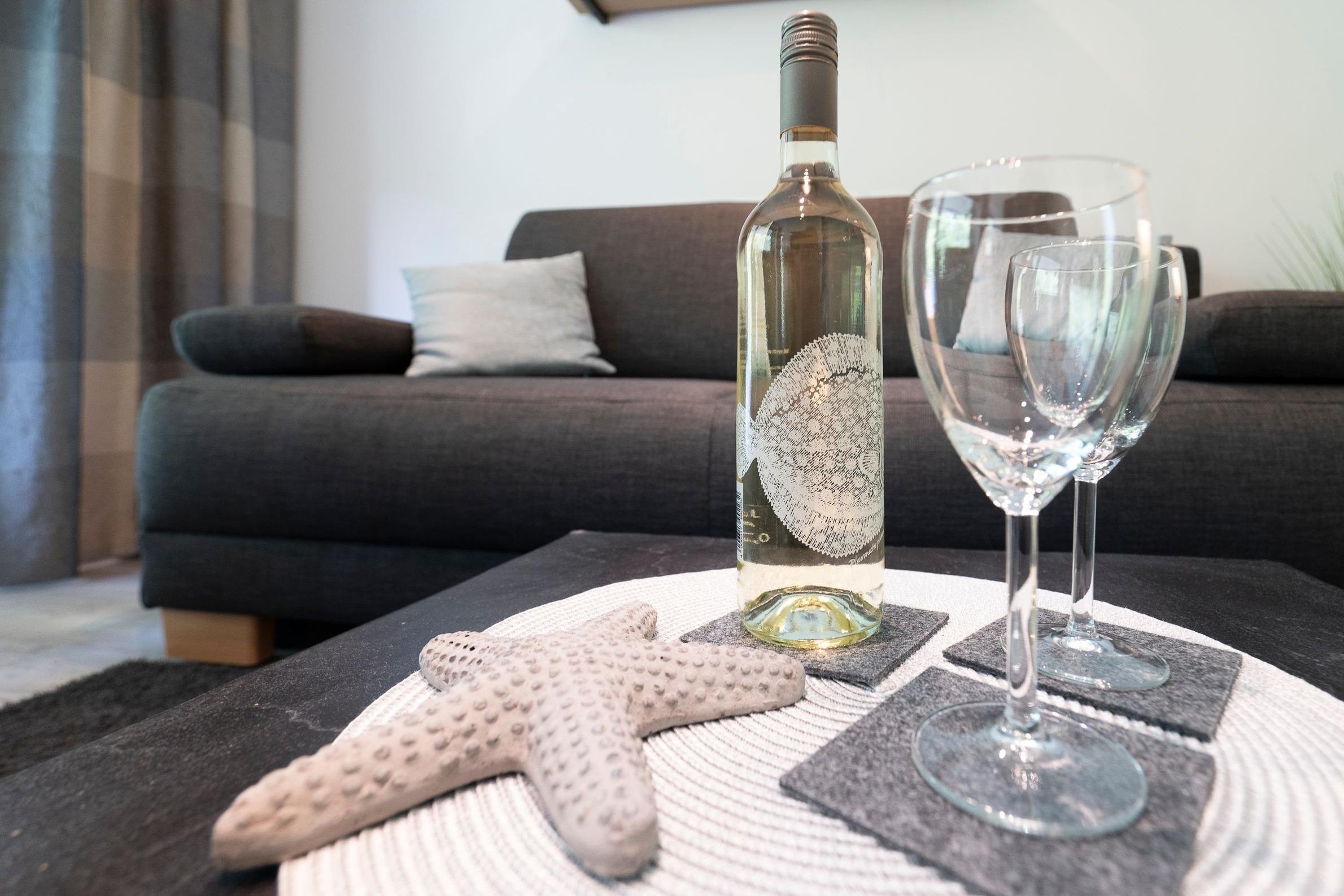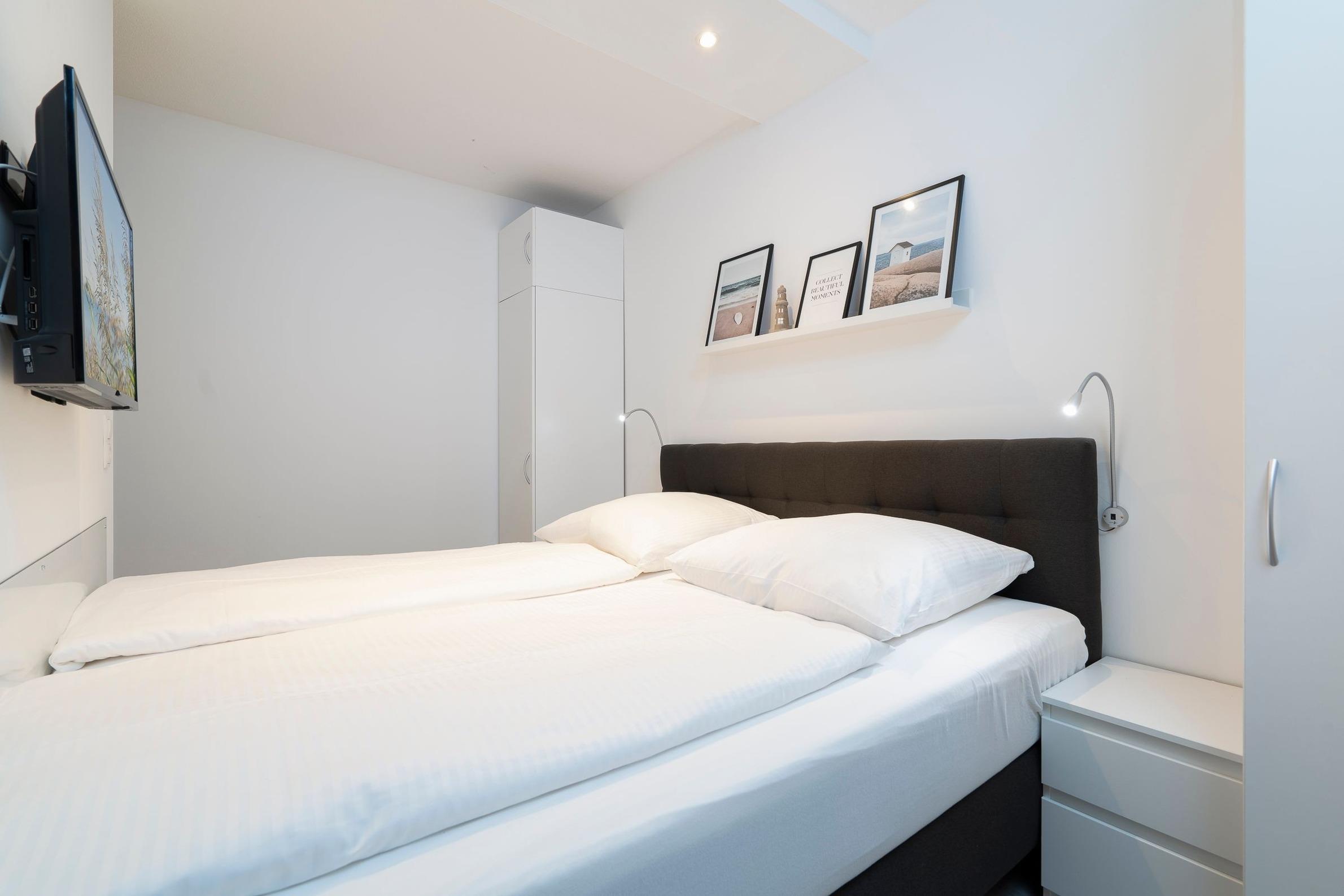 Durch den Flur geradeaus gelangen Sie in den Wohnbereich, der Sie mit einer stilvollen Einrichtung und liebevollen Details begeistern wird. Auf dem komfortablen Sofa können Sie gemütliche Abende vor dem großen Flachbildfernseher verbringen. Der Esstisch für 2 Personen befindet sich direkt am Fenster und lädt zu gemeinsamen Mahlzeiten ein. Vom Wohnbereich räumlich abgetrennt befindet sich der Schlafbereich mit einem Boxspring-Doppelbett (180x200 cm, durchgehende Matratze), einem weiteren Flachbildfernseher, zwei schmalen Kleiderschränken sowie zwei Nachttischen. Plissees sorgen im Wohn- und Schlafbereich für angenehme Verdunkelung in der Nacht. Die offene, gut ausgestattete Küche mit weißen Fronten grenzt an den Wohnbereich. Auf kleinem Raum sind alle notwendigen Küchengeräte wie z. B. ein Backofen, ein Kühlschrank, ein 4-Platten-Cerankochfeld und eine Kaffeemaschine vorhanden. Das innenliegende, hell geflieste Badezimmer verfügt über eine Dusche, ein WC sowie über ein Waschbecken mit Spiegel- und Unterschrank als Stauraum für Ihre Badutensilien. Vom Wohnbereich aus gelangen Sie auf den überdachten, möblierten Balkon. Ein Sicht- und Windschutz sorgt für Privatsphäre und Erholung. Erholen Sie sich dort von einem langen Tag am Strand, von einer großen Fahrradtour oder genießen Sie die Urlaubszeit bei einem guten Buch oder einem Glas Wein.