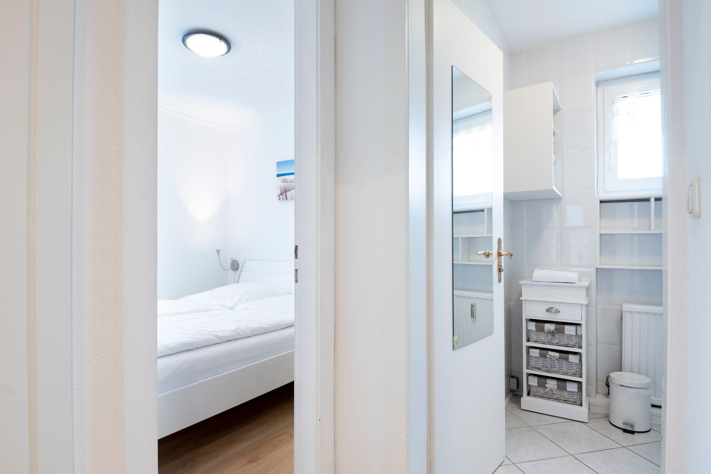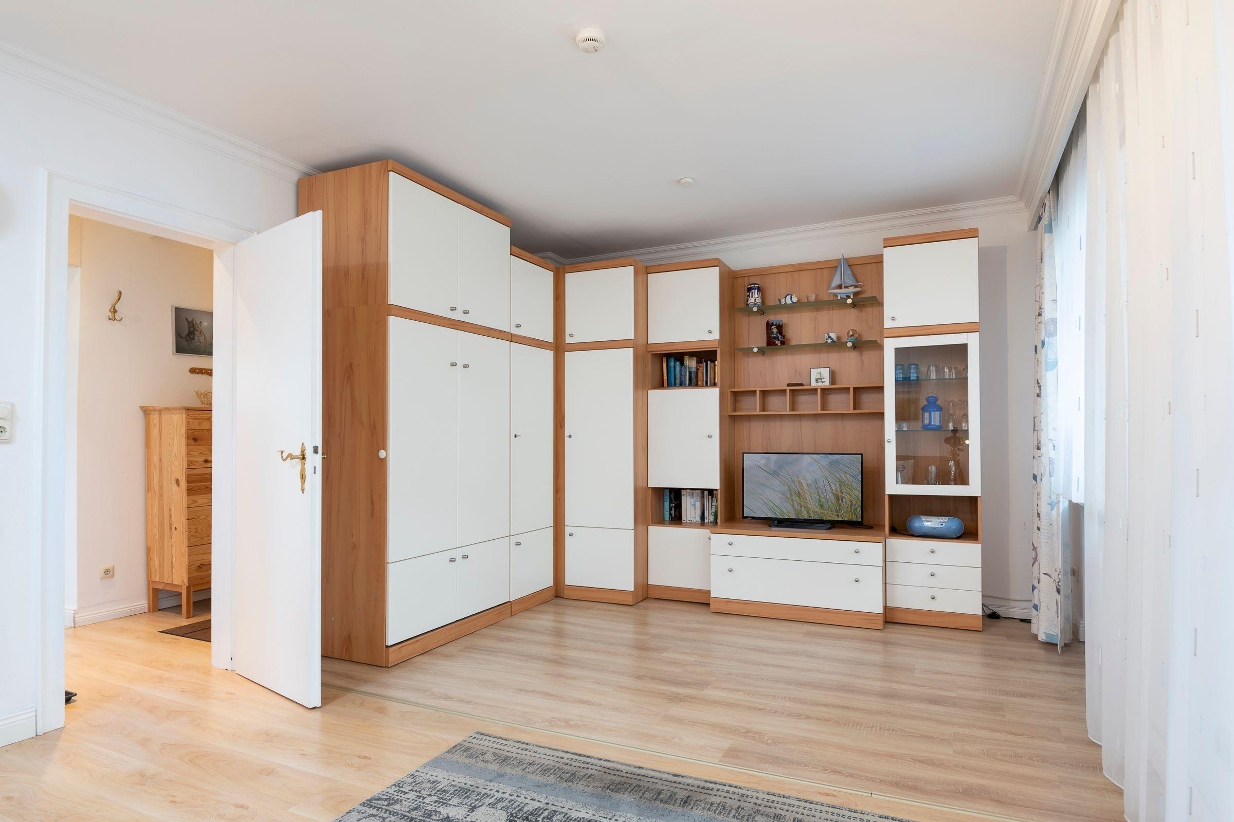 Geradeaus durch den Flur erreichen Sie das Wohnzimmer mit Zugang zum möblierten Balkon. Der gemütliche Wohnbereich verfügt über einen Fernseher, eine Schrankwand mit Schrankbett (80x200 cm) sowie über ein Sofa, welches als weitere Schlafmöglichkeit (140x200 cm) dient. Im separaten Schlafzimmer erwartet Sie ein komfortables Doppelbett (2x 80x200 cm) und ein Kleiderschrank. In der gut ausgestatteten Küche können Sie köstliche Urlaubsmahlzeiten zubereiten und am Esstisch gemeinsam speisen. Das Badezimmer mit Fenster ist hell gefliest und ist mit einer Dusche ausgestattet. Als Highlight steht Ihnen auf dem überdachten Süd-Balkon ein Strandkorb zur Verfügung.