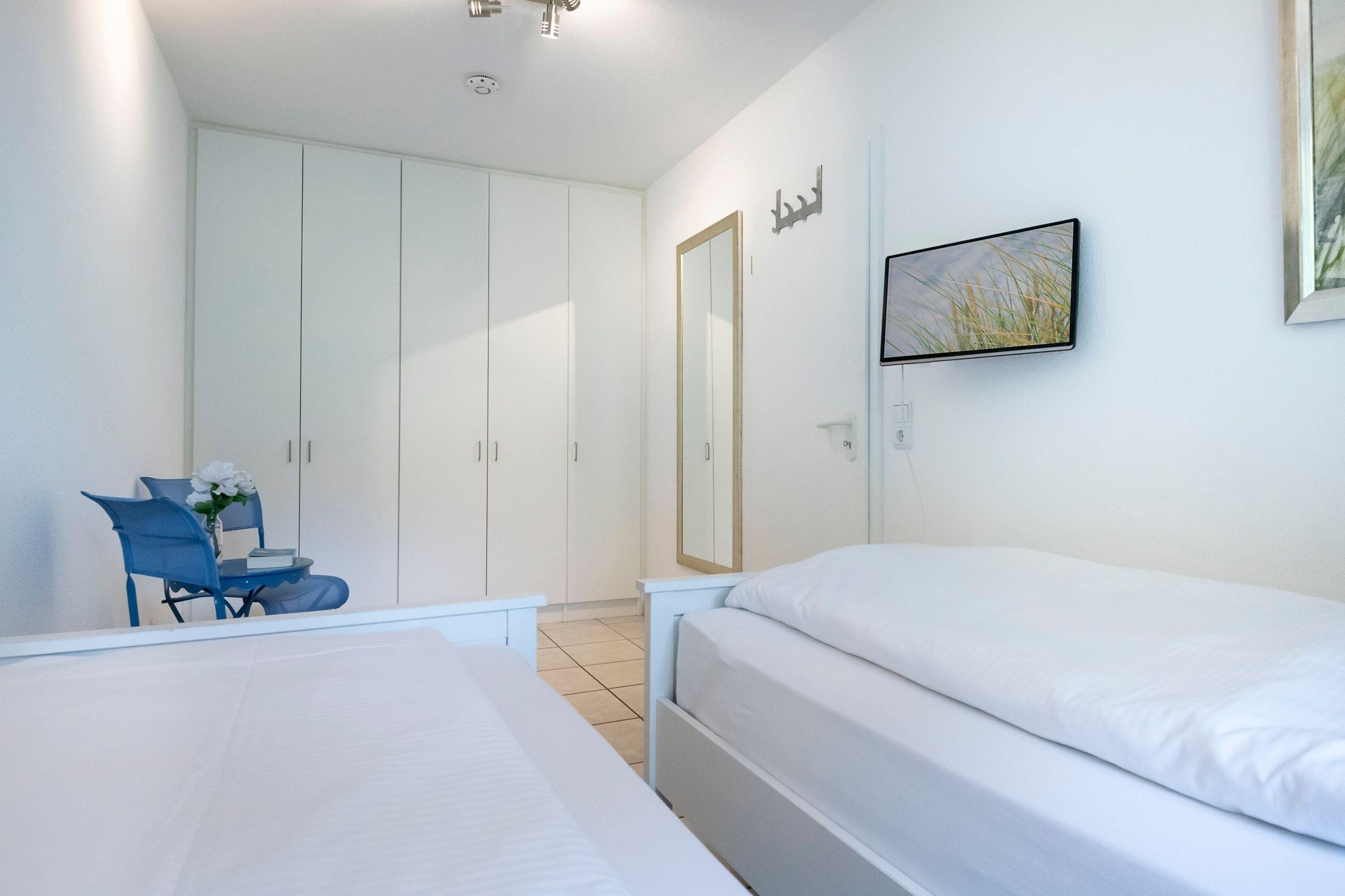 Schlafzimmer: 2 Einzelbetten (je 90x200 cm), TV, Kleiderschrank, Verdunkelungsgardinen