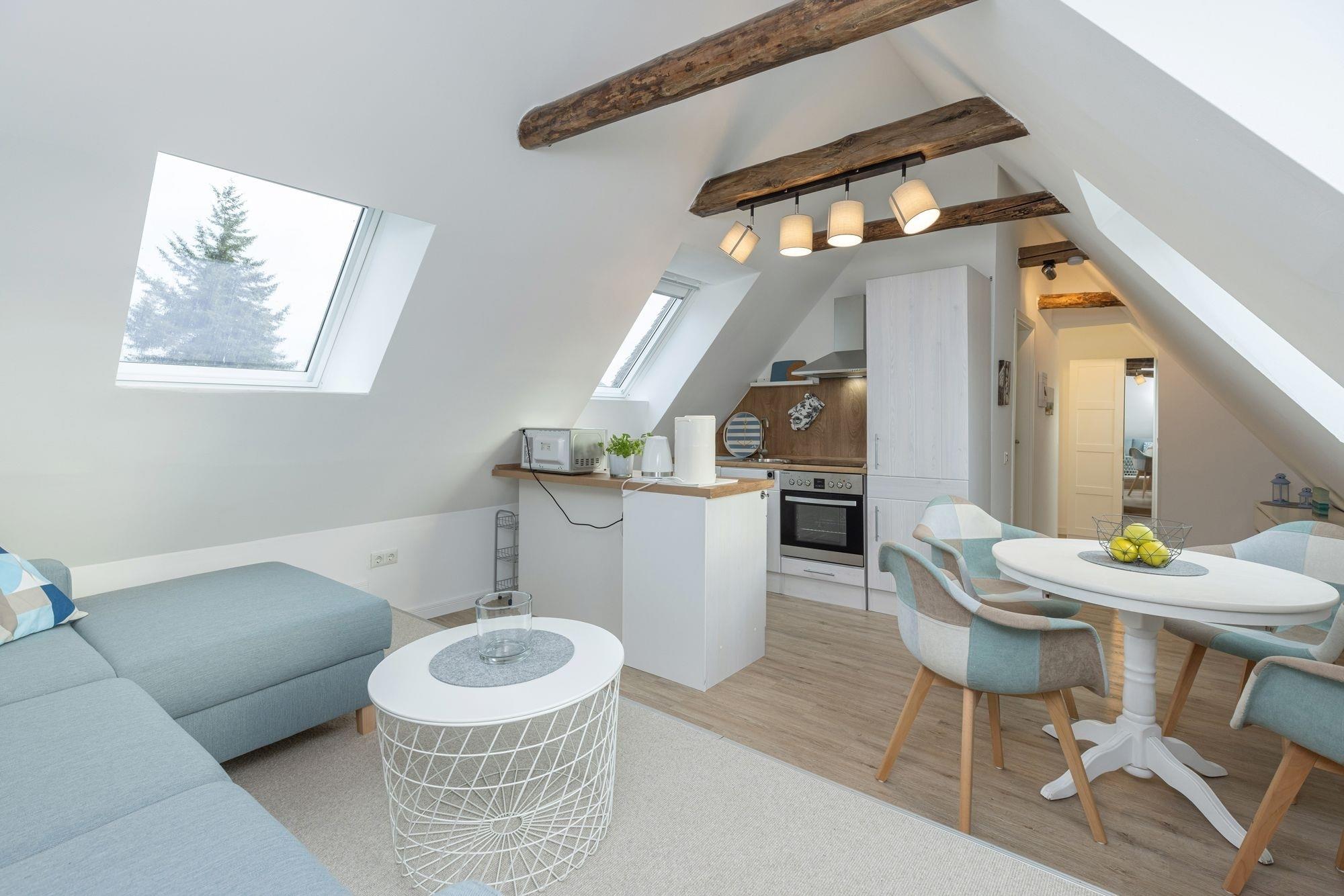 Modern und liebevoll eingerichtet empfängt Sie diese 2-Zimmer-Ferienwohnung mit bis zu 3 Personen. Dachschrägen, Balken an der Decke und Stufen von Raum zu Raum verleihen dieser Wohnung Gemütlichkeit und einen ganz eigenen Charme.