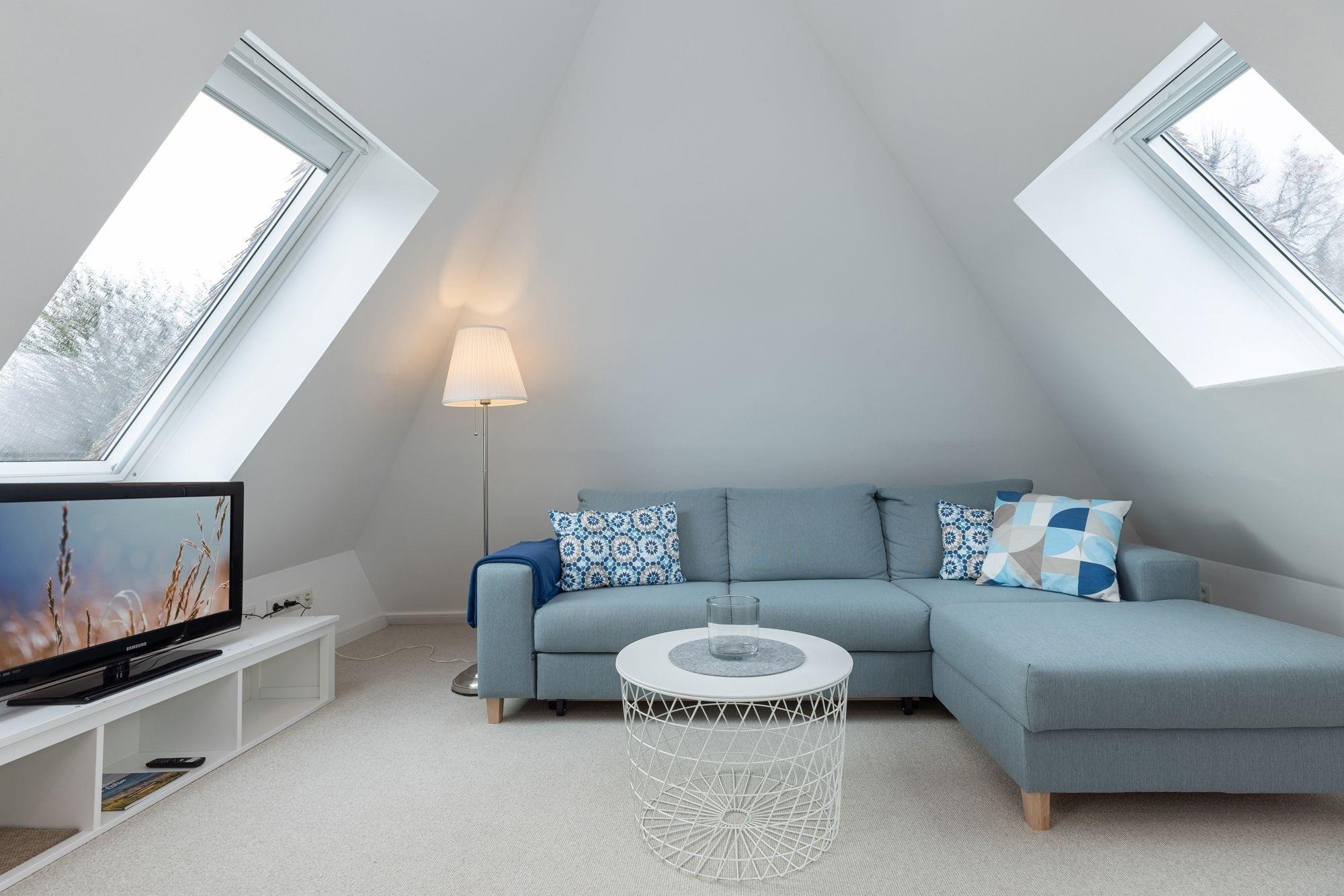 Über eine Treppe im gemeinschaftlichen Hausflur gelangen Sie in das 1. Obergeschoss zu Ihrer Wohnung mit ca. 46 m² Wohnfläche. Zur Linken befinden sich beide Schlafzimmer. Ein Schlafzimmer ist zum Flur hin offen und erwartet Sie mit einem Boxspring-Doppelbett (180x200 cm) und einem kleinen, offenen Einbauschrank. Das 2. Schlafzimmer erwartet Sie ebenfalls mit einem Boxspringbett (140x200 cm), welches in einer Koje unter den Dachschrägen liegt. Beide Schlafzimmer lassen sich mit Rollos angenehm verdunkeln. Vom Flur aus zur Rechten befindet sich der Wohnbereich mit offener Küche sowie das Duschbad. Der Wohnbereich ist mit einem Ecksofa, einem Fernseher und einem runden Esstisch ausgestattet. Die gut ausgestattete Küche grenzt offen an den Wohnbereich und sorgt mit vielen Küchengeräten und -utensilien für Freude am Kochen. Das Duschbad mit Fenster hält Annehmlichkeiten wie z. B. einen beheizbaren Handtuchhalter und ausreichend Stauraum für Sie bereit. Erholen Sie sich bei einem guten Buch oder einer Tasse Kaffee auf der eigenen, kleinen Terrasse am Haus oder verbringen Sie die Zeit im Gemeinschaftsgarten.