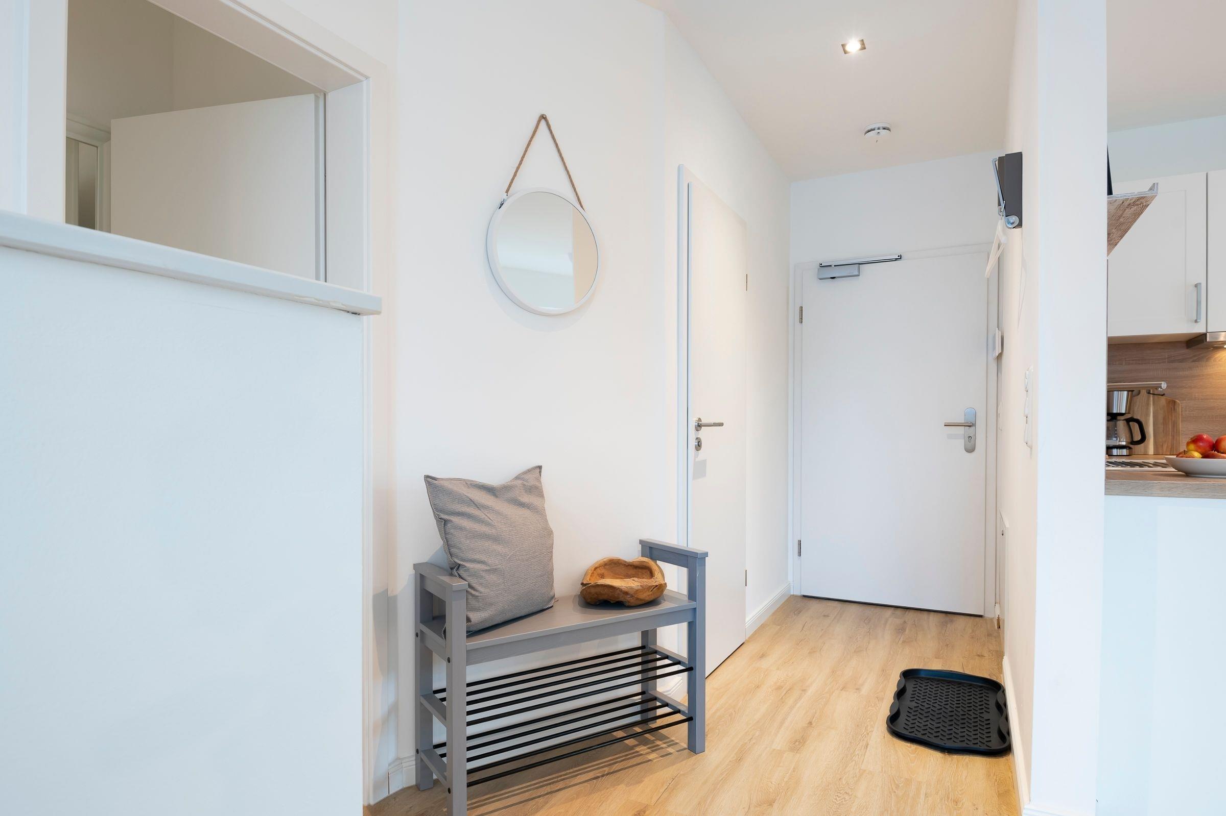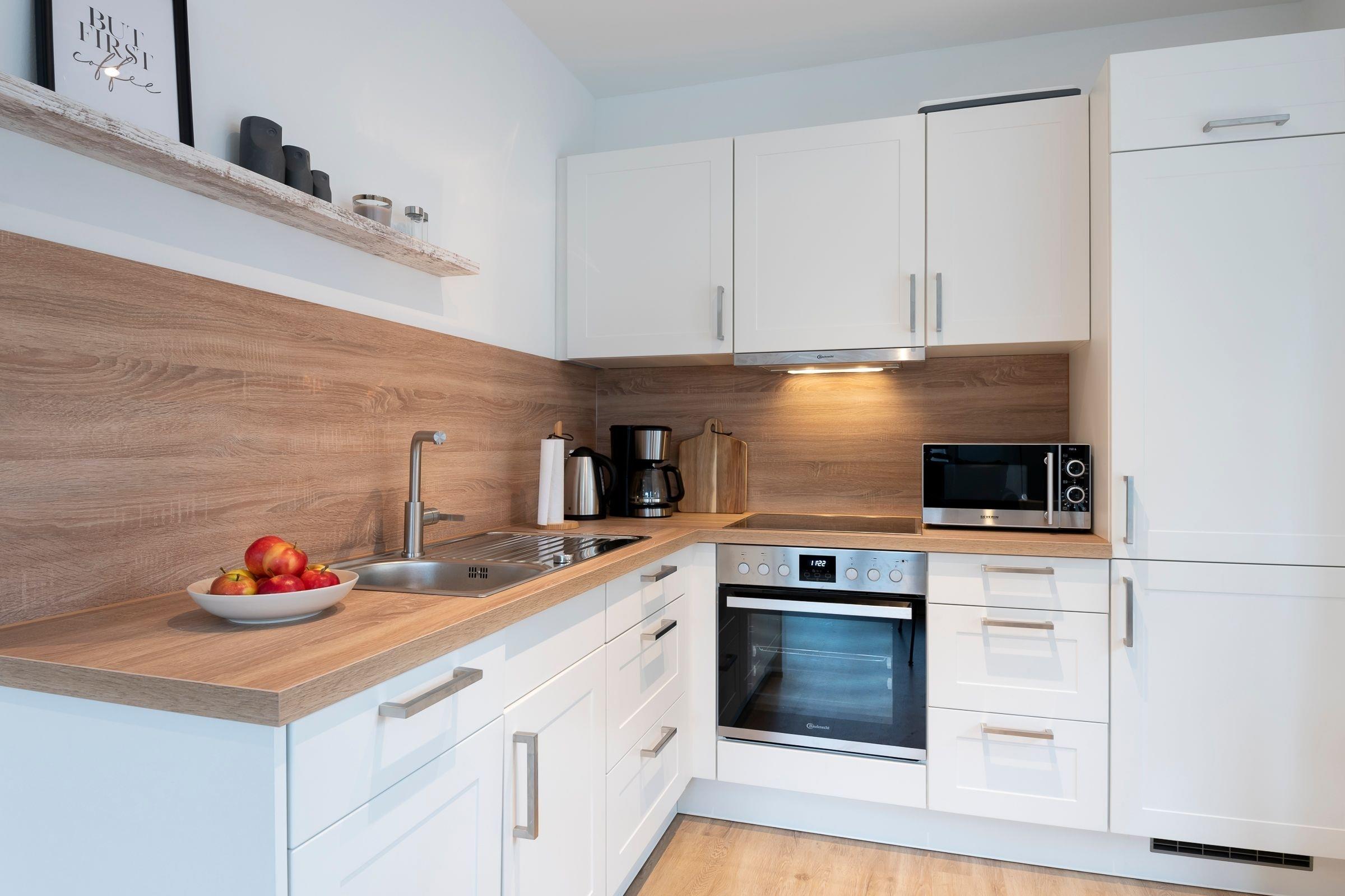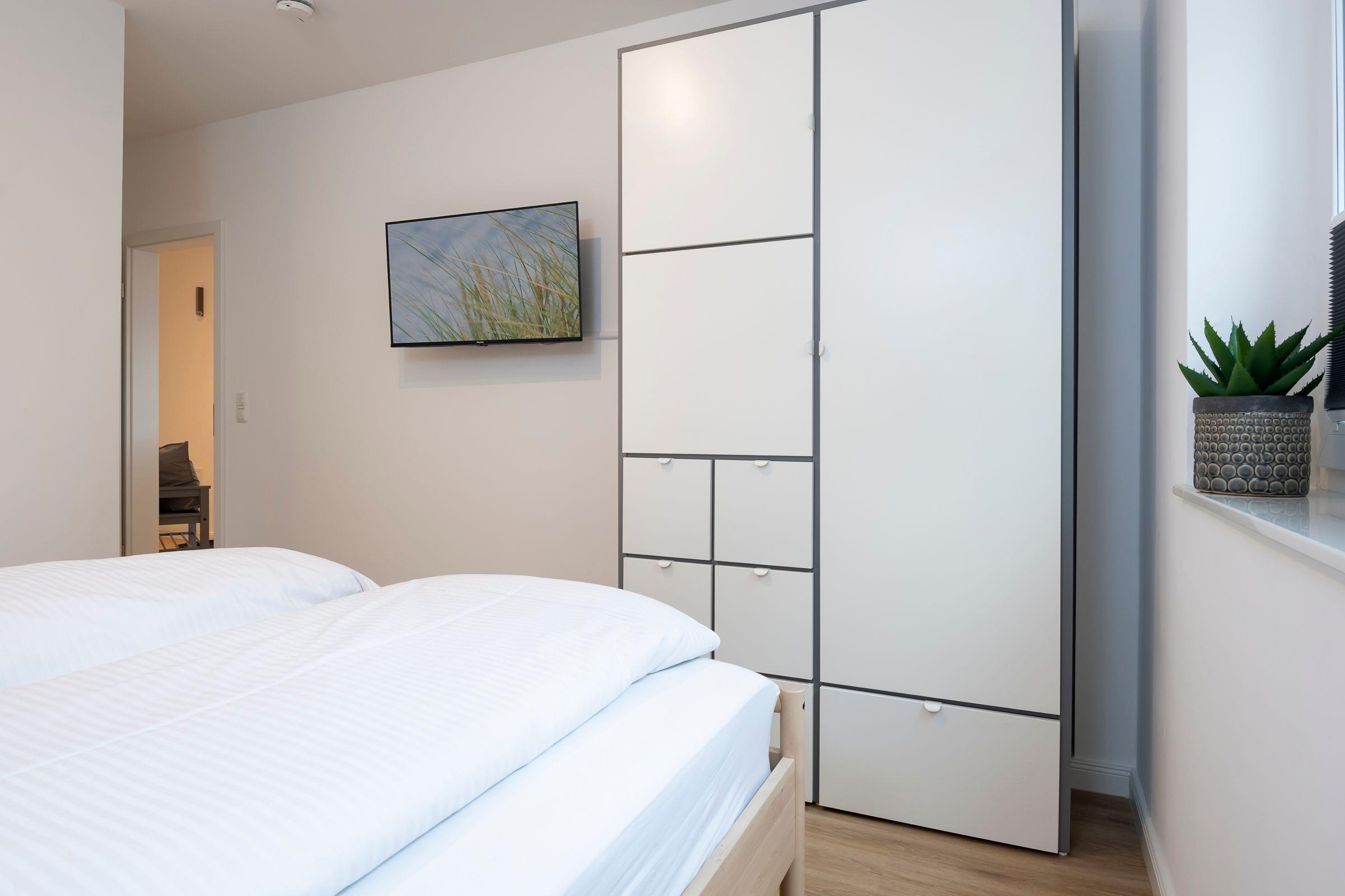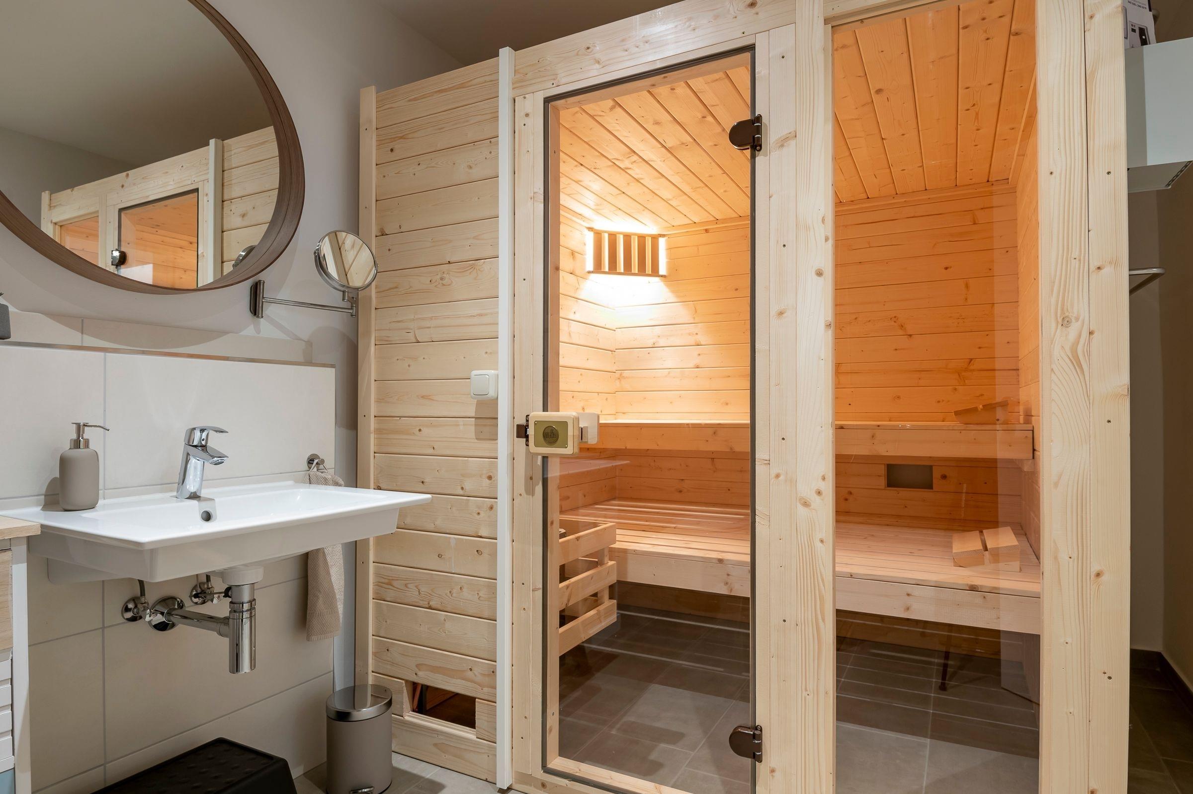Geradeaus durch den hell und freundlich gestalteten Flur mit Garderobe erreichen Sie das Herzstück dieser Wohnung: den kombinierten Wohn- und Essbereich mit Zugang zum großen, teilüberdachten Balkon mit Süd-West-Ausrichtung. Im Wohnbereich erwartet Sie ein gemütliches Sofa (Liegefläche 140x200 cm), ein Sessel sowie ein Flachbildfernseher. Entspannten Abenden steht hier nichts im Wege! Die angrenzende, offene Küche ist voll ausgestattet und lädt am runden Esstisch zu gemeinsamen Mahlzeiten ein. Das separate Schlafzimmer mit Doppelbett (2x 90x200 cm) ist mit einem Kleiderschrank und einem Fernseher ausgestattet. Auf dieser Ebene befindet sich ein Badezimmer mit WC, Dusche und Waschtisch. Im Souterrain erwartet Sie ein weiteres Zimmer als Rückzugsort mit Sofa, Kleiderschrank und Fernseher. Ein großzügiges Badezimmer mit WC und bodengleicher Dusche sowie eine eigene Sauna (1€ / 20 Minuten) und ein angrenzender Ruheraum mit gemütlichen Schaukelstühlen erwarten Sie ebenfalls im Souterrain.